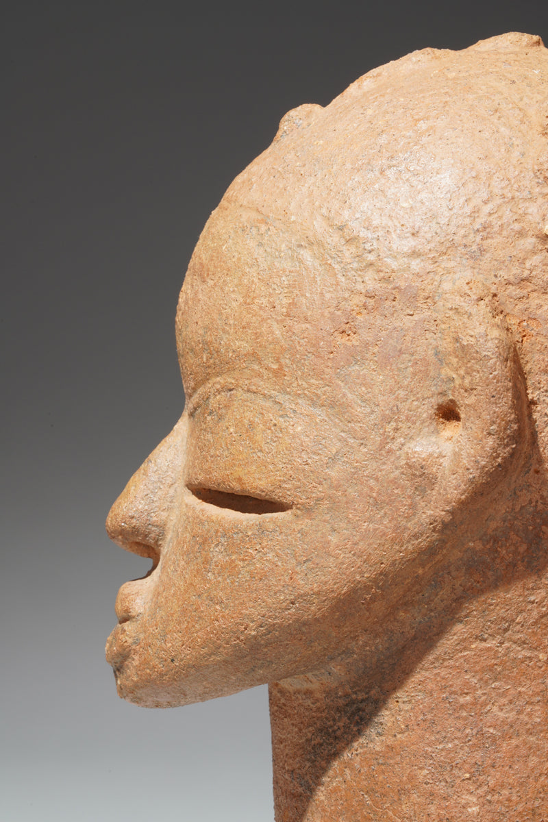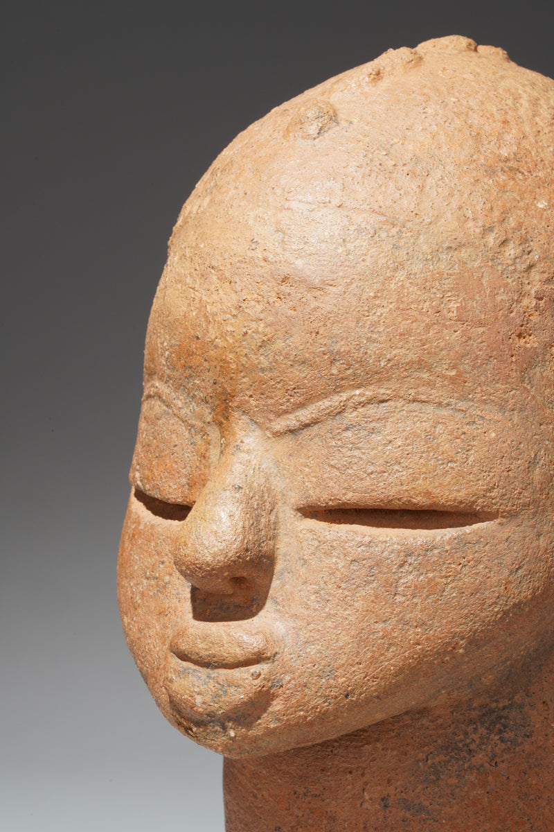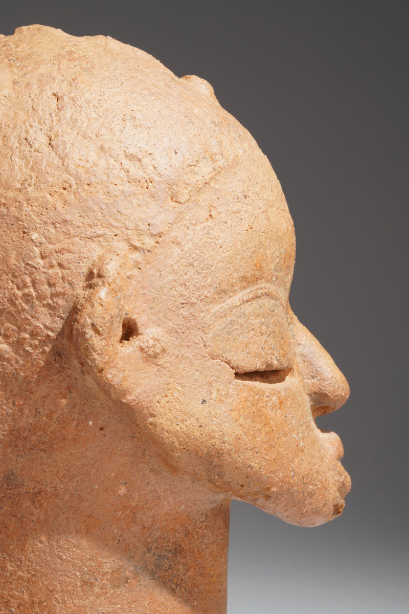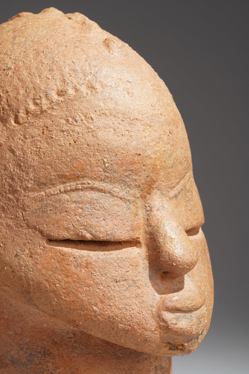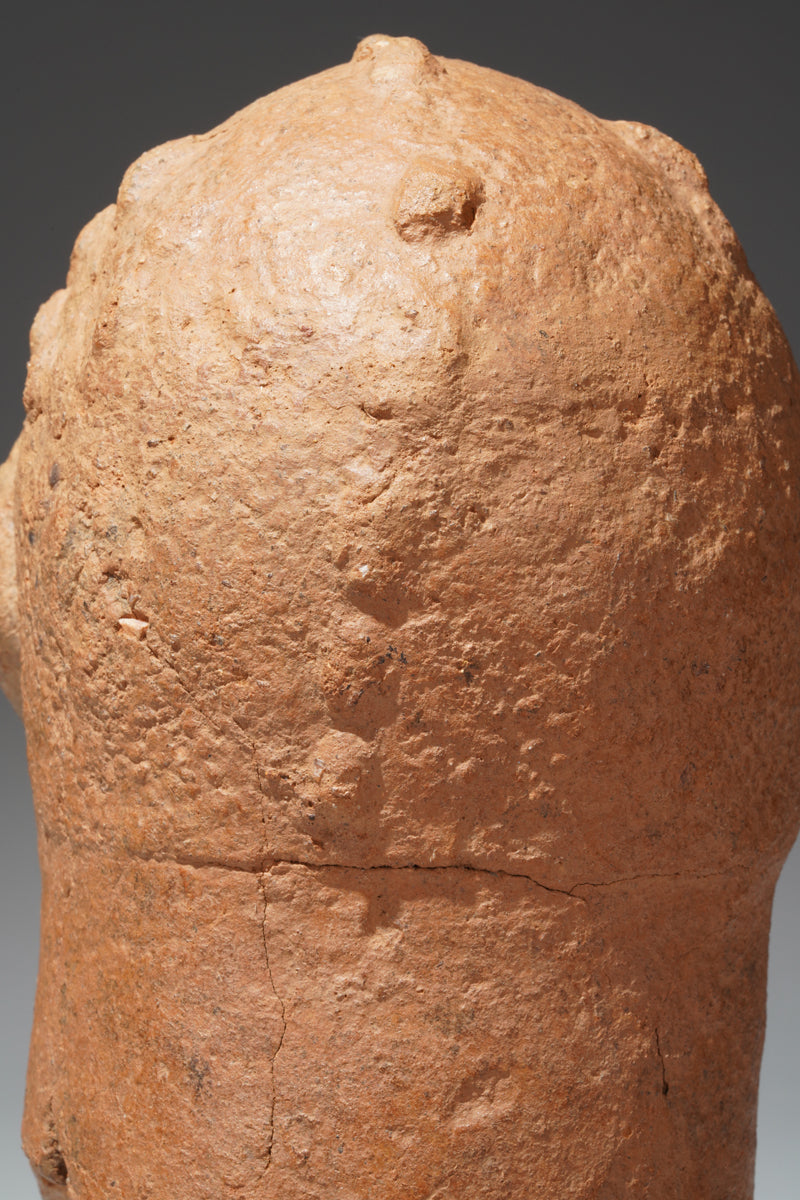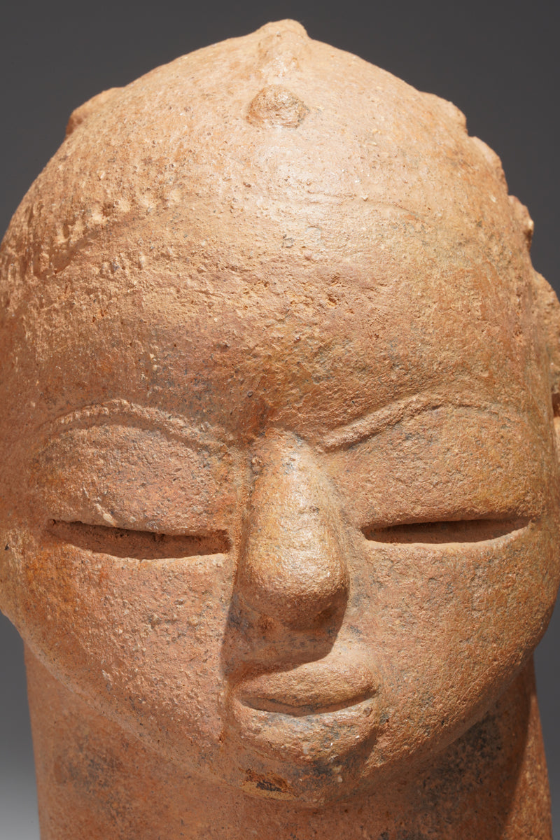 A fragmentary terracotta head in the Katsina style, Nigeria with a small face, long horizontal slits for eyes with eyebrow carvings over them, a small nose and narrow round mouth; the ears are carved high and the head has small protrusions for coiffure. Certificate of origin and provenance.