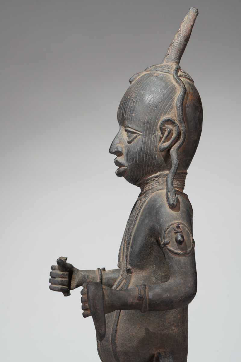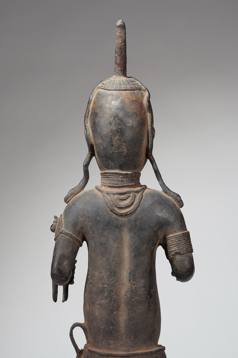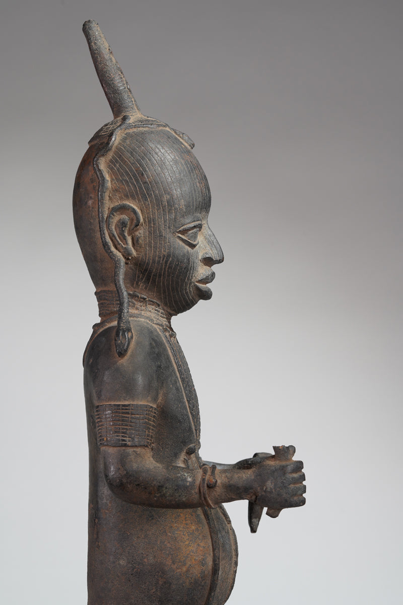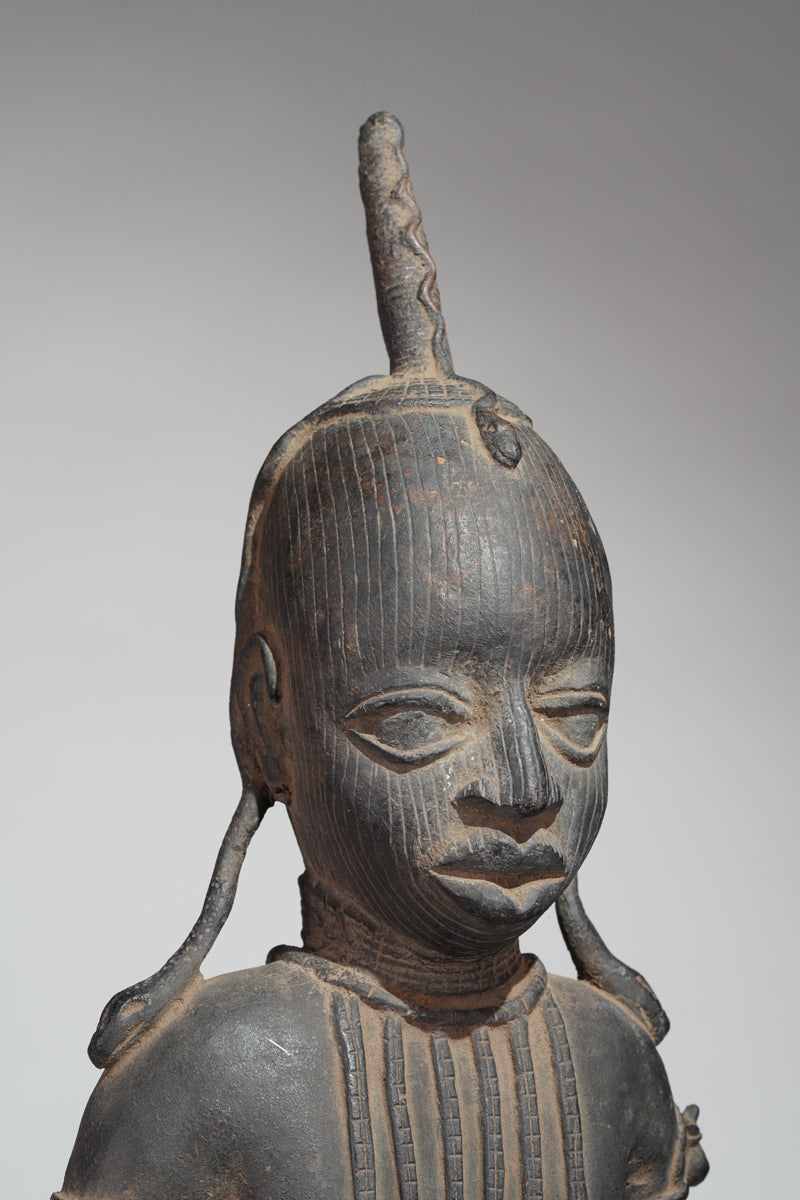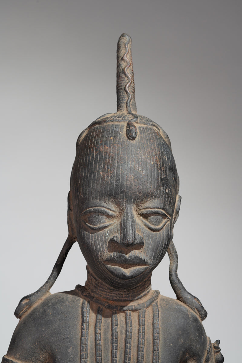The so-called Udo style represents a regional and stylistic variant within the artistic traditions of the Benin Kingdom and is named after the town of Udo near Benin City. This style is characterized by a less rigid and formalistic approach compared to classical Benin bronze art. Instead, the Udo style emphasizes more expressive and naturalistic elements, which may indicate either an earlier developmental phase or a distinct local tradition within the Benin artistic system.