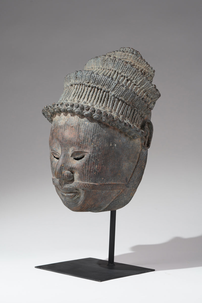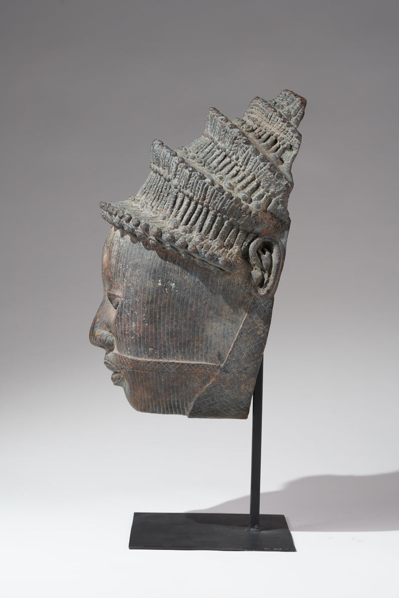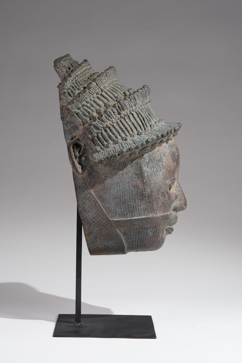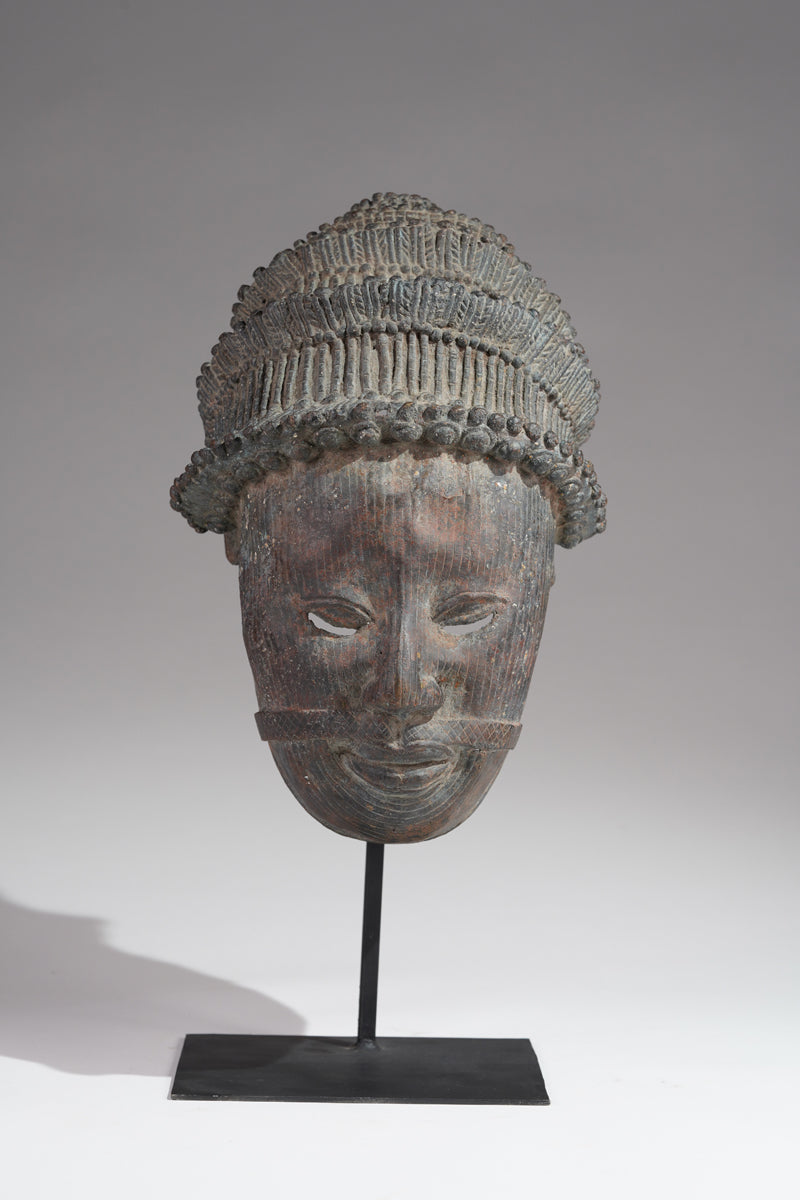 A (funeral) mask with the crown of an Oni (Oba) in the style of Ife, the striking feature of this "mask" is its naturalism. It resembles a real portrait of a human being and yet the expression is idealized. It seems that one did not try to portray a particular human being with all sorts of things, but tried to portray the human being as he appeared or should live on in his memory (Frank Willet). Thinwalled and encrusted multi-layered patina, see magnifications at the end of the photo-sequence. incl. stand