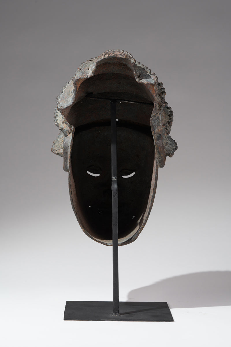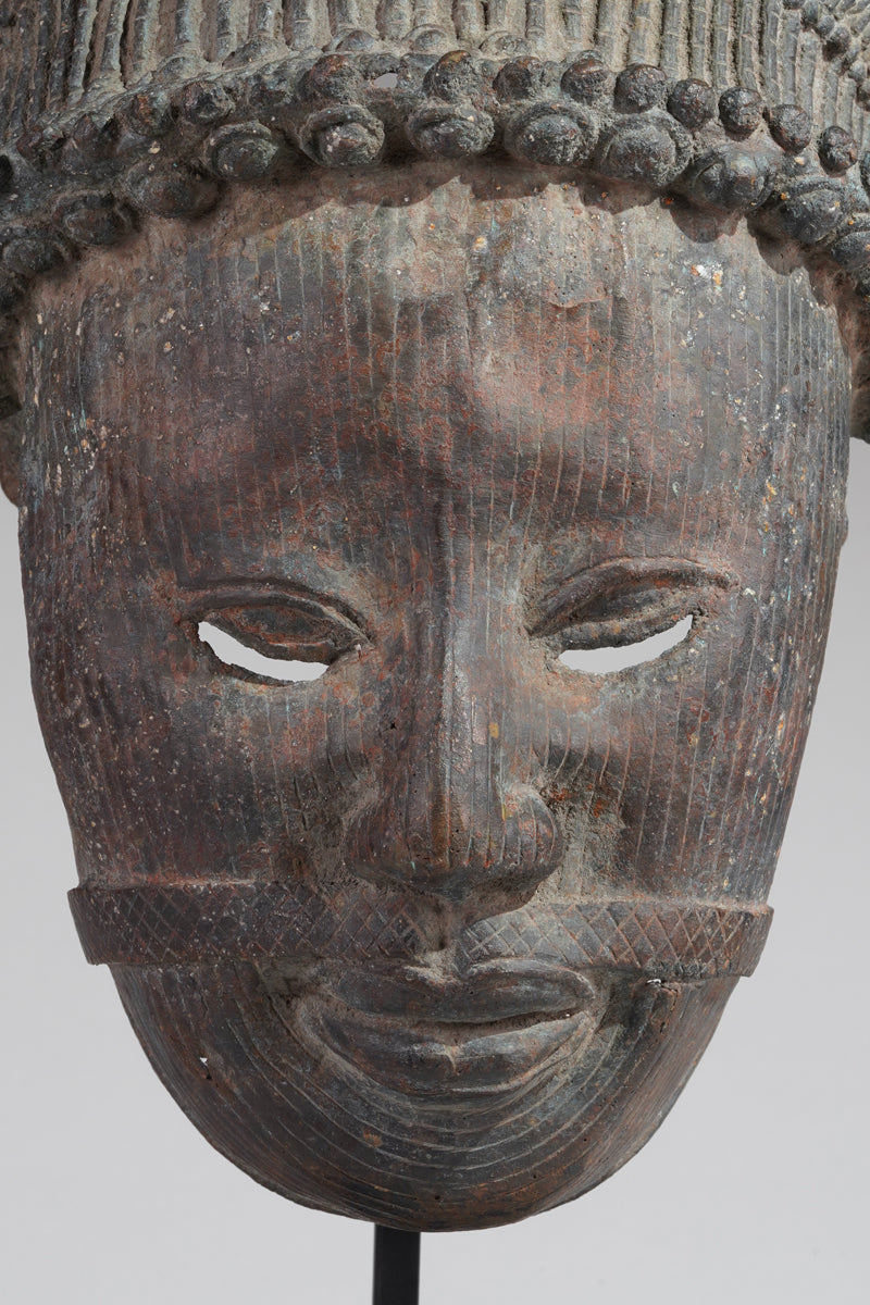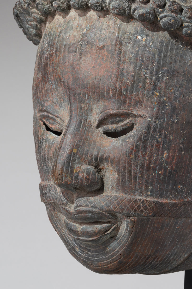 The mask probably looked different than pictured here. Hair, a beard, pearls and headdress probably hung from the holes on the forehead and around the mouth. However, the earlier appearance and the exact identification can not be reconstructed. Normally it is assumed that such masks represent a king of Ife (an oni). And indeed, Ife expert Frank Willett has assumed that a very similar object is a portrait of Obalufons II, the third Oni of Ife, to whom the inauguration of the tradition of cast bronze is attributed.