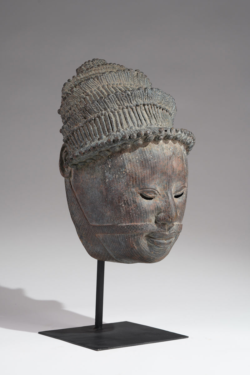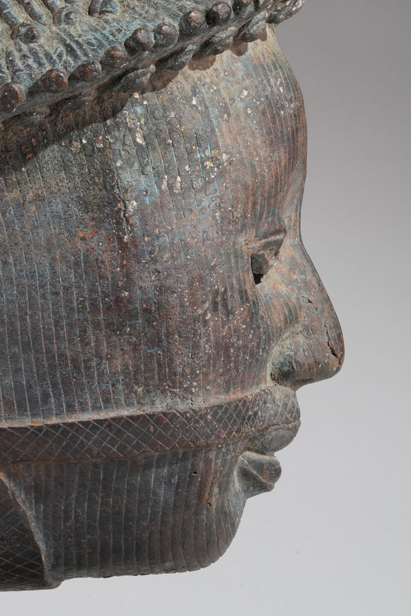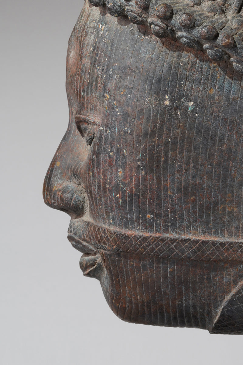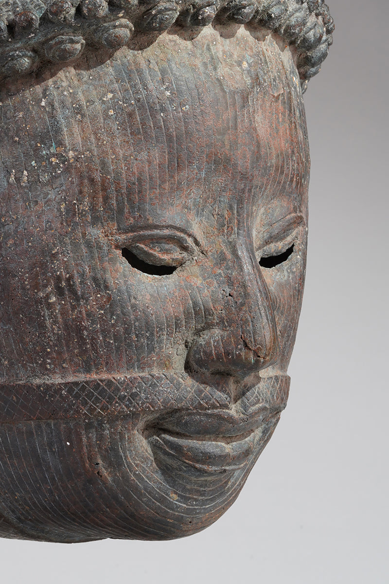 The mask probably looked different than pictured here. Hair, a beard, pearls and headdress probably hung from the holes on the forehead and around the mouth. However, the earlier appearance and the exact identification can not be reconstructed. Normally it is assumed that such masks represent a king of Ife (an oni). And indeed, Ife expert Frank Willett has assumed that a very similar object is a portrait of Obalufons II, the third Oni of Ife, to whom the inauguration of the tradition of cast bronze is attributed.