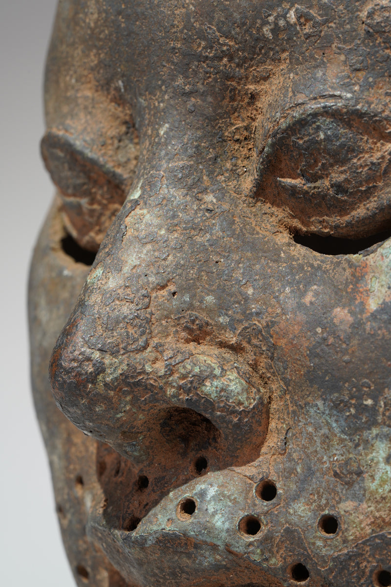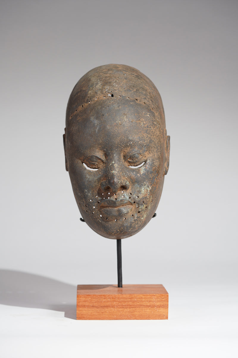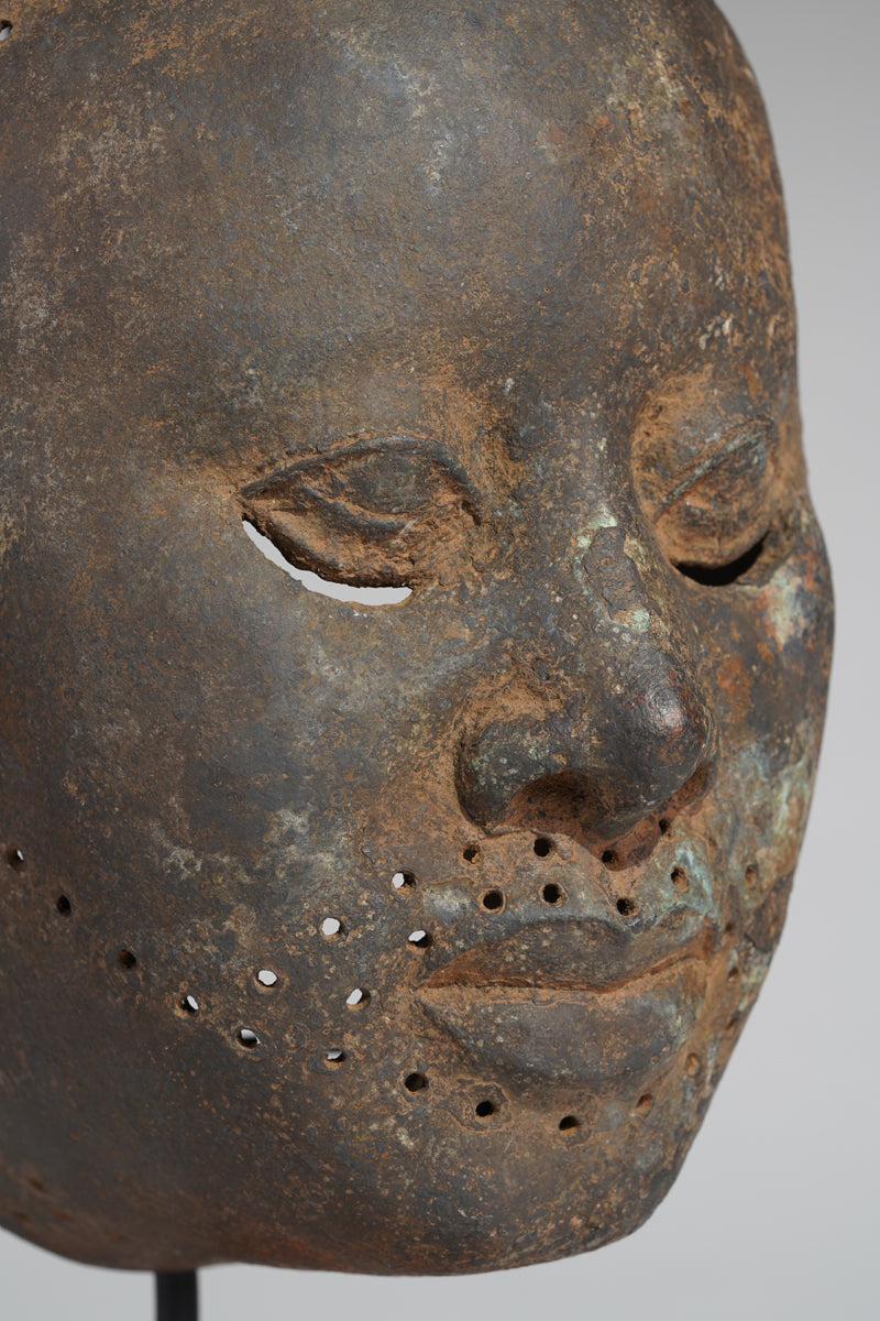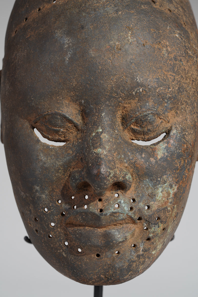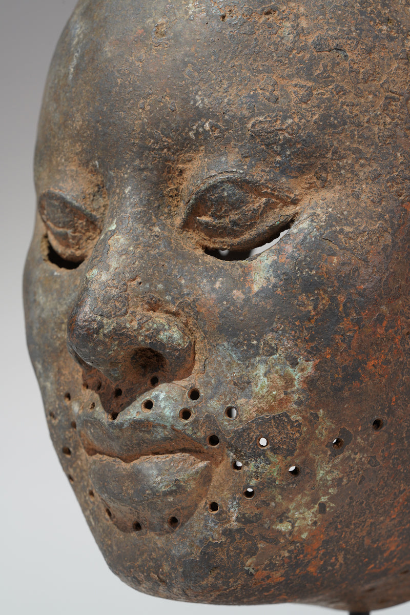The mask probably looked different than pictured here. Hair, a beard, pearls and headdress probably hung from the holes on the forehead and around the mouth. However, the earlier appearance and the exact identification can not be reconstructed. Normally, it is assumed that such masks represent a king of Ife (an oni). And indeed, Ife expert Frank Willett has assumed that a very similar object is a portrait of Obalufons II, the third Oni of Ife, to whom the inauguration of the tradition of cast bronze is attributed.
