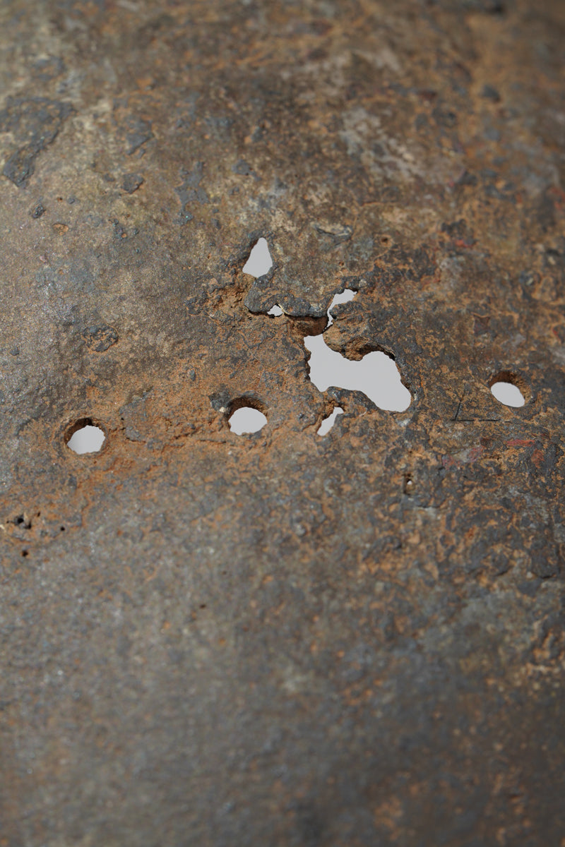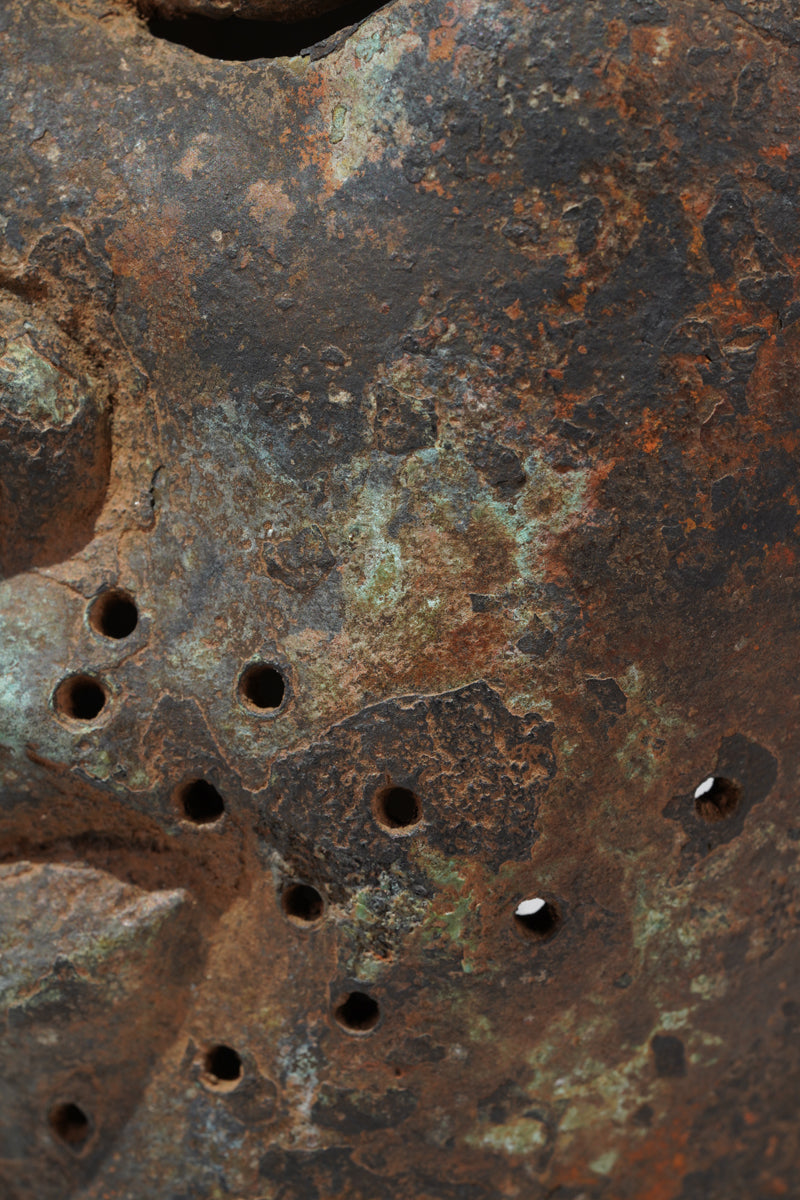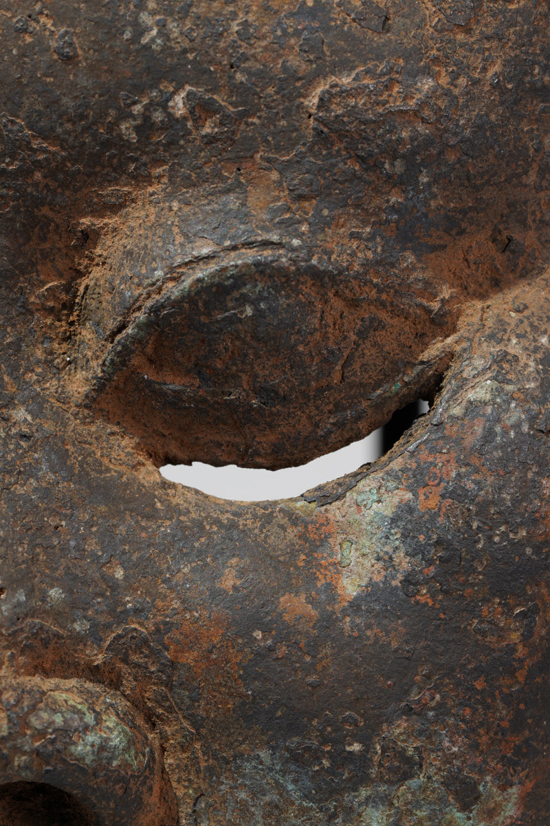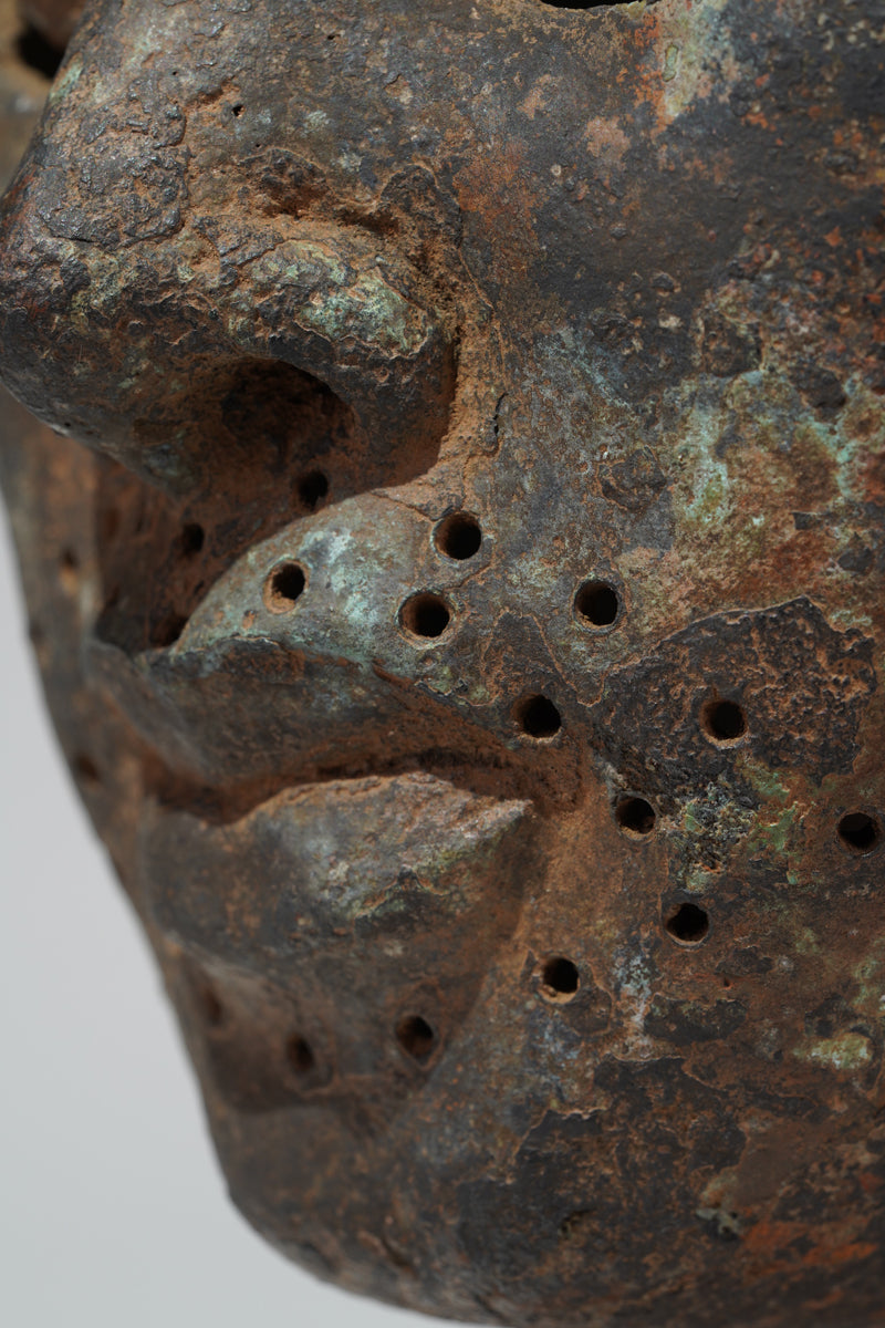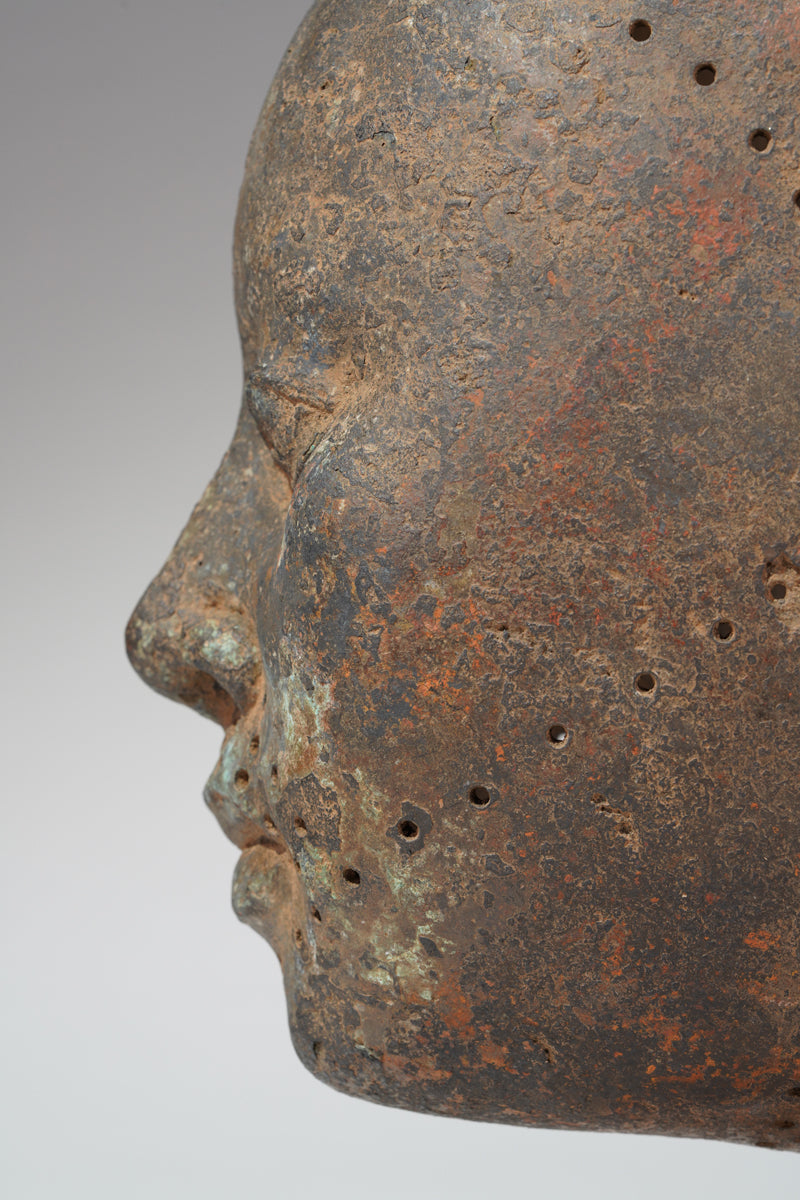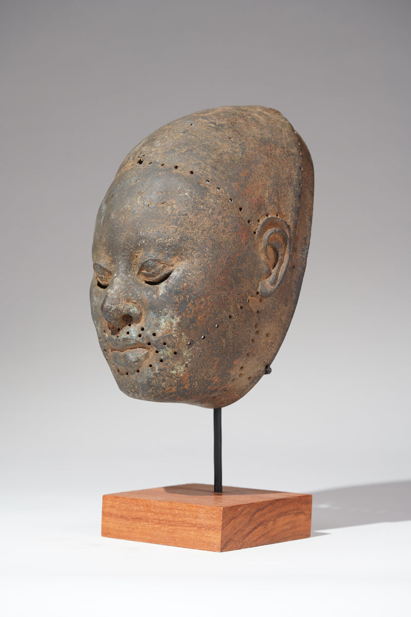 The mask probably looked different than pictured here. Hair, a beard, pearls and headdress probably hung from the holes on the forehead and around the mouth. However, the earlier appearance and the exact identification can not be reconstructed. Normally, it is assumed that such masks represent a king of Ife (an oni). And indeed, Ife expert Frank Willett has assumed that a very similar object is a portrait of Obalufons II, the third Oni of Ife, to whom the inauguration of the tradition of cast bronze is attributed.