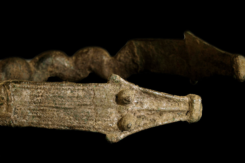 A Gan necklace with two heads of a serpent; burial object, found in the region of Banfora, remnants of encrusted earth on intensive oxidised greenish patina.