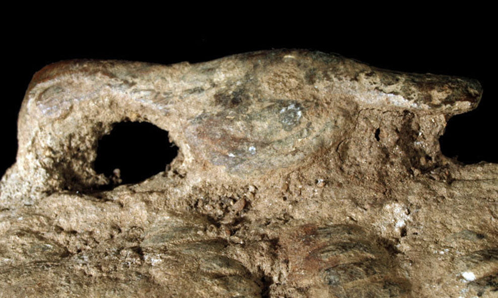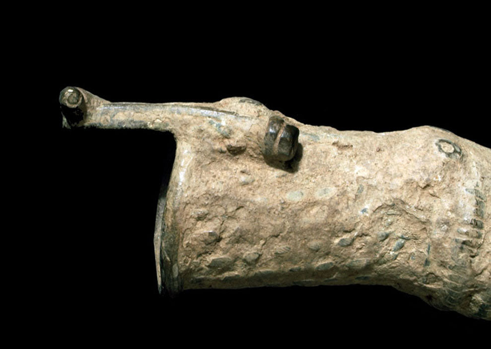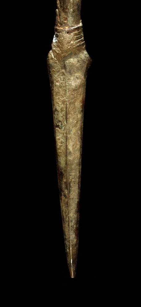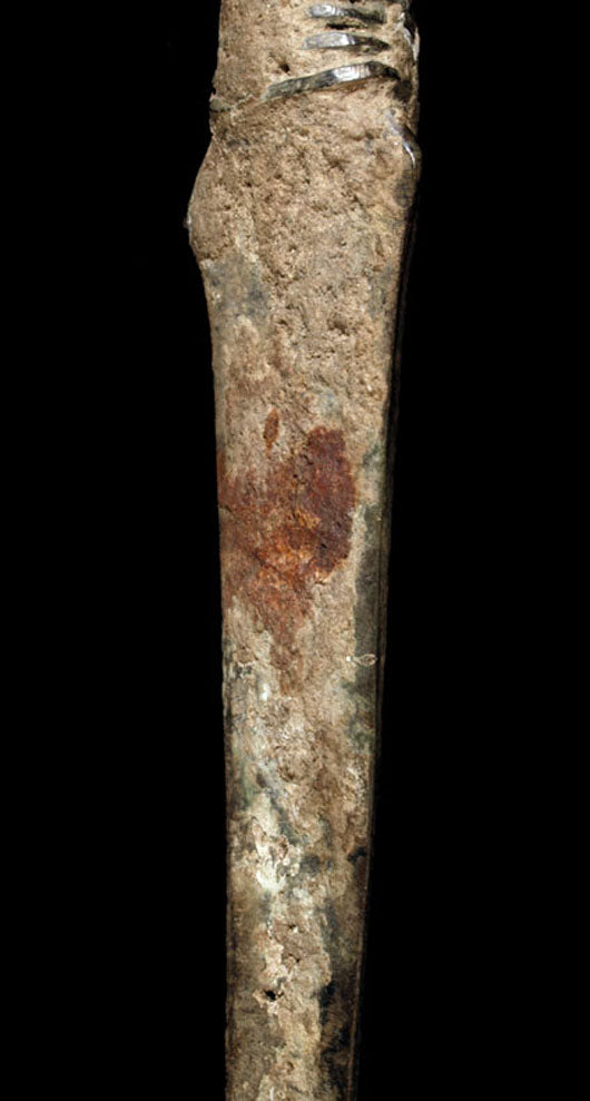 A Gan or Kulango bronze in the shape of a serpent with an open snout, based on a sword-like staff, the bent, striated body decorated with two ducks, the open pharynx with a spiny iron pickle; remnants of earth and aged oxidation.