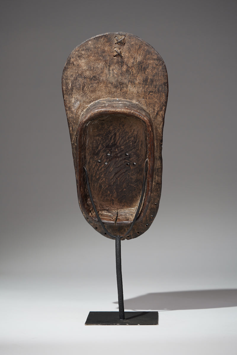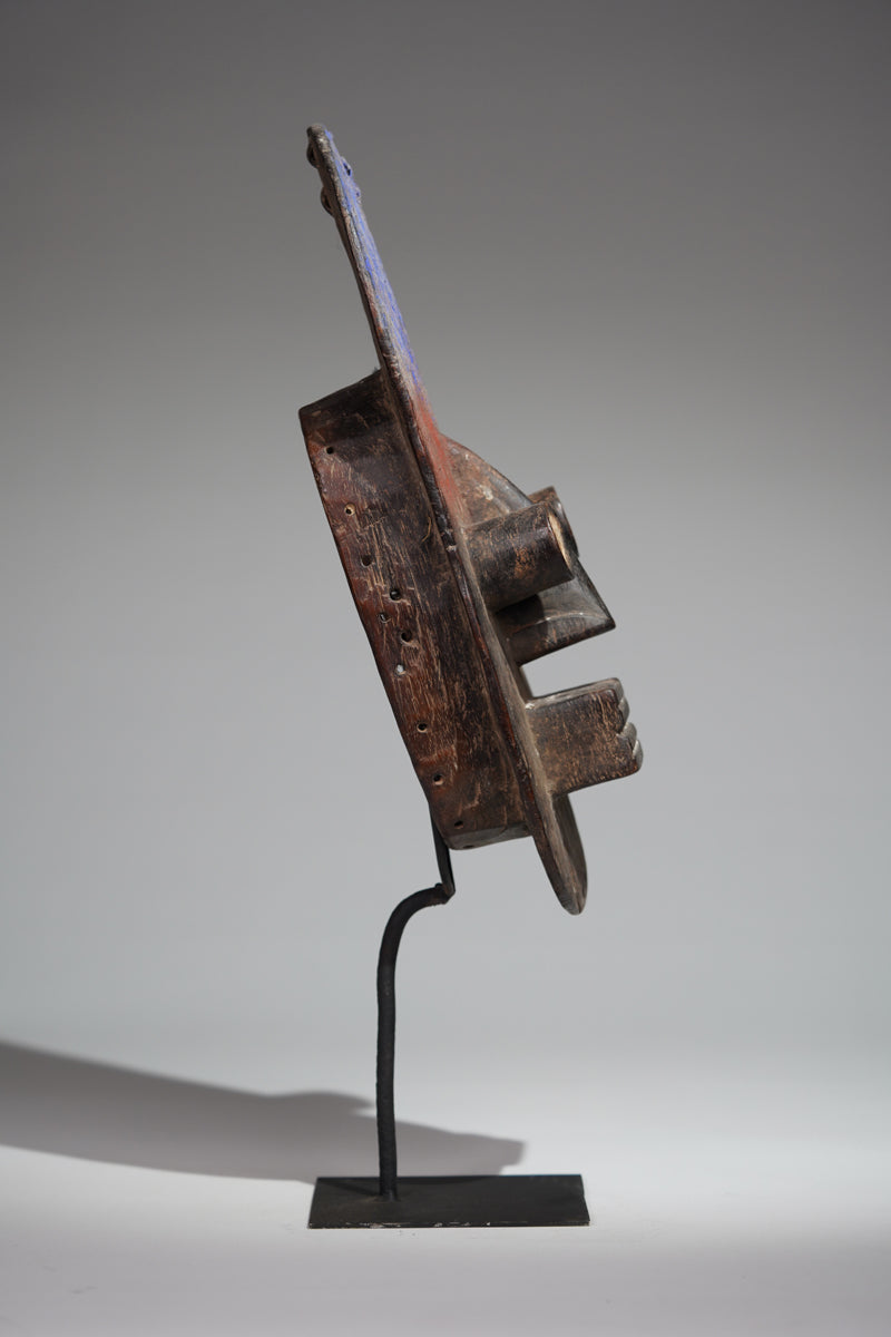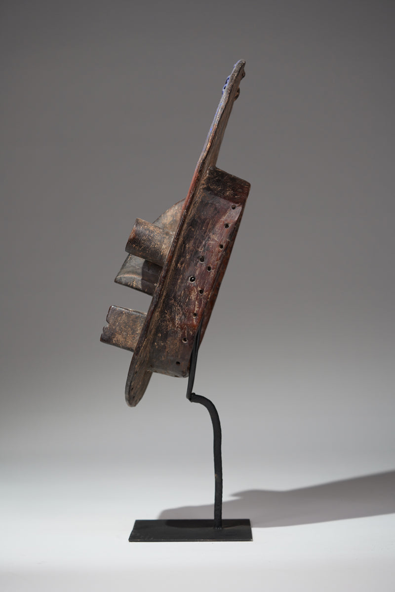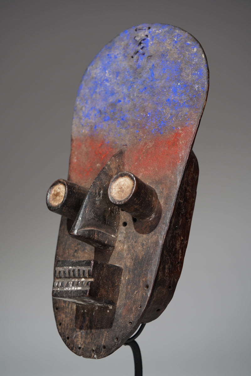 "The masks of the Grebo people are among the most formidable and abstract in West African art. Characterized by their bold forms, with prominent, tubular eyes and sharp, angular features, these masks were designed to project power and instill fear. The protruding eyes symbolize vigilance and the ability to see both the physical and spiritual realms. Often painted in stark contrasts of red, white, and black, the masks were worn by warriors and during ceremonies to invoke protective spirits. Beyond their fearsome appearance, Grebo masks played a critical role in social regulation, initiation rituals, and maintaining ancestral connections, serving as both guardians and mediators within the community."