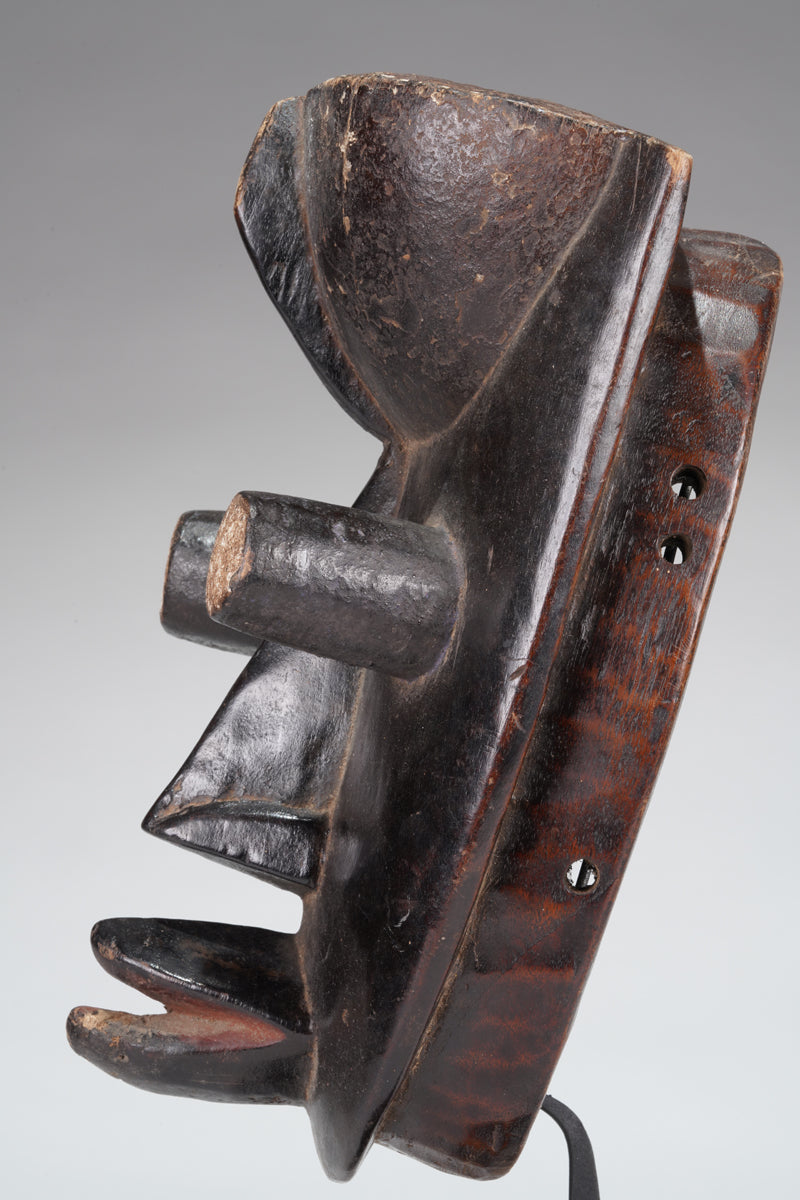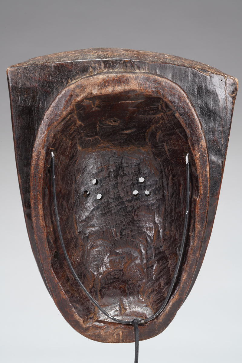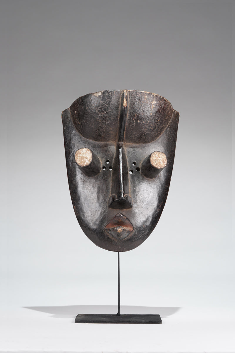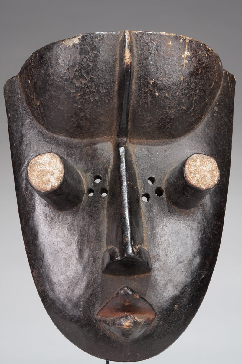 “The Grebo use several types of masks, some used for adult initiation or religious ceremonies. The most commonly seen is the war mask, used by warrior societies and formed in the shape of a plank with cylindrical eyes, numbering between two and twelve. The mask is danced in preparation for war and at the funerals of warriors.”