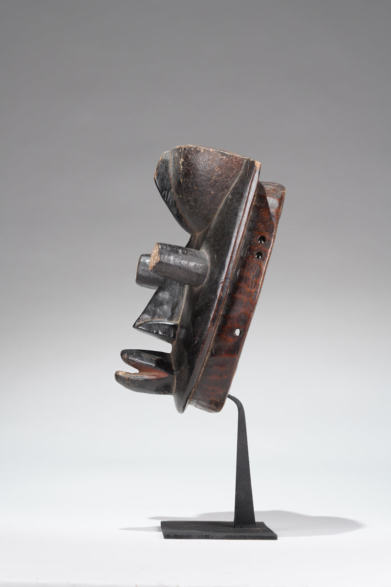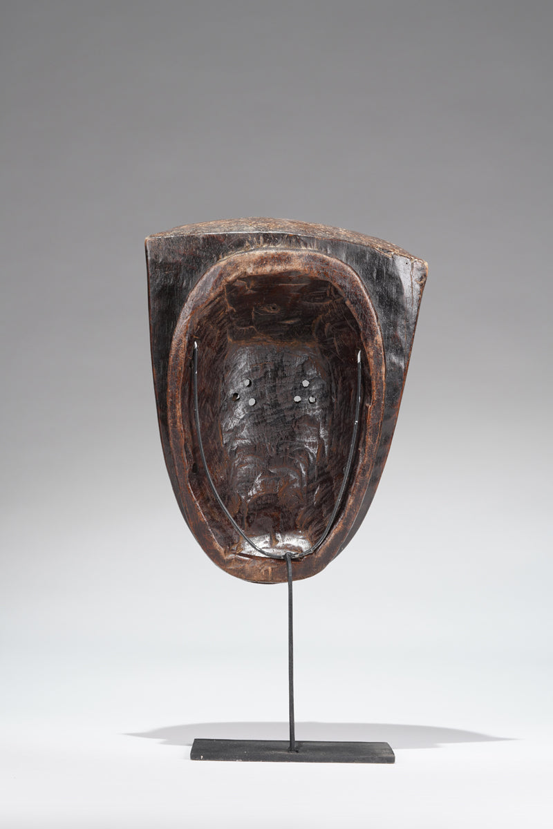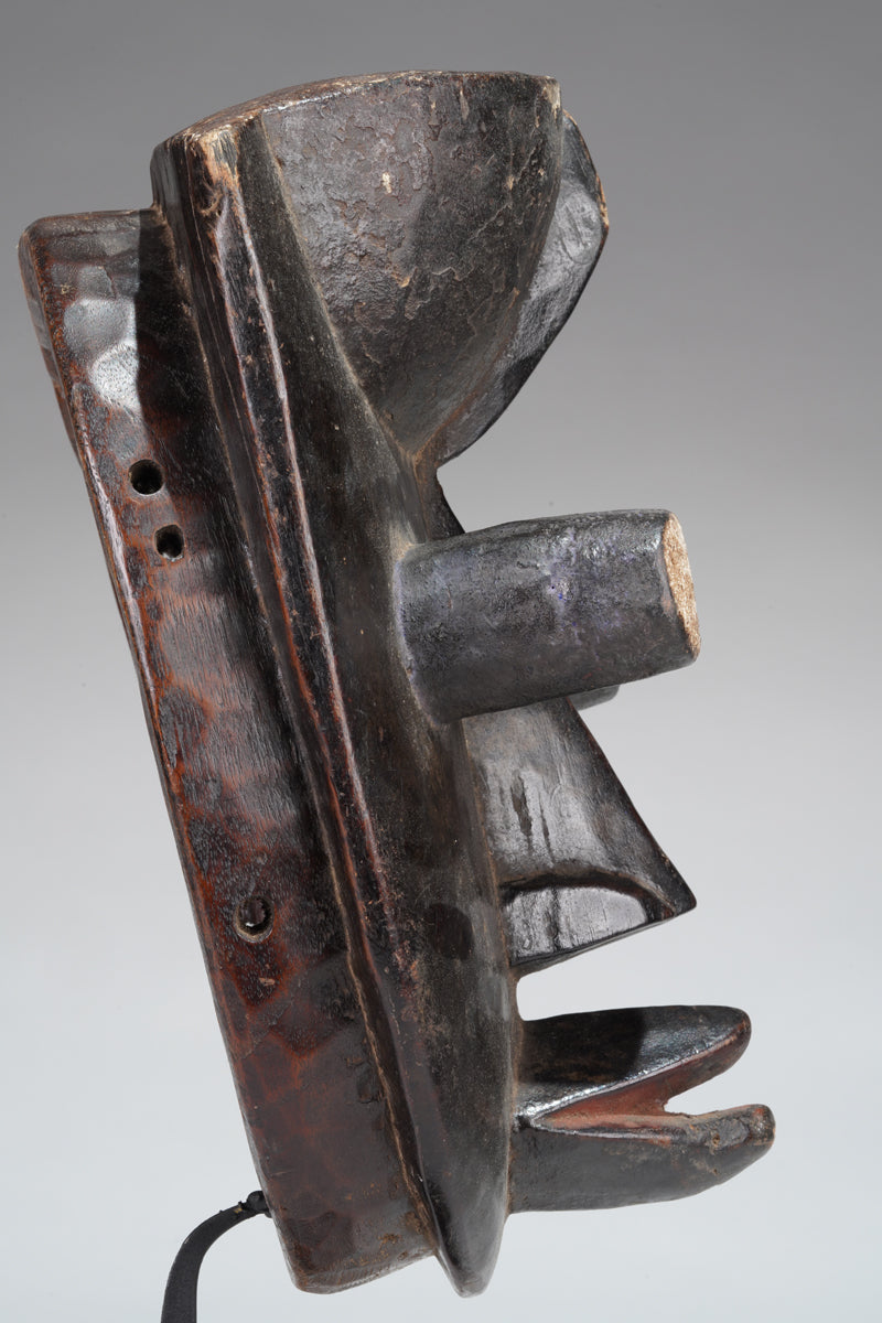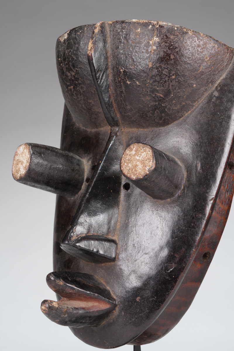 “The Grebo use several types of masks, some used for adult initiation or religious ceremonies. The most commonly seen is the war mask, used by warrior societies and formed in the shape of a plank with cylindrical eyes, numbering between two and twelve. The mask is danced in preparation for war and at the funerals of warriors.”