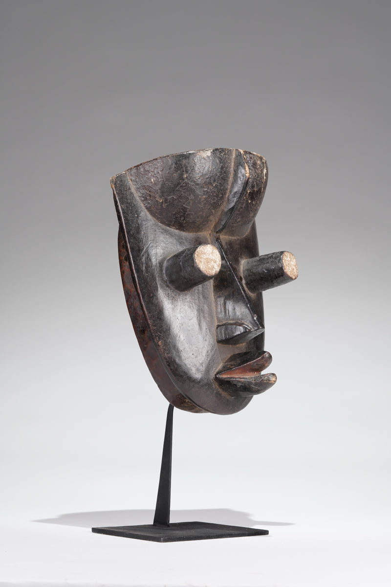 A Grebo mask, Liberia, of oval shape, protruding pointed mouth, long nose, two tubular eyes poking out, a bulging forehead split in-between with an elevated line, the discs of the eyes are painted white, the inside of the mouth red, the whole mask is glossy and the dark wood shines; glossy by use, encrusted patina on the forehead.