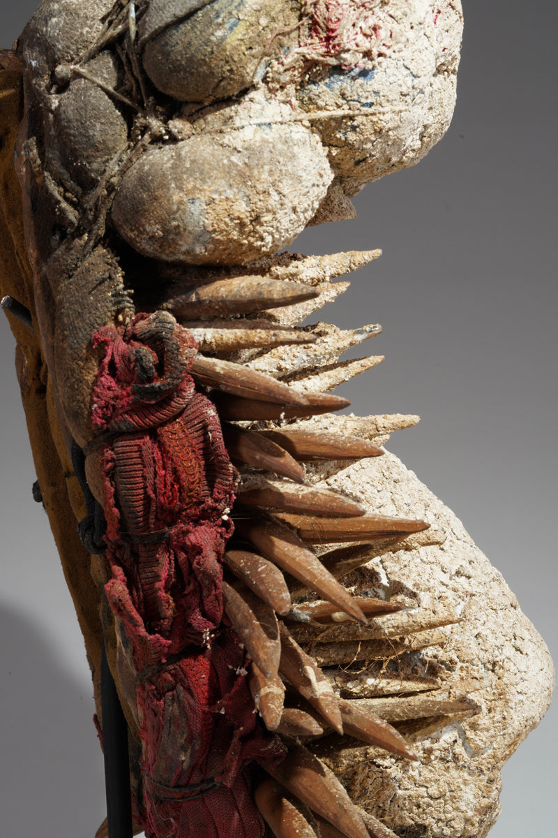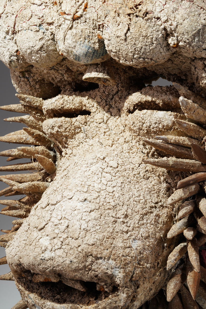 A Guerre mask of peace, Ivory Coast, collected in the Danane West region, wooden spikes all around the half bottom of the face, red painted fabric around the back of the mask, encrusted, ritual patina; signs of use. Certificate of origin and provenance.
