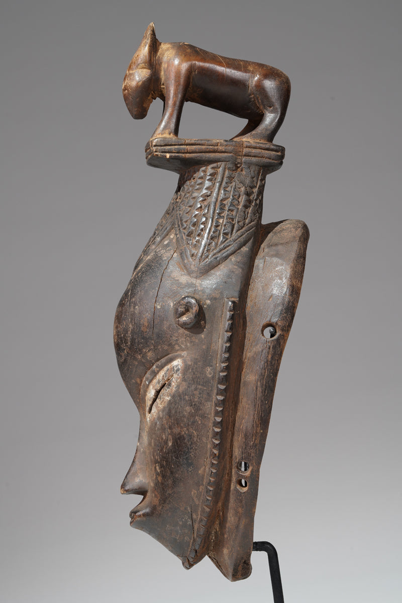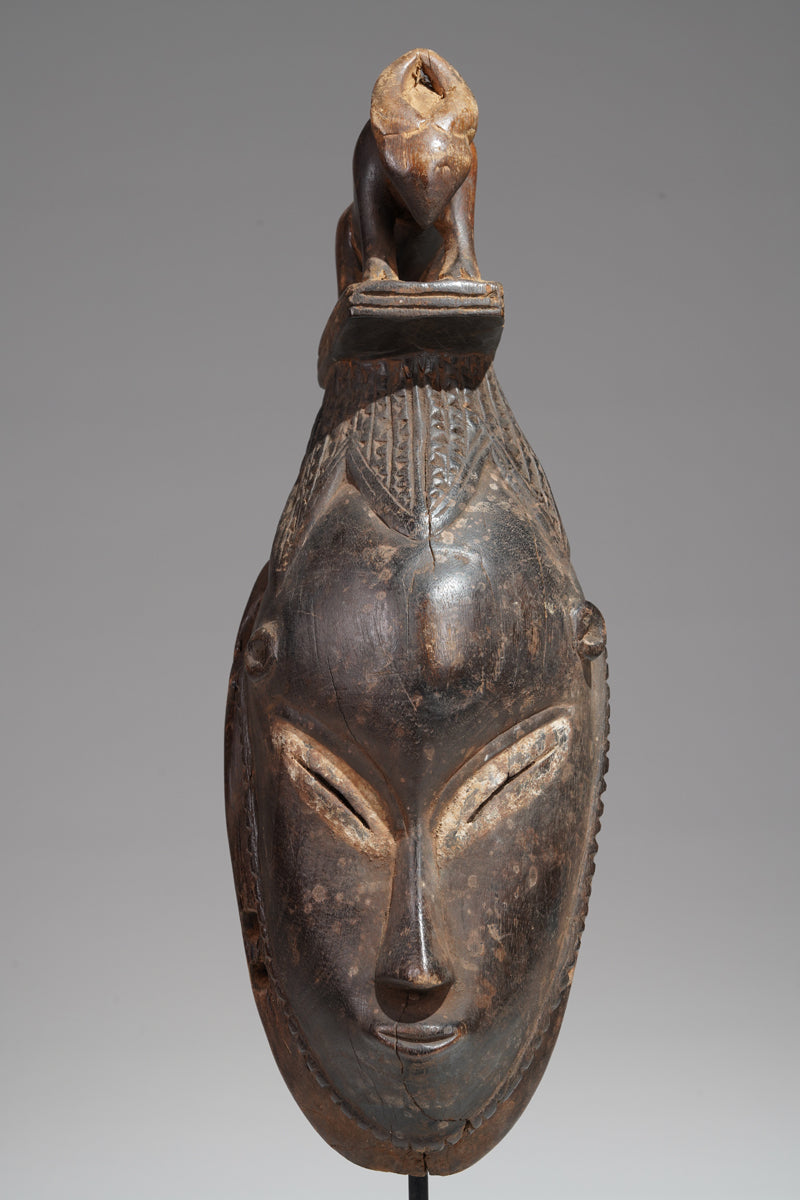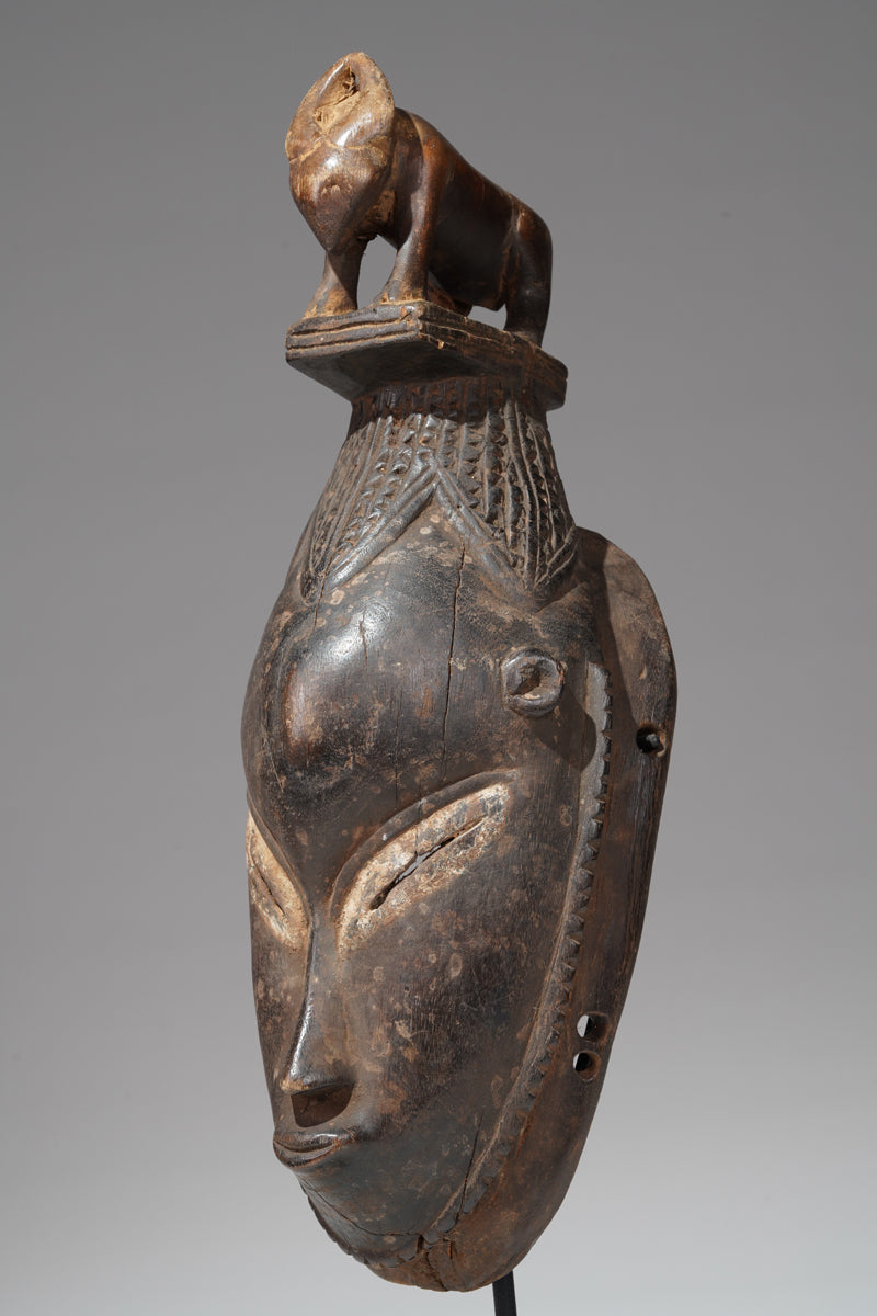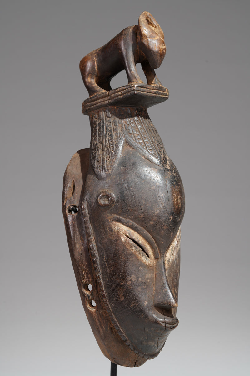 "In Guro culture, distinctions are made between masquerades that are the focus of cults and those that are more secular in nature. A sequence of three sacred masks centers around Zamble, a mythical male being whose form fuses antelope and leopard features. He is in turn complemented by his beautiful wife, Gu, and his wild, grotesque brother, Zuali. Such representations are owned by certain families that use them as the loci of sacrificial offerings proposed by diviners to improve their well-being. In contrast, other Guro mask forms, which serve only as sources of entertainment, are designed by individual performers." Source: The Met Museum, NY