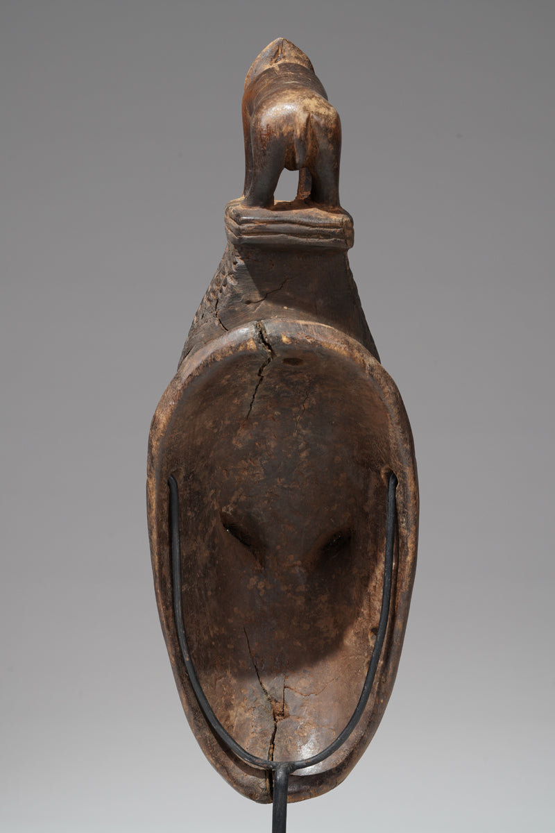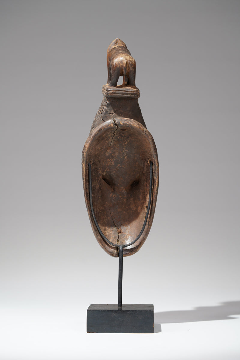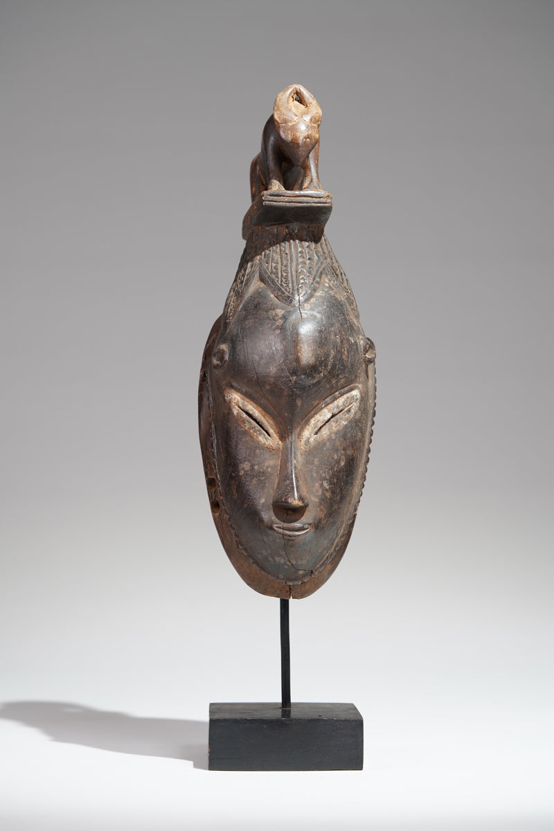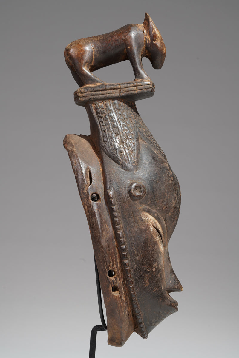 "In Guro culture, distinctions are made between masquerades that are the focus of cults and those that are more secular in nature. A sequence of three sacred masks centers around Zamble, a mythical male being whose form fuses antelope and leopard features. He is in turn complemented by his beautiful wife, Gu, and his wild, grotesque brother, Zuali. Such representations are owned by certain families that use them as the loci of sacrificial offerings proposed by diviners to improve their well-being. In contrast, other Guro mask forms, which serve only as sources of entertainment, are designed by individual performers." Source: The Met Museum, NY