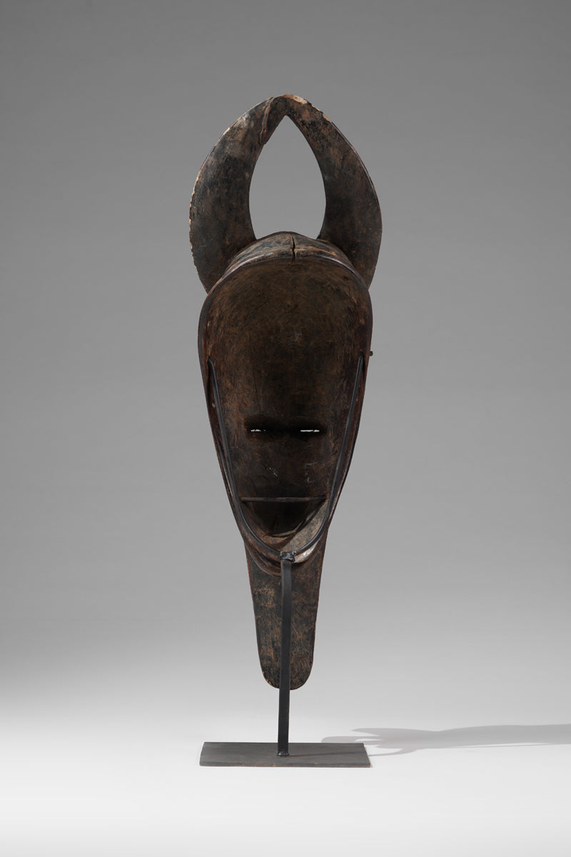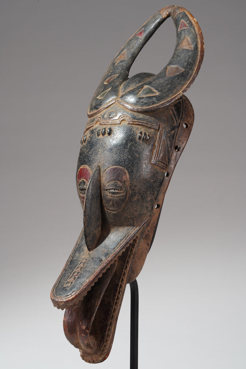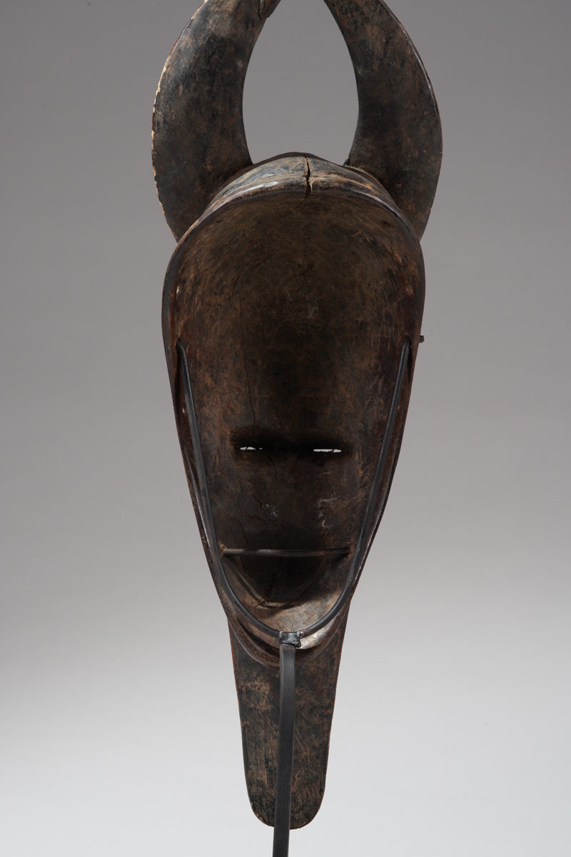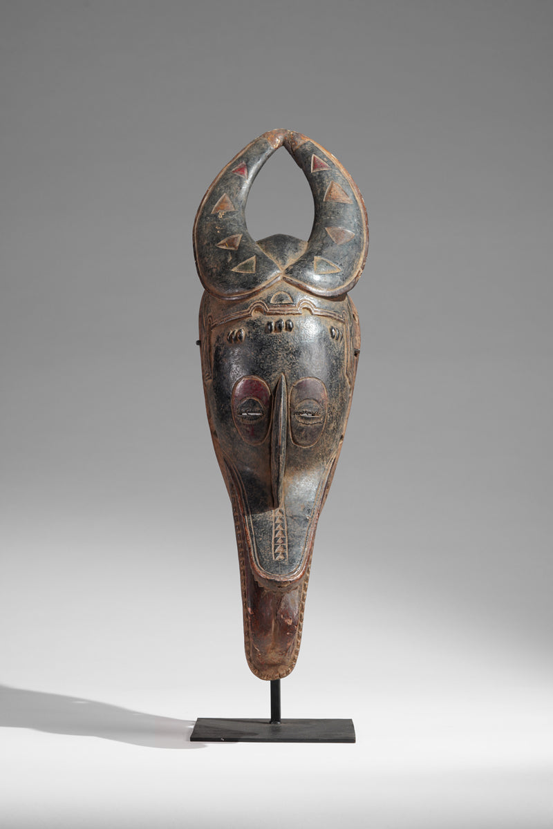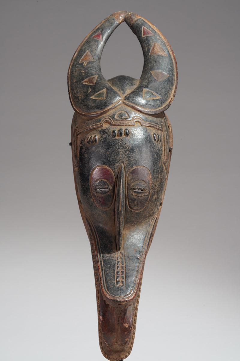 A Guro mask from the Gohitafla region in central Côte d’Ivoire exemplifies the artistic sophistication and spiritual significance that characterizes the Guro people's masking tradition. In this region—rich in ritual performance and ancestral veneration—masks are not simply decorative; they are sacred instruments used to embody spirits (zamblé), convey moral teachings, and unite the community during key life events.