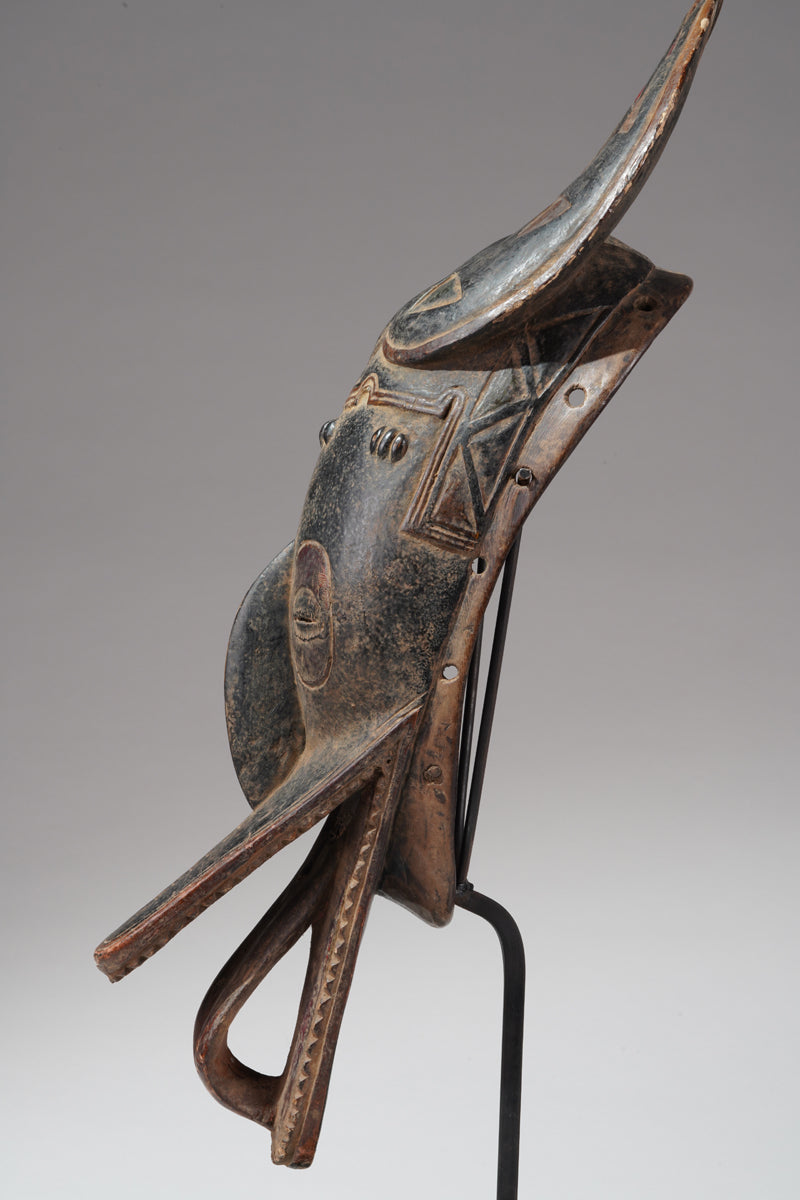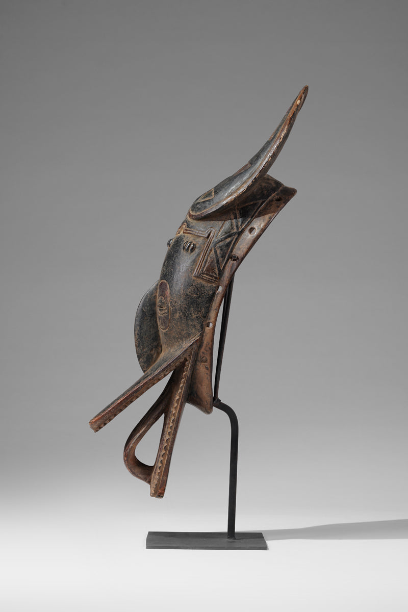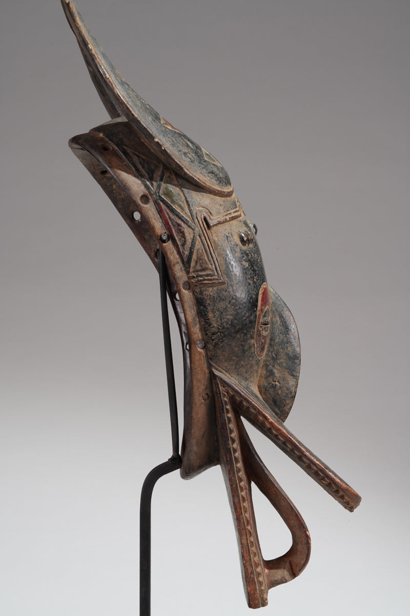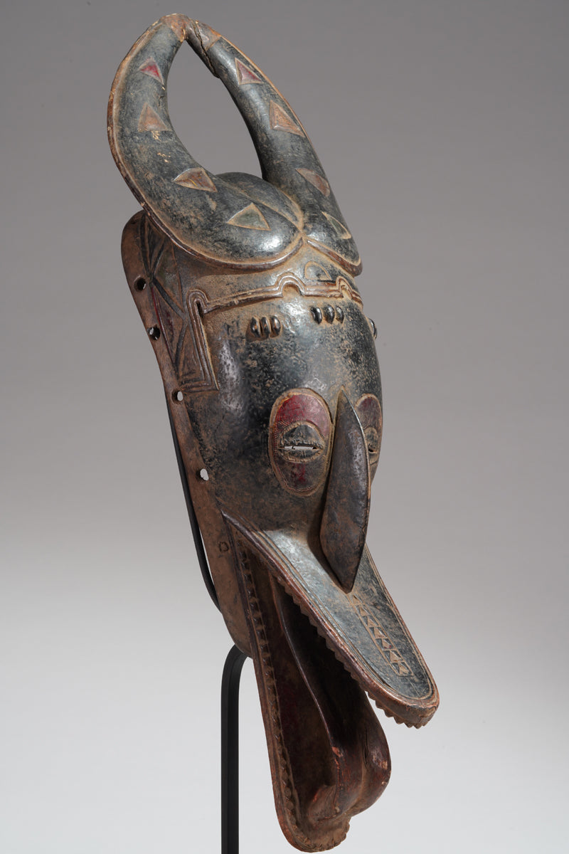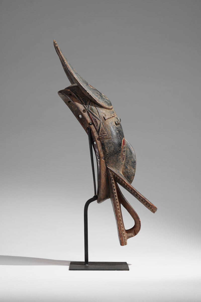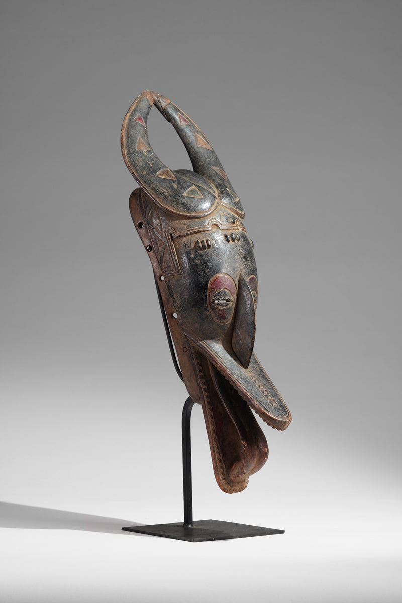 A Guro mask from the Gohitafla region in central Côte d’Ivoire exemplifies the artistic sophistication and spiritual significance that characterizes the Guro people's masking tradition. In this region—rich in ritual performance and ancestral veneration—masks are not simply decorative; they are sacred instruments used to embody spirits (zamblé), convey moral teachings, and unite the community during key life events.