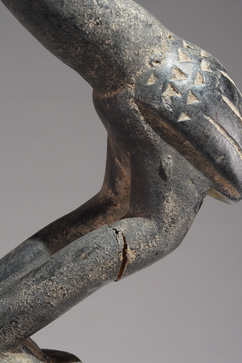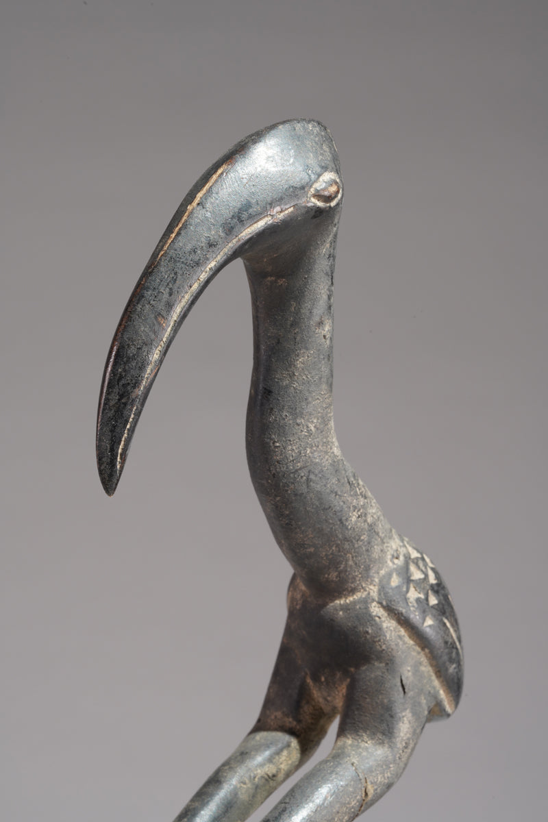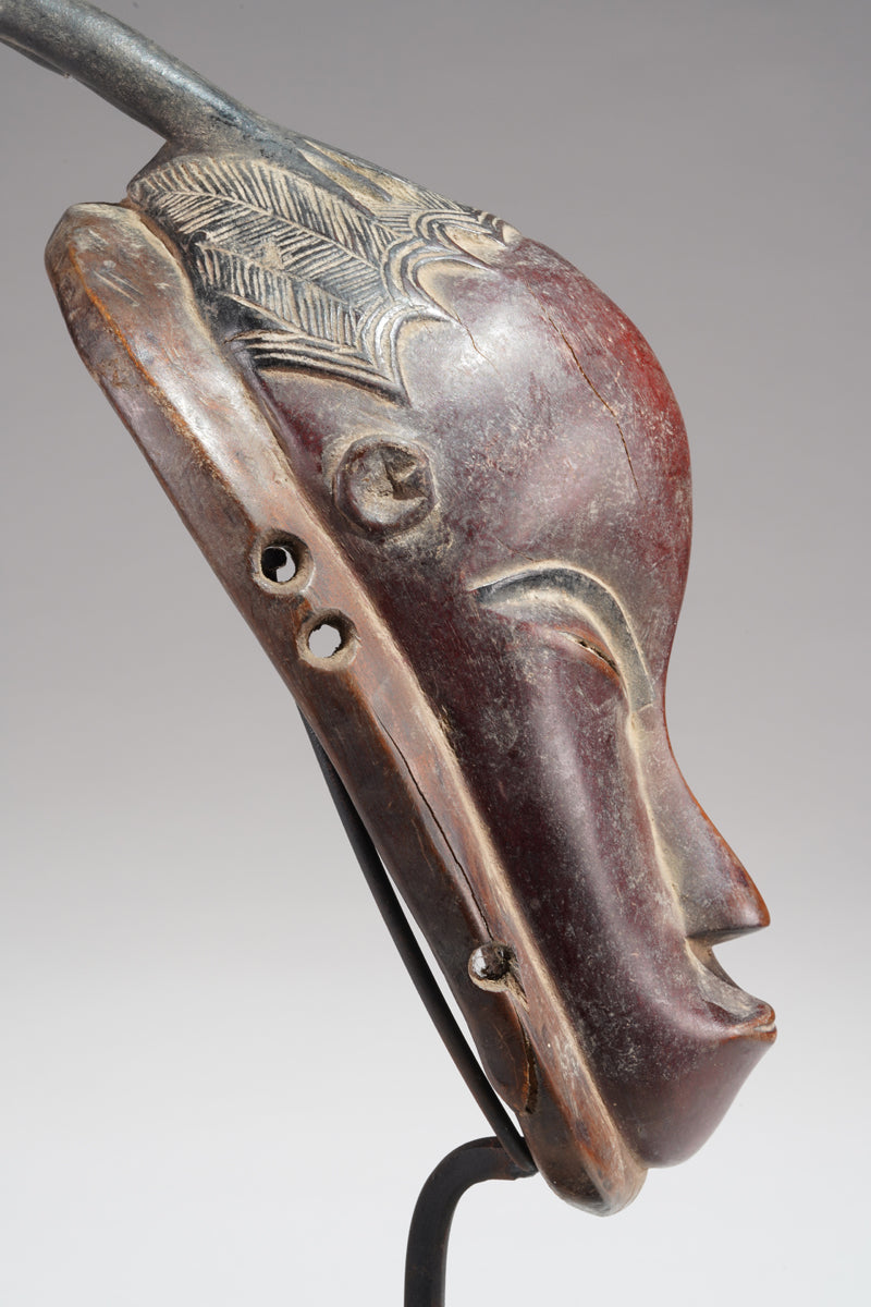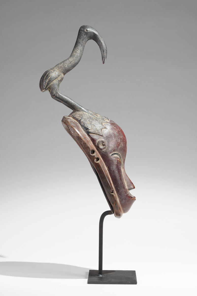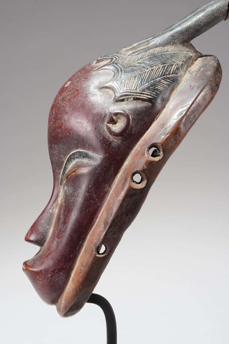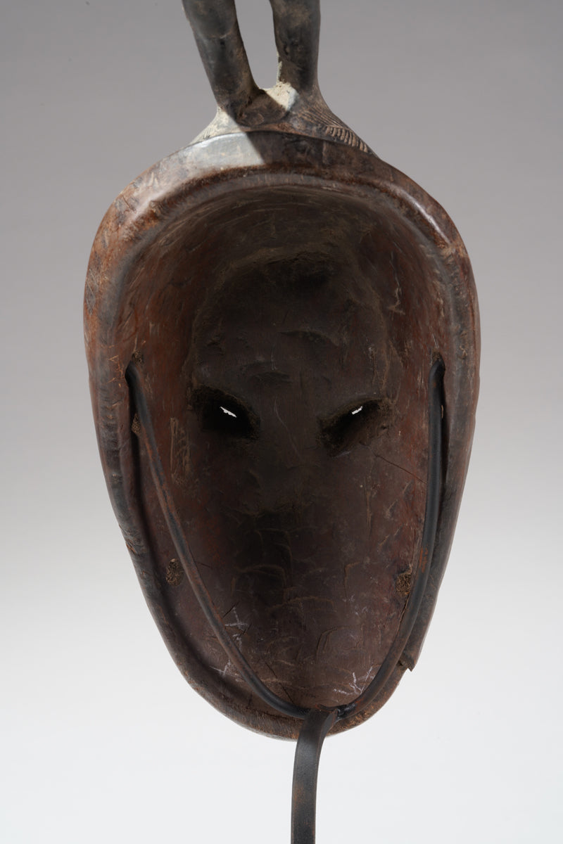 This Guro mask and many of the other masks are representations of the spirit of Gu, the wife of Zamble, a supernatural being. Each mask is similar but not identical with horns that represent the spiritual power and is believed by the tribe to have magic powers to protect the human way of life of the owner and the tribe. The Guro mask is very unique and has a combination of human and animal traits and imaginary beasts. Birds of different kinds can often be seen carved into the mask such as the horn bill or other large billed birds. These masks were commonly used during the traditional ceremonies such as funerals, animal sacrifices and weddings, today the people of Ivory Coast honor their ancestors with traditional dance and the mask represents their loyalty to the past."