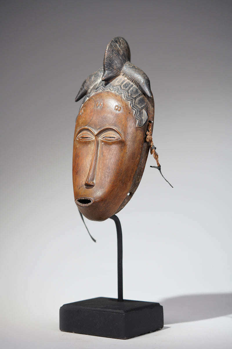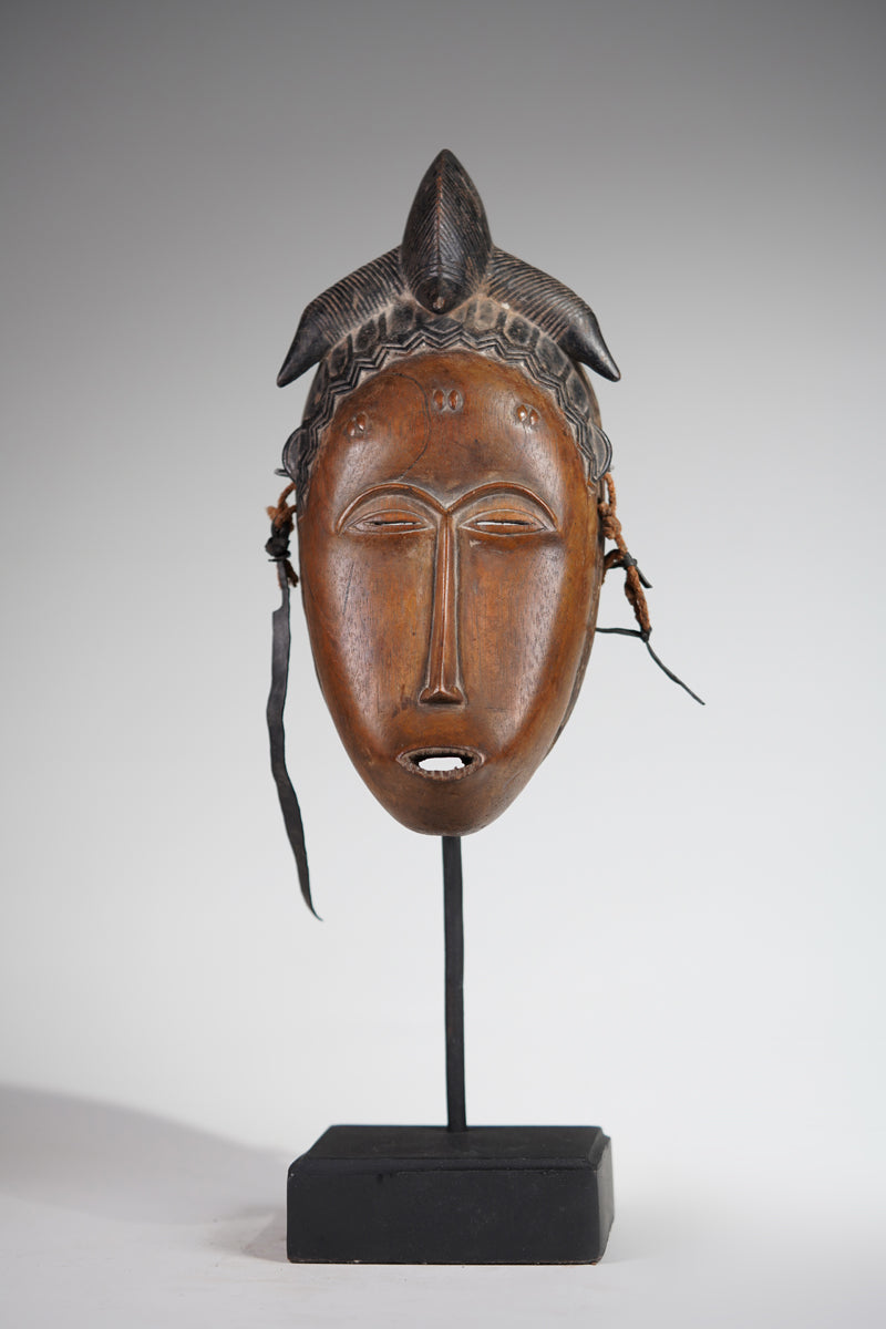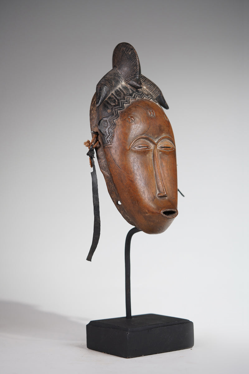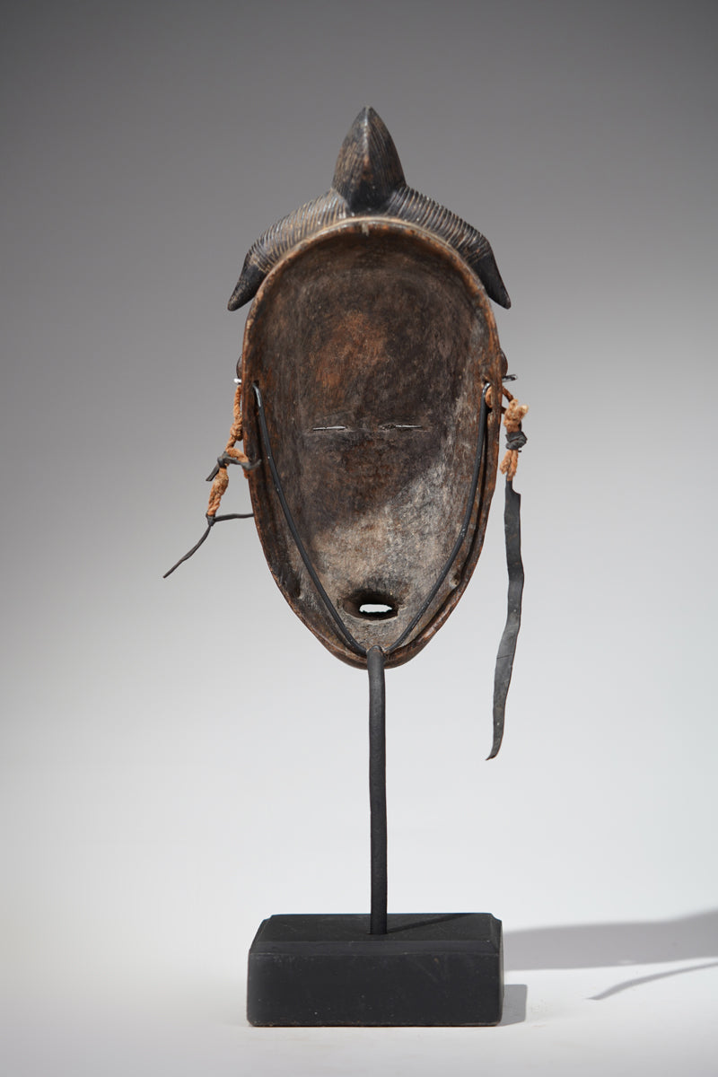 A Guro mask of Ivory Coast, of Guitafla, oval hollowed form, surmounted by a three-parted, striated coiffure, incl. stand.