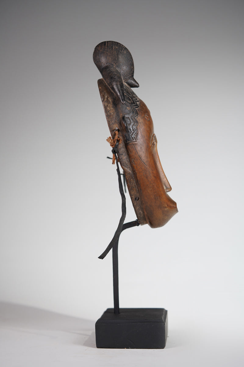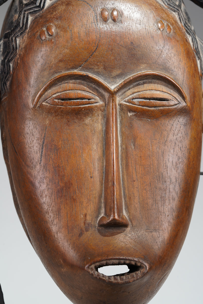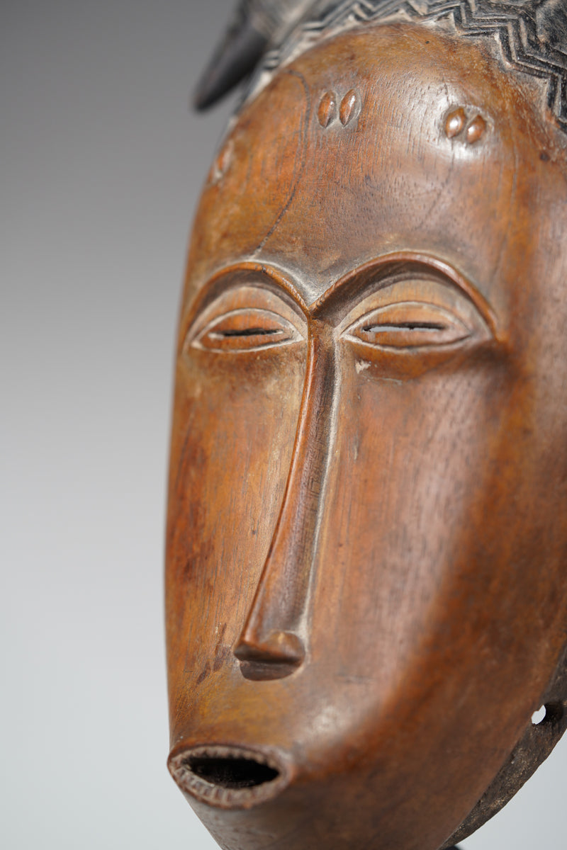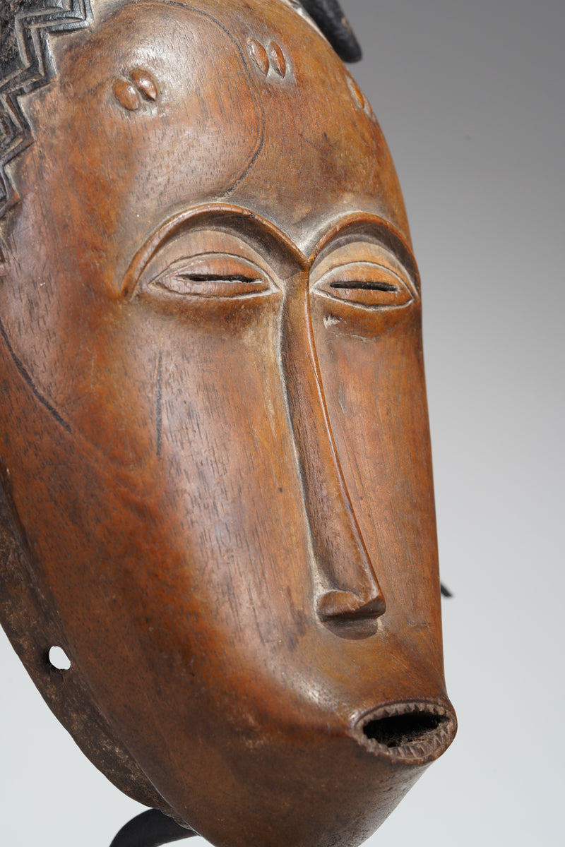 A Guro mask of Ivory Coast, of Guitafla, oval hollowed form, surmounted by a three-parted, striated coiffure, incl. stand.