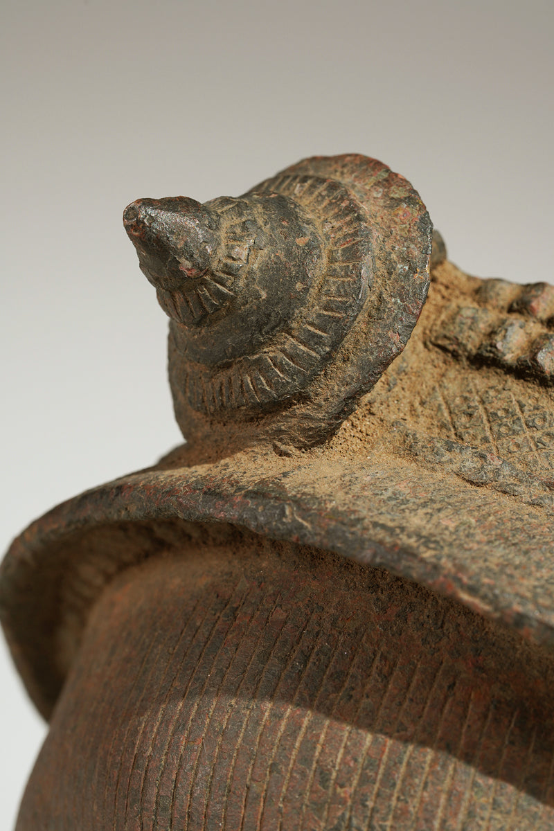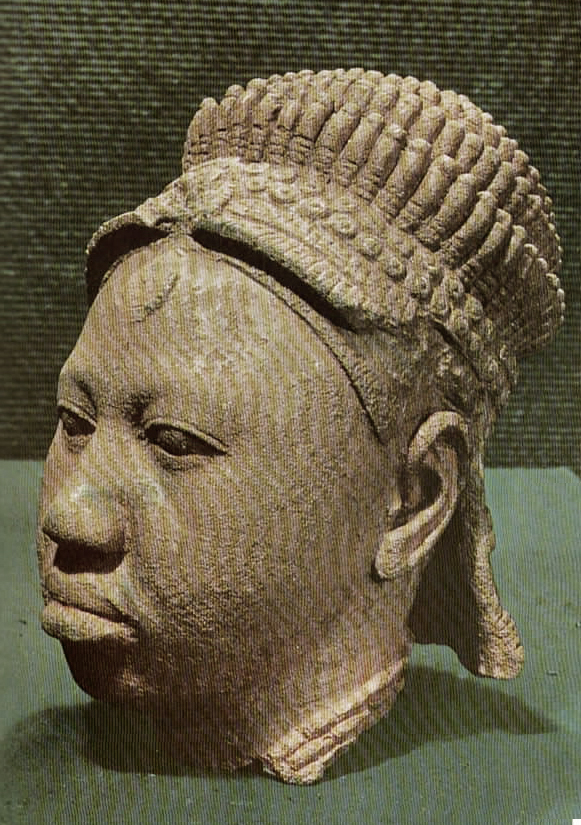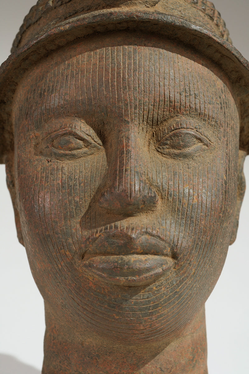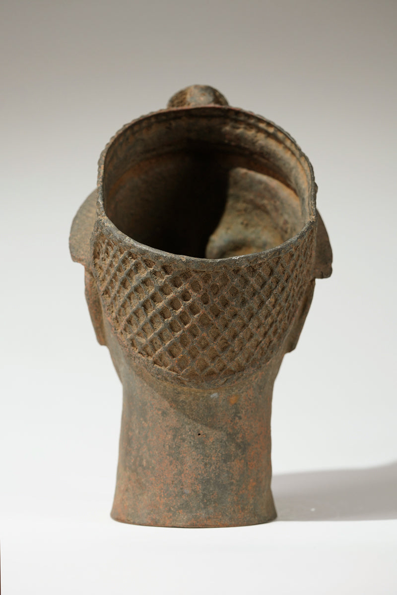 A head of Olokun in the style of Ife, Nigeria, But there are different opinions about this bronze head. Another opinion, based on oral tradition, assumes that this is the portrait of a Queen of the Ooni,, different layers of encrusted oxidations of this copper-rich, reddish bronze shows a long-lasting aging process.