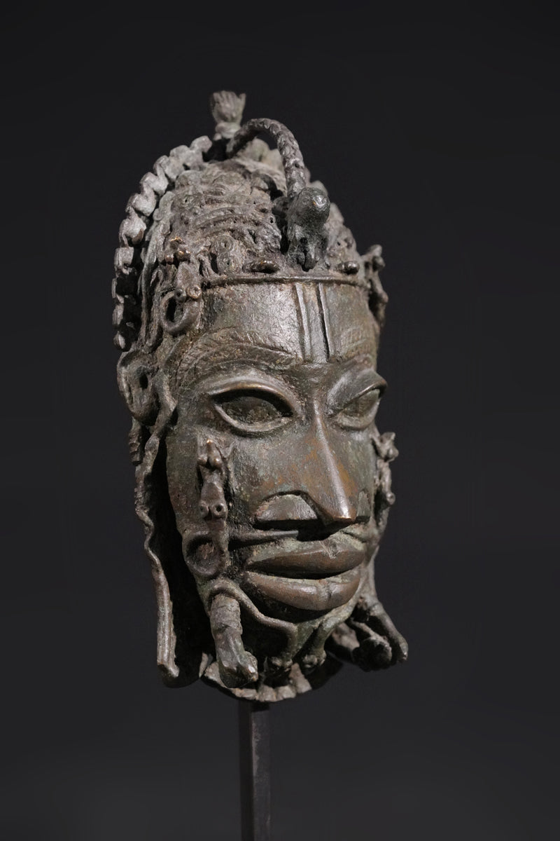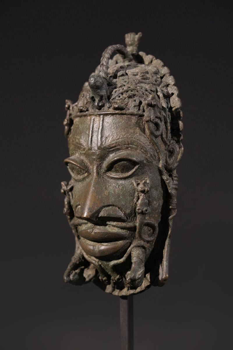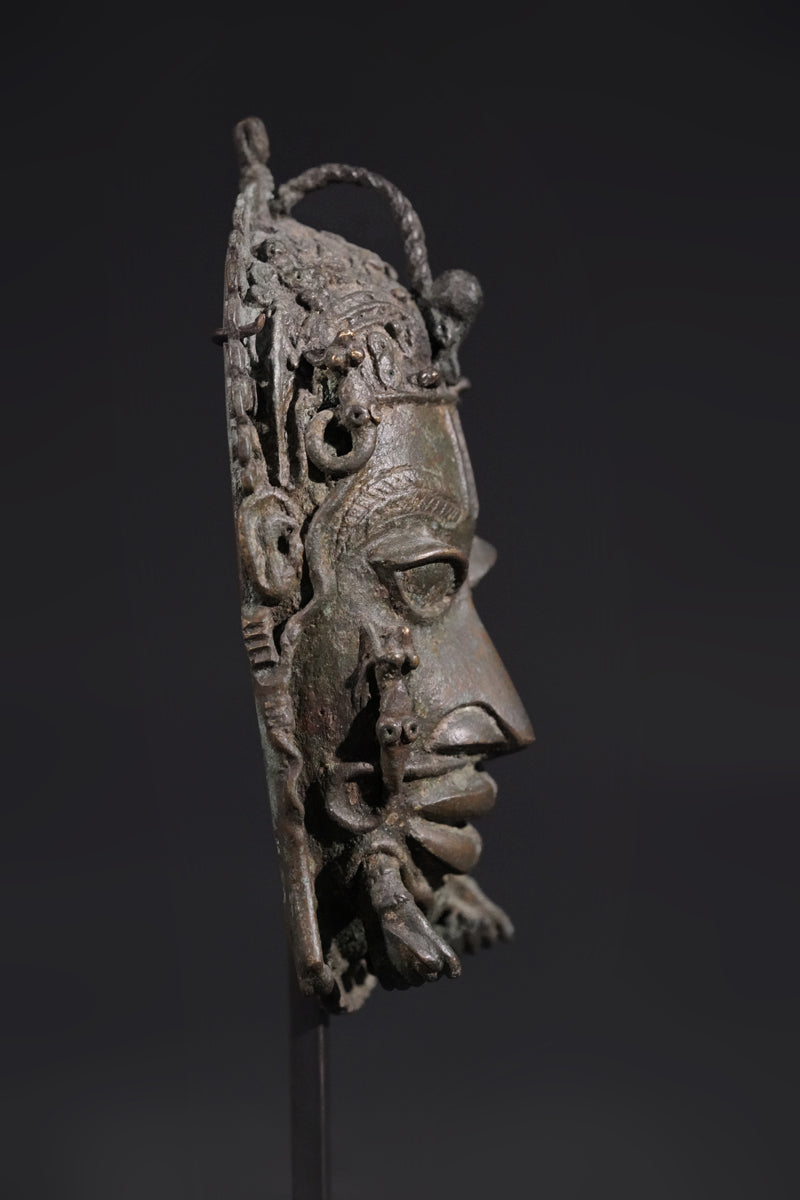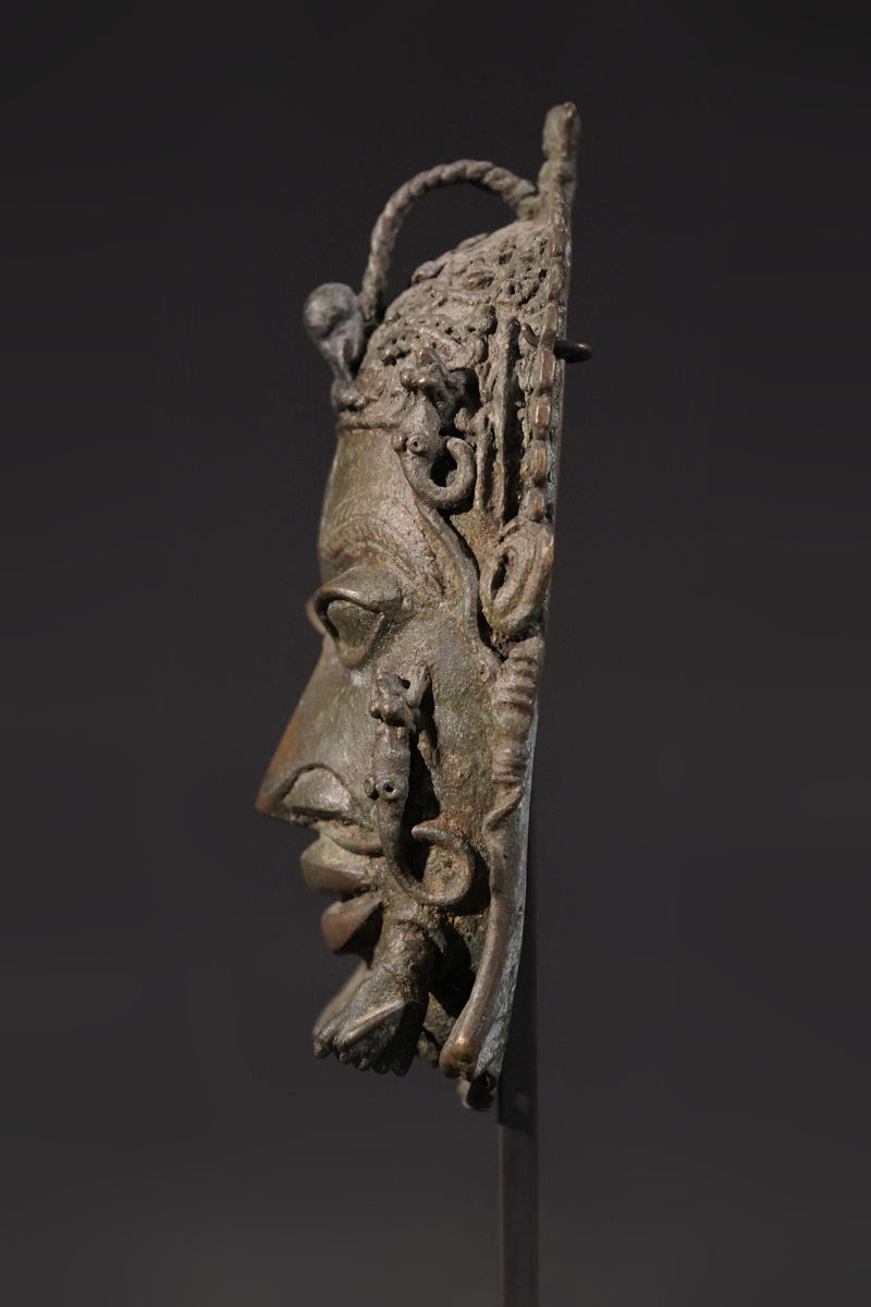 A Benin Bronze hip mask in shape of a panther, incl. metal stand. Provenance Arnd Klinge, Berlin, incl. metal stand.