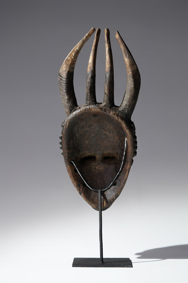 A horned Baule mask, Ivory Coast, of the Sikassou region, from the workshop of the Essankro carvers, one of the most outstanding masks we have collected in this region over the past three decades, this mask, with its delicately modelled face surmounted by curved and ridged horns, incl. metal stand.