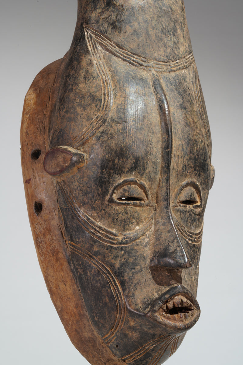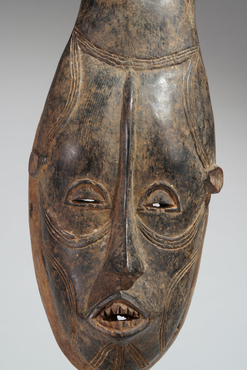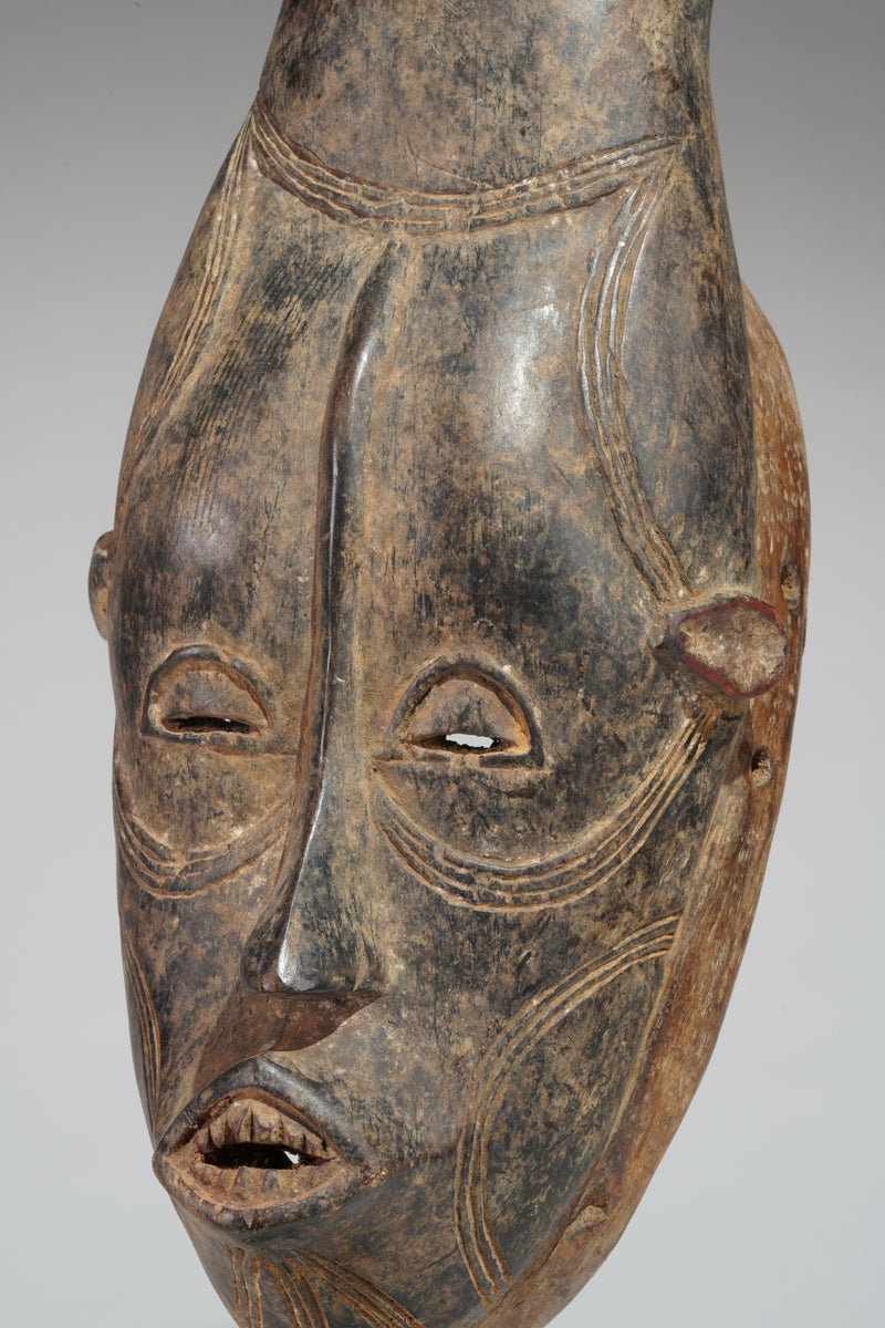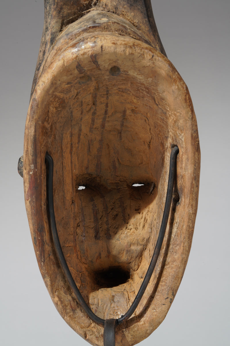 The Guro mask from the Ivory Coast, particularly from the region of Sinfra, is a traditional artifact created by the Guro people, a subgroup of the Mande ethnic family in West Africa. These masks are integral to ceremonial life and are used in various rituals including funerals, initiations, and harvest celebrations. They serve both aesthetic and spiritual purposes, believed to connect the living with the spirit world and to embody protective and ancestral forces.