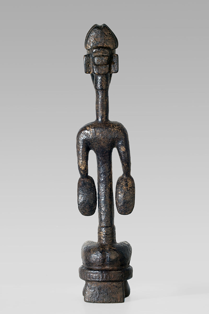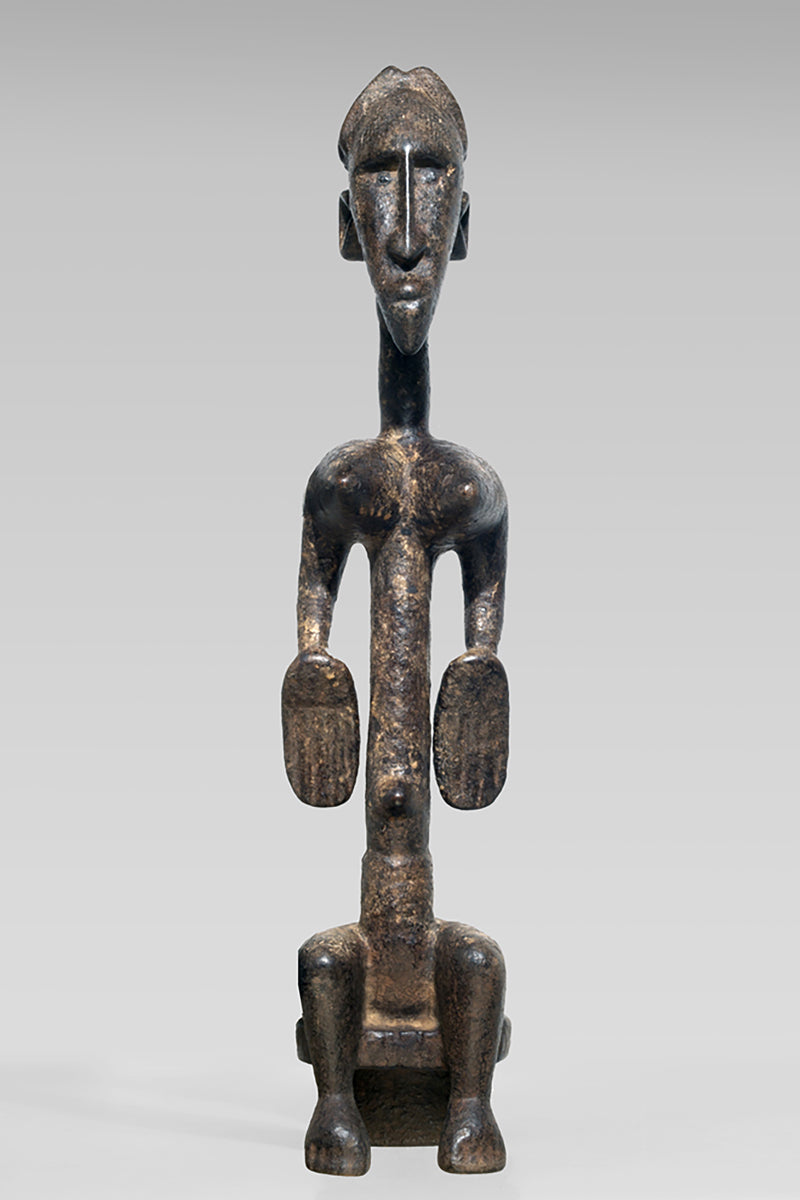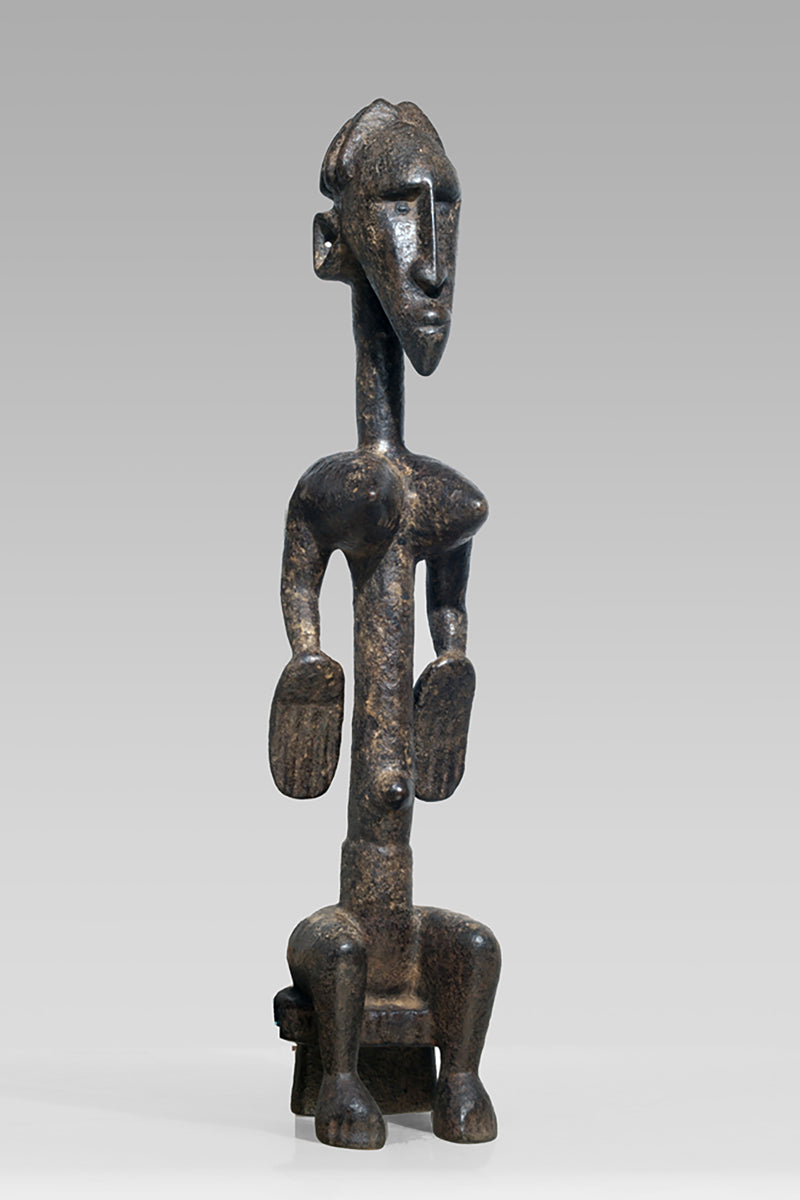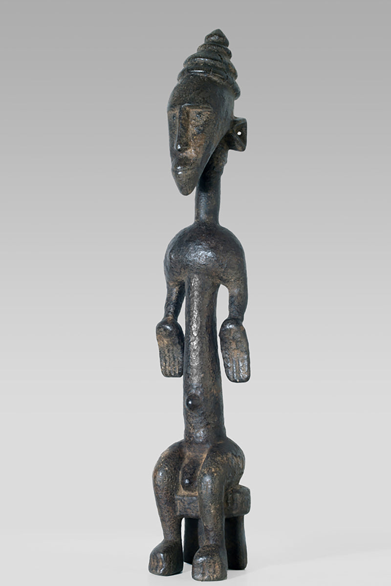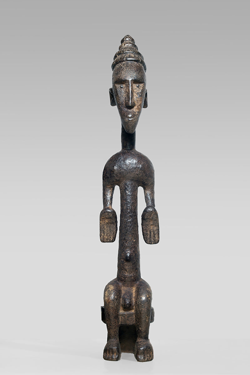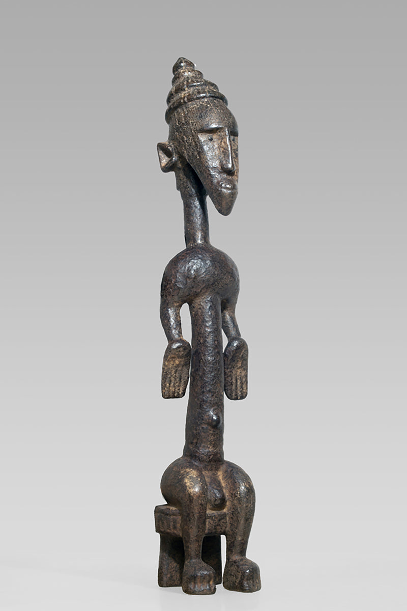In his interpretation, the elaborate coiffures often found on Kala figures reflect specific ethnic or regional styles, possibly linked to initiation or ritual roles. They may also symbolize ancestral authority or ritual knowledge, particularly when the figures are used as shrine objects or spiritual mediators. The attention given to the hair, sometimes rendered in stylized ridges or abstracted braids, suggests a deliberate intention to encode cultural information into the sculpture.