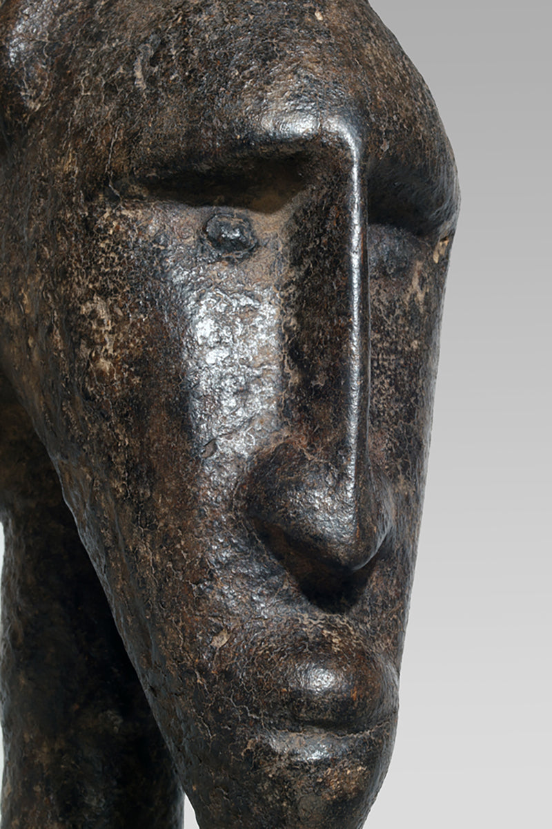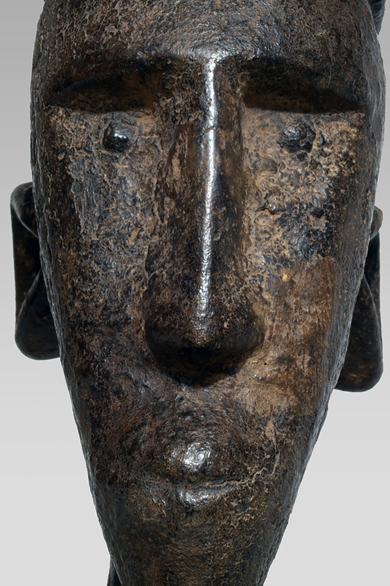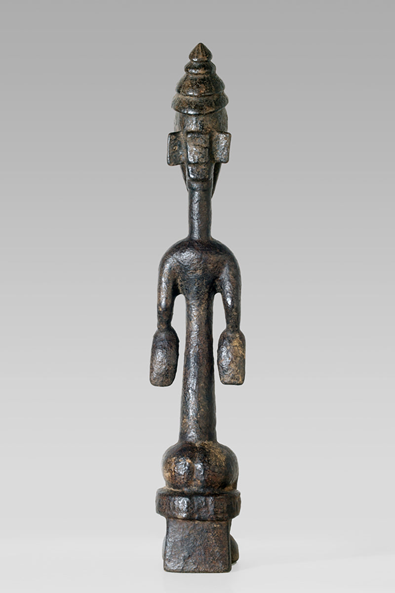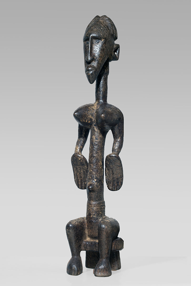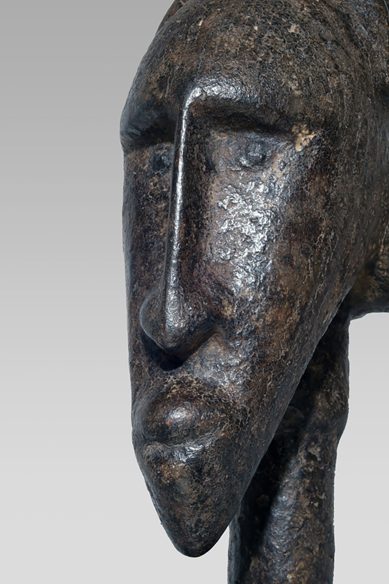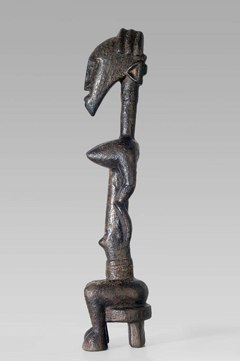In his interpretation, the elaborate coiffures often found on Kala figures reflect specific ethnic or regional styles, possibly linked to initiation or ritual roles. They may also symbolize ancestral authority or ritual knowledge, particularly when the figures are used as shrine objects or spiritual mediators. The attention given to the hair, sometimes rendered in stylized ridges or abstracted braids, suggests a deliberate intention to encode cultural information into the sculpture.