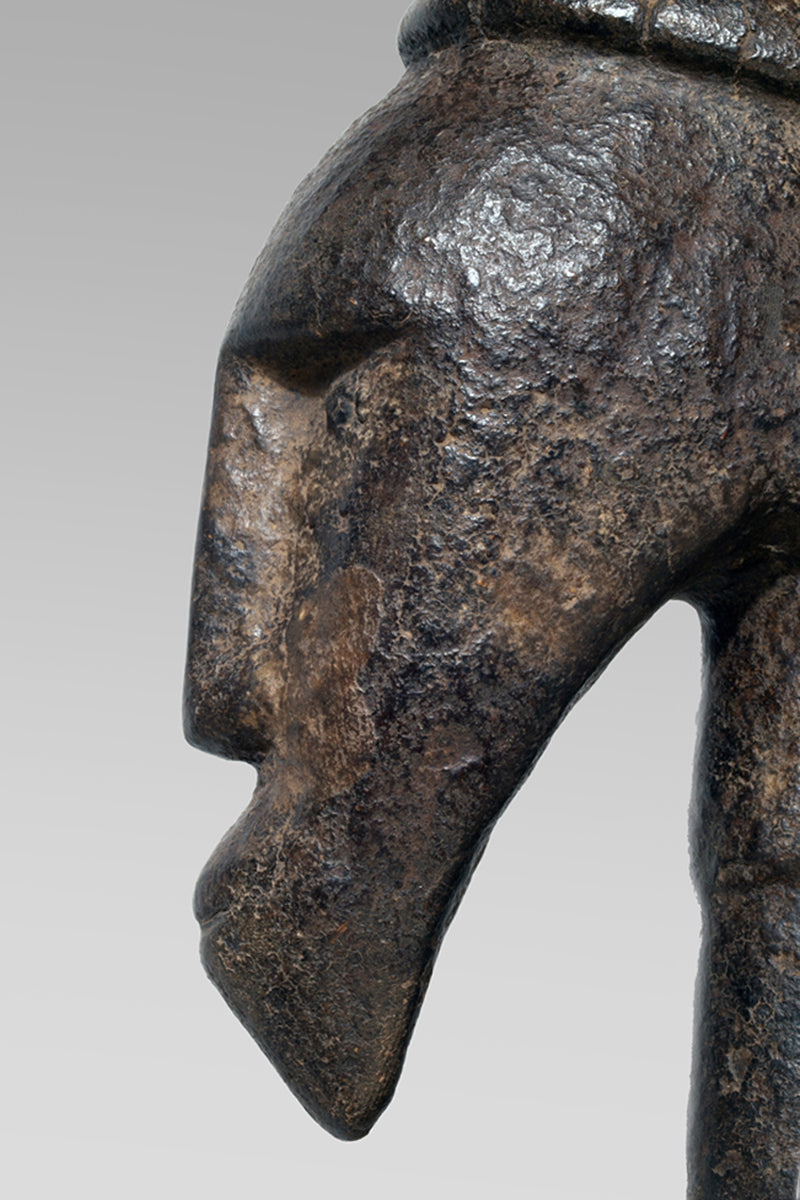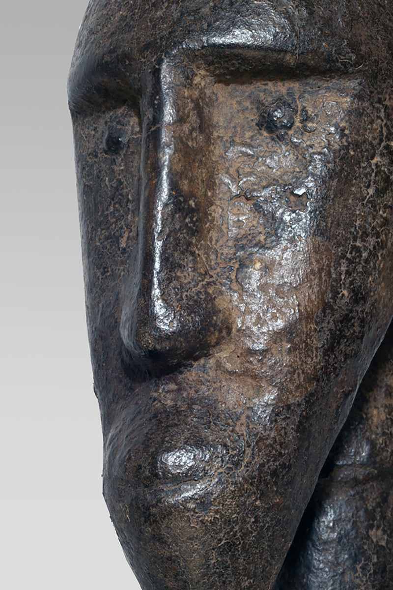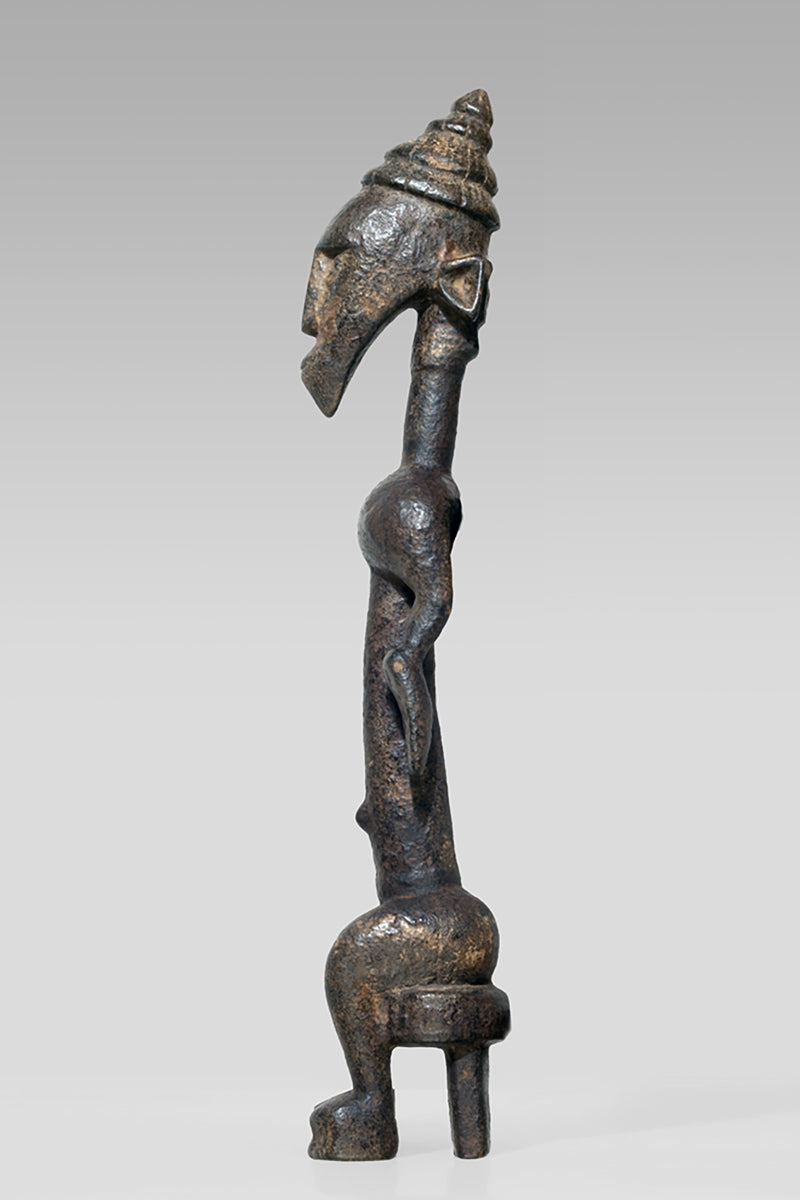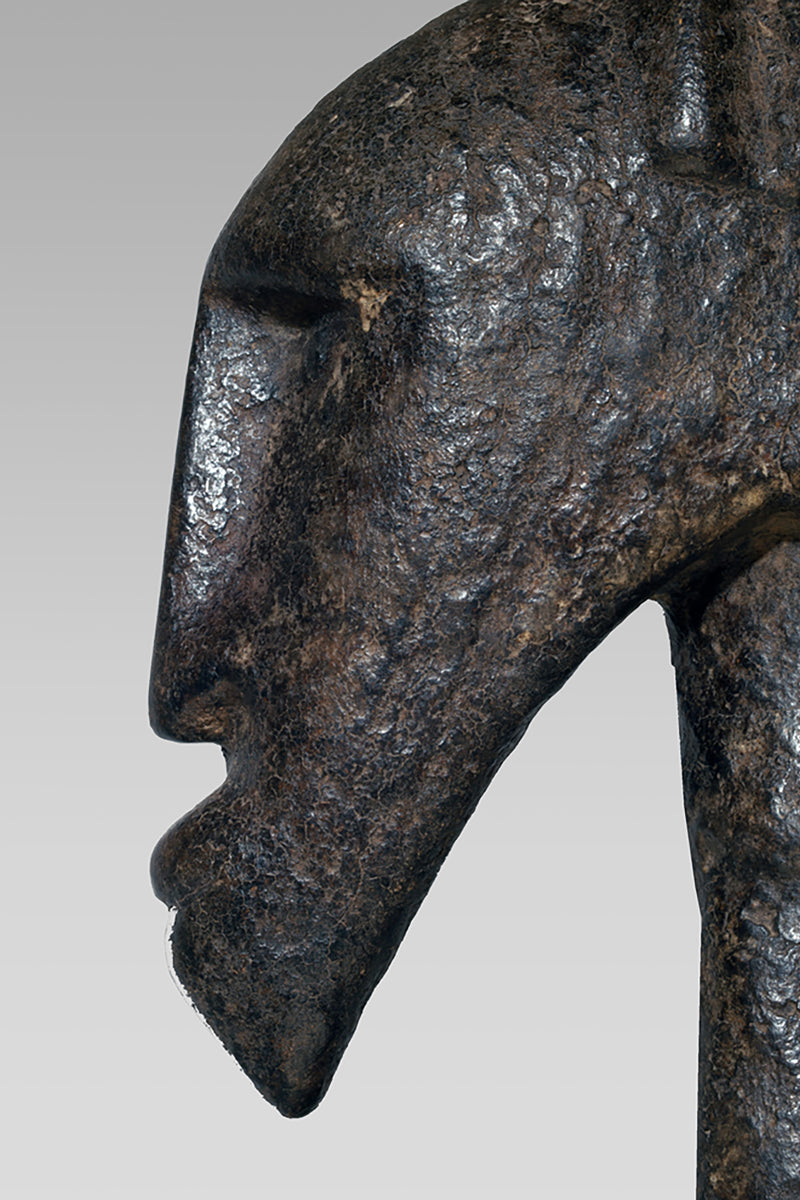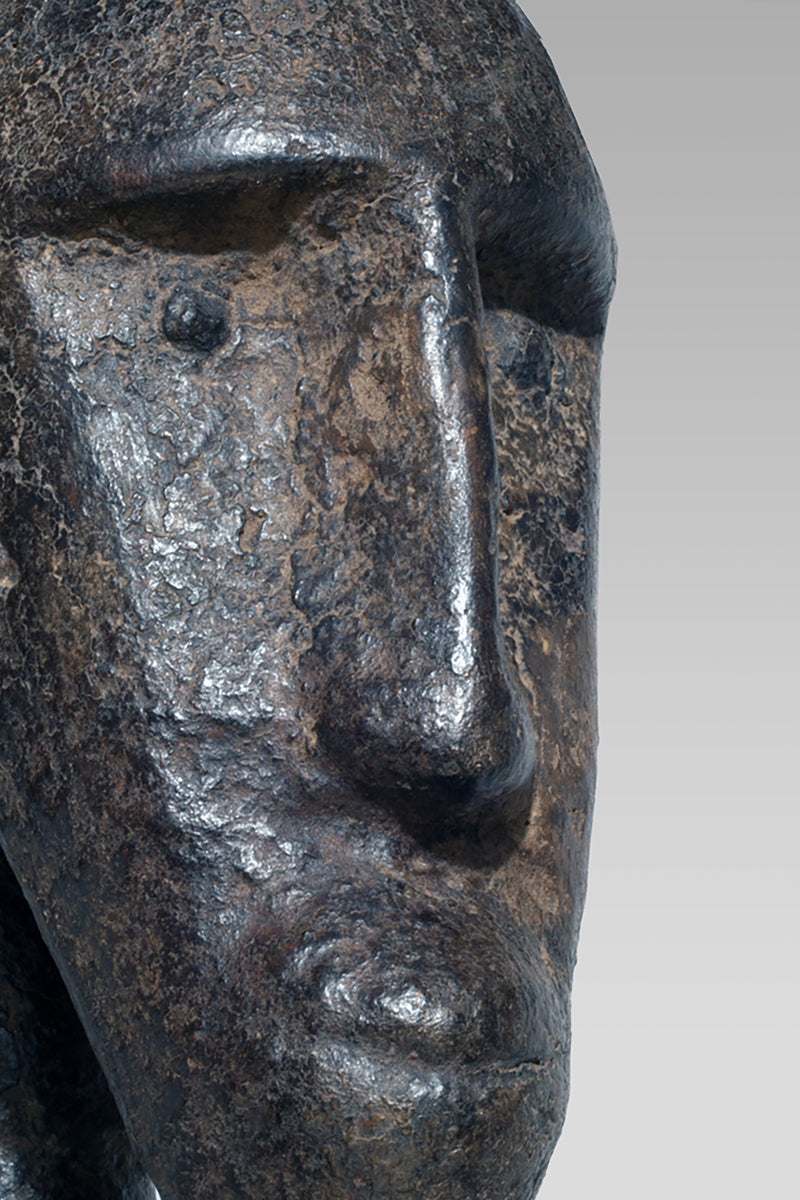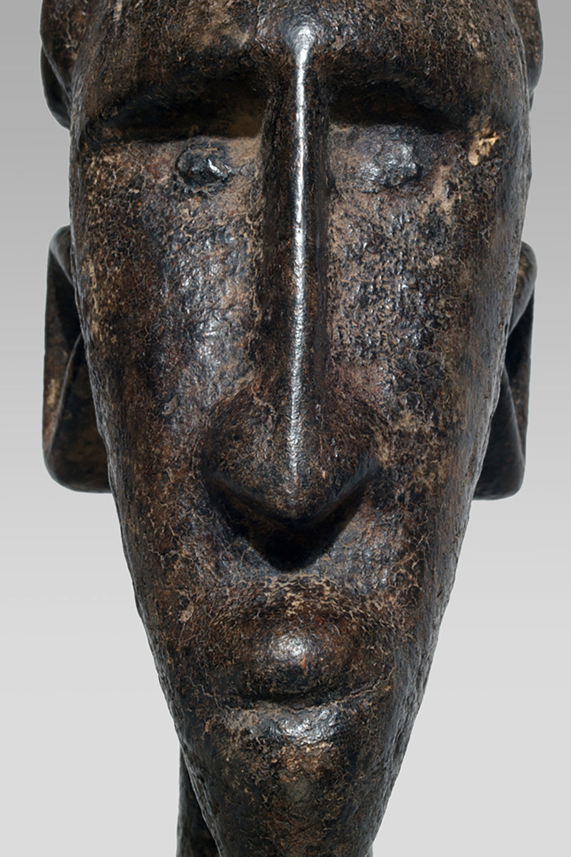 In his interpretation, the elaborate coiffures often found on Kala figures reflect specific ethnic or regional styles, possibly linked to initiation or ritual roles. They may also symbolize ancestral authority or ritual knowledge, particularly when the figures are used as shrine objects or spiritual mediators. The attention given to the hair, sometimes rendered in stylized ridges or abstracted braids, suggests a deliberate intention to encode cultural information into the sculpture.