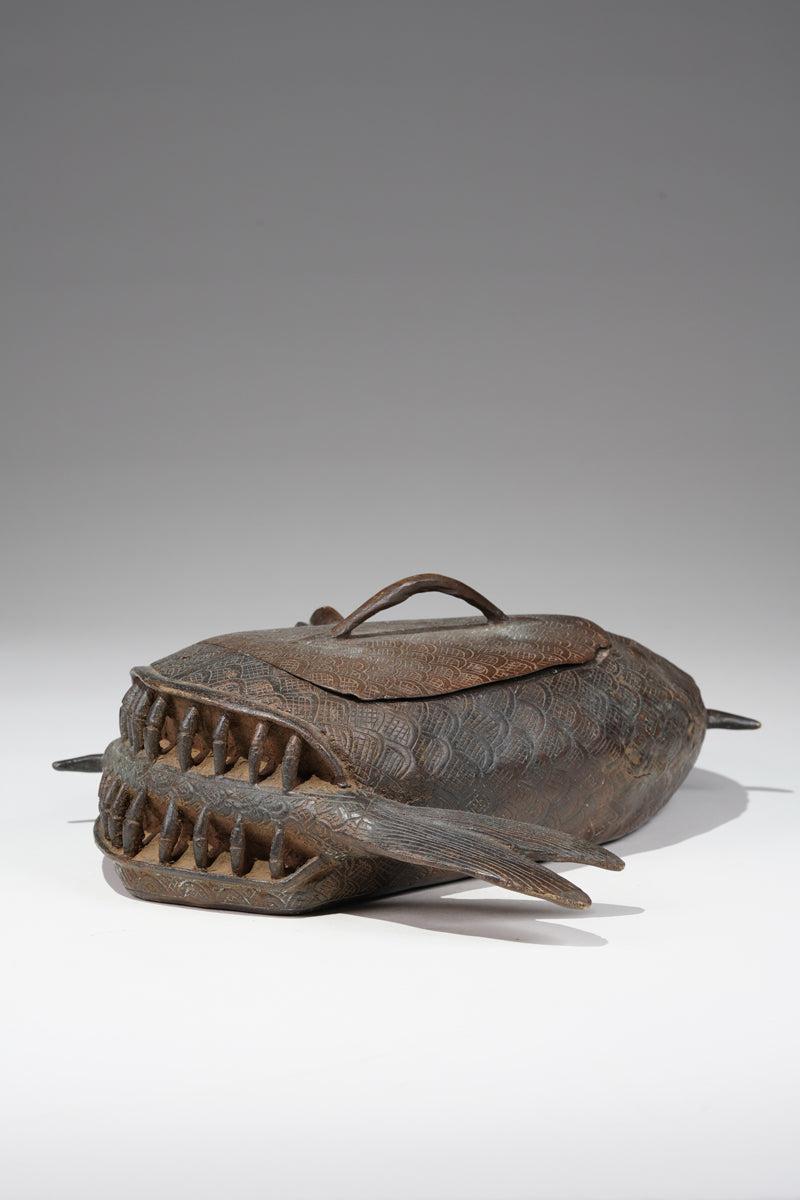A Kola nut container in the style of Benin, the large head piece holds a container with a basic triangular shape, which is completely integrated into the fish shape with a lid. The entire surface consists of the fish scale ornament. The tail protruding from the right side of the mouth with pointed teeth shows a groove-like pattern. The idiosyncratic shape of the body with the rounded tail leading into the mouth is stabilised by a pair of crossed spikes, which are in turn laced at the crossing by a rope. Some age-related punctures in the lid and base of the interior, otherwise reddish-brown patina.
