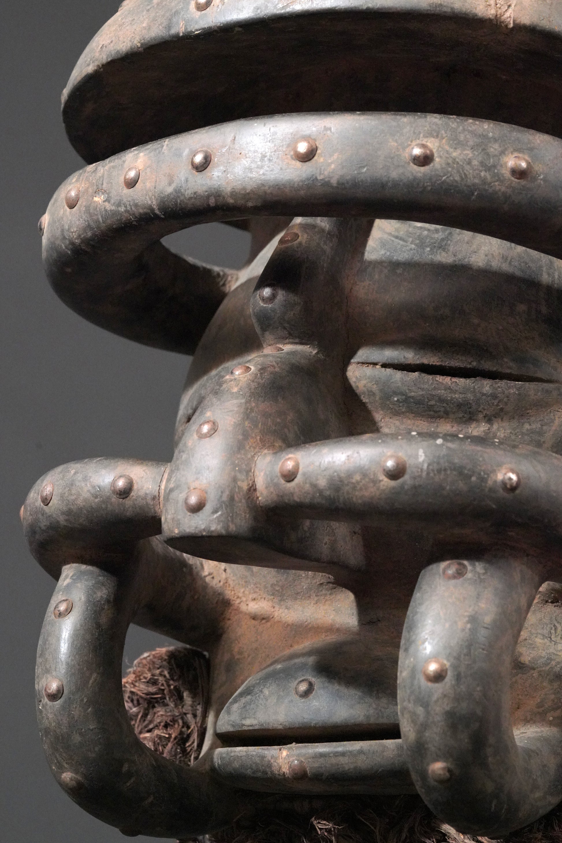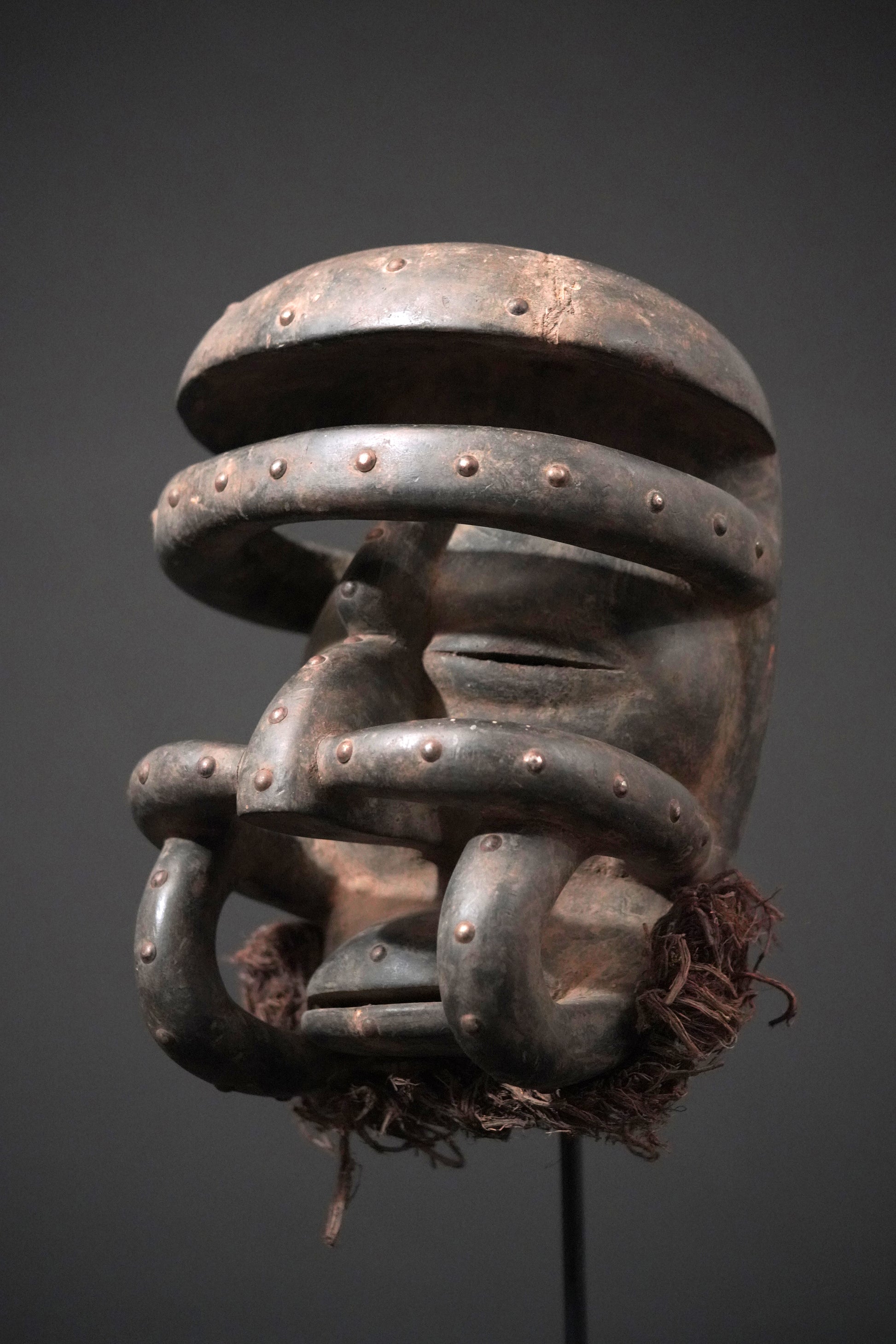 A Kran / Guerre mask with rivets and a rest of raffia; dark brown to black patina, a damage on the top.
