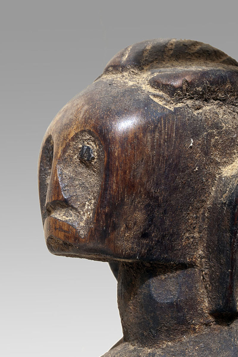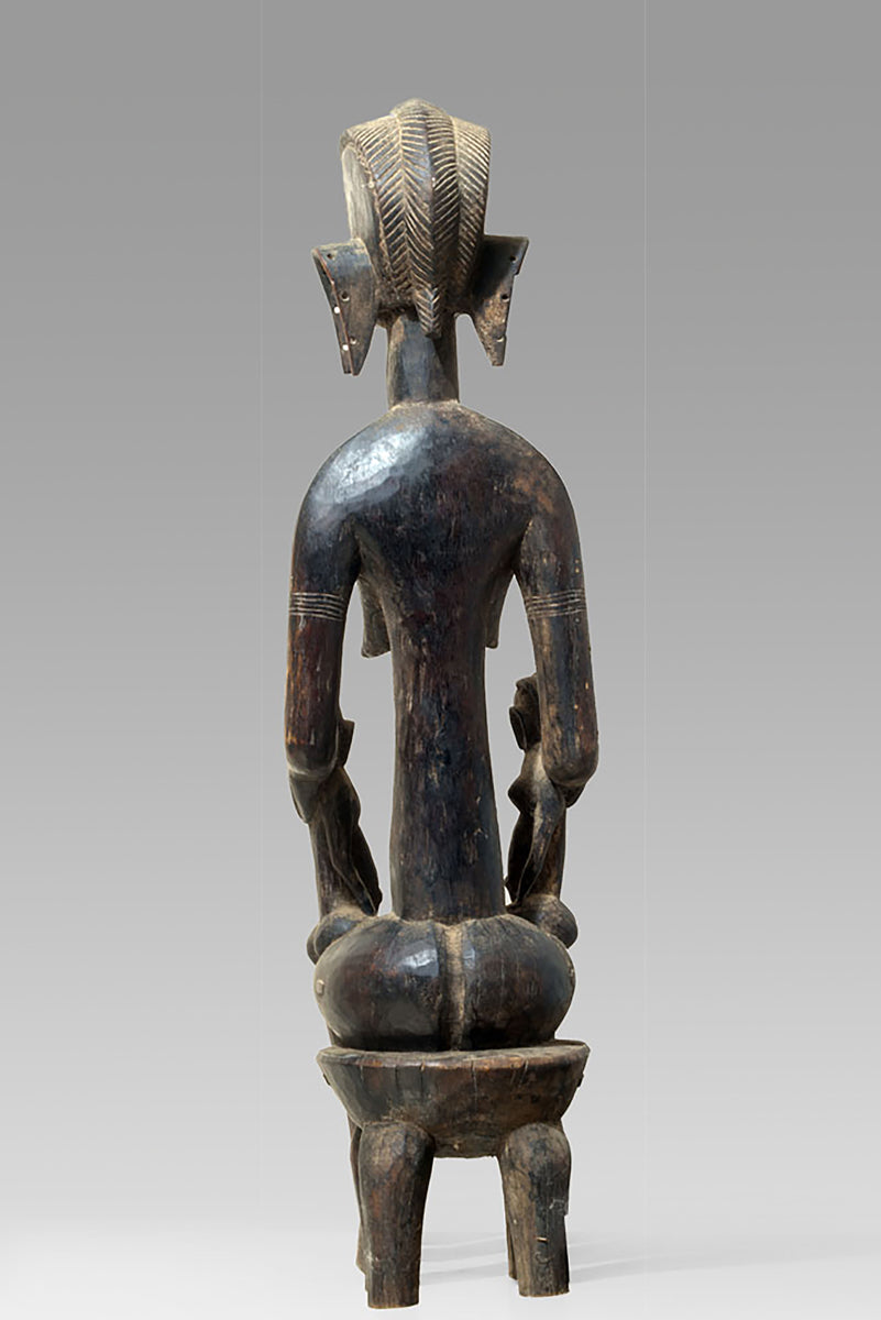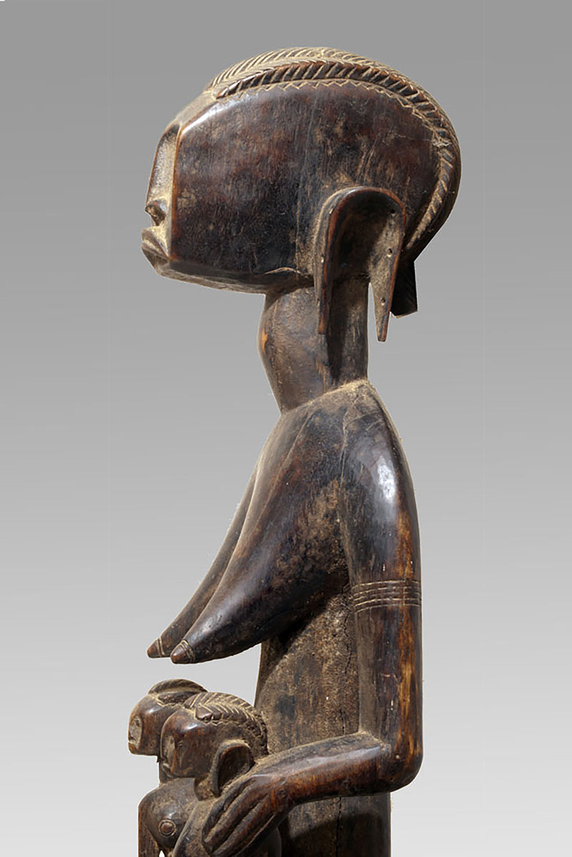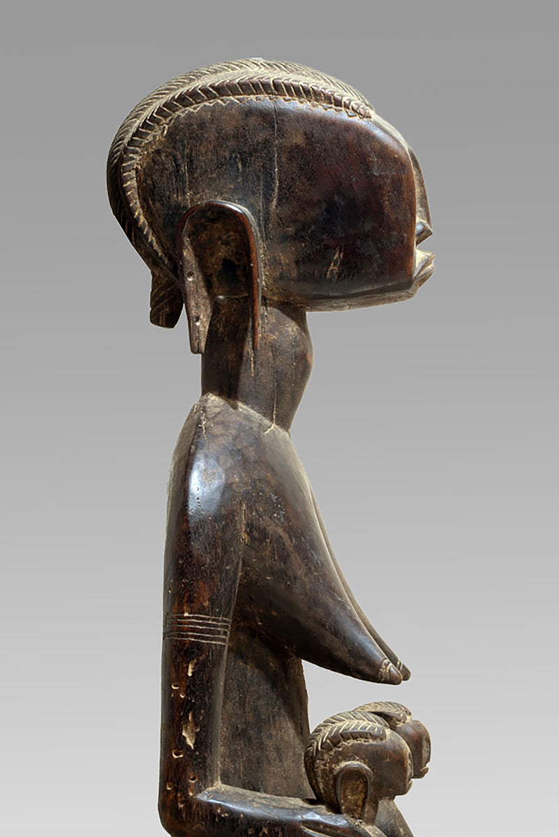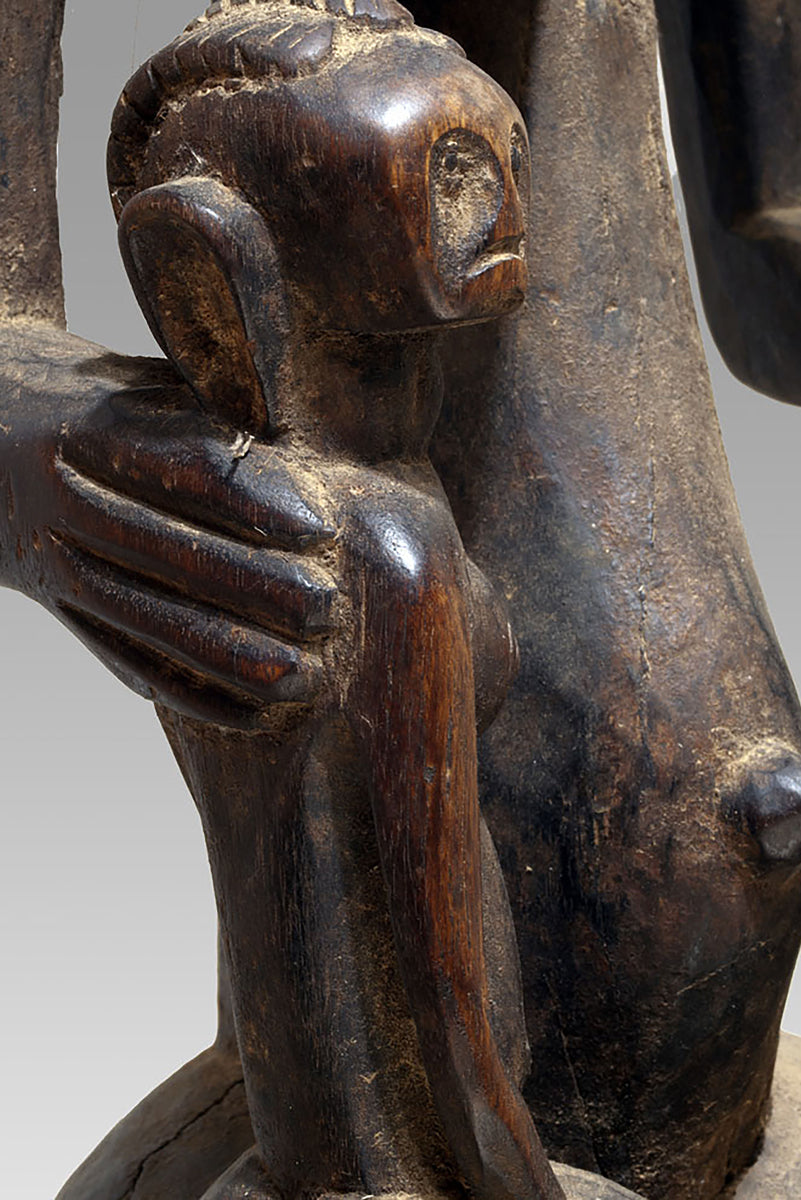 The maternities of the Bamana from the Massigui–Dioïla region occupy a distinctive position within the sculptural corpus of southern Mande societies. They articulate the ideological weight of motherhood through a restrained formal language whose clarity recalls the pedagogical functions of these figures in local initiation and moral instruction. Their appearance is shaped by regional workshop traditions that favour compact volumes and a frontal presentation, often heightened by a slightly columnar proportioning of body and limbs.