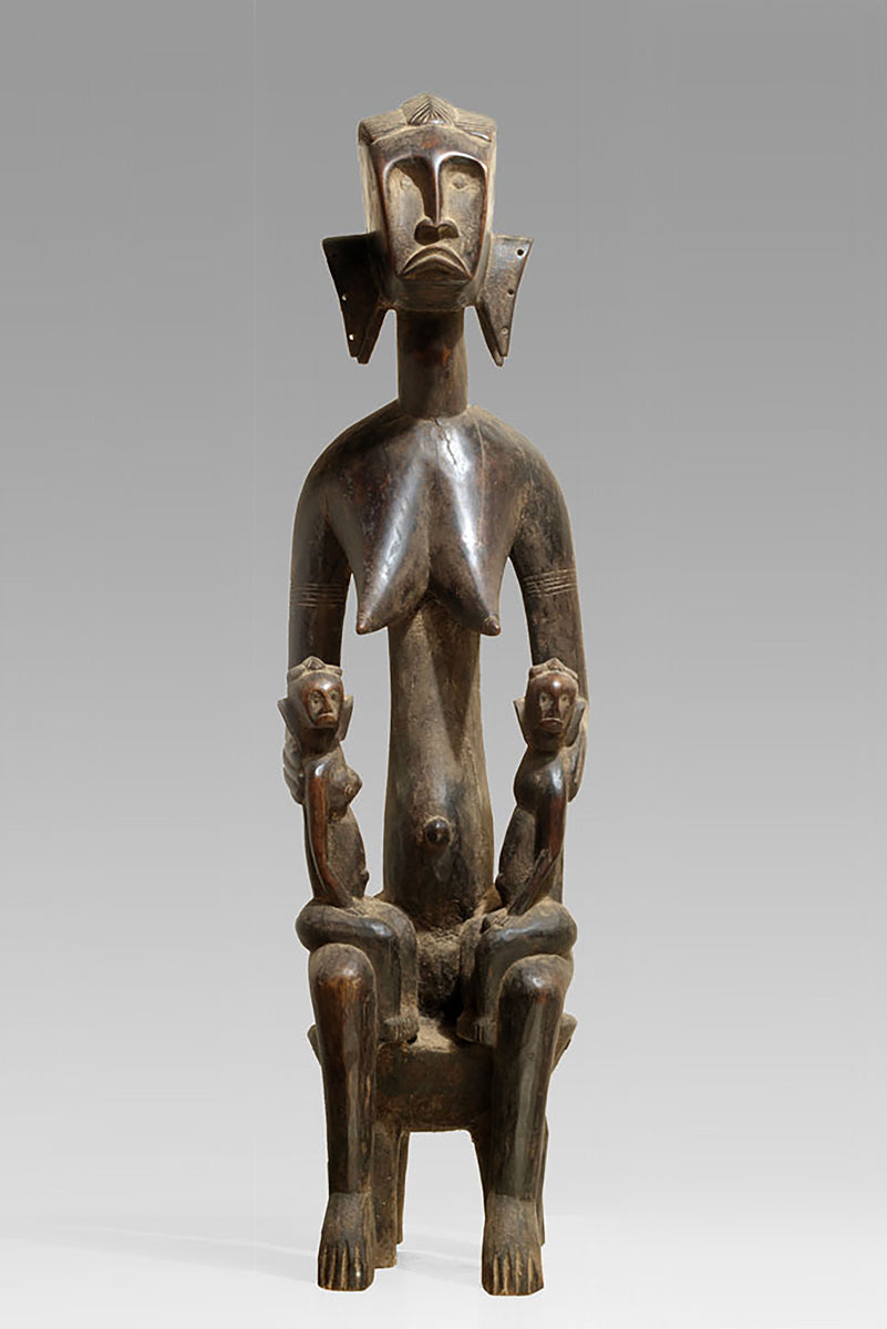 A large Bamna maternity of the Massigui/Doila region, seated on a four leg stool, holding two children, seated on it´s knees, the hanging, tapering breasts with pointed nipples, the rectangular head with metal eyes in deep sockets, the headdress in form of a single crested coiffure, large u- shaped ears, pierced through for attachments at the rim; shiny, blackened patina, remnants of oxidised sheebutter in the sockets and close to the nose, intensive touch patina at the face, the breasts and the foreheads of the two children, which remains of the sculptures function: the Bamana-belief of the women by touching these large, important figures creating fertility.