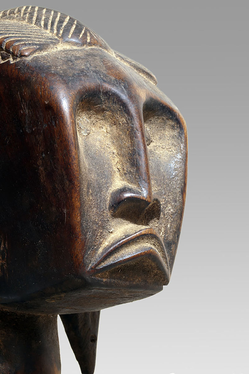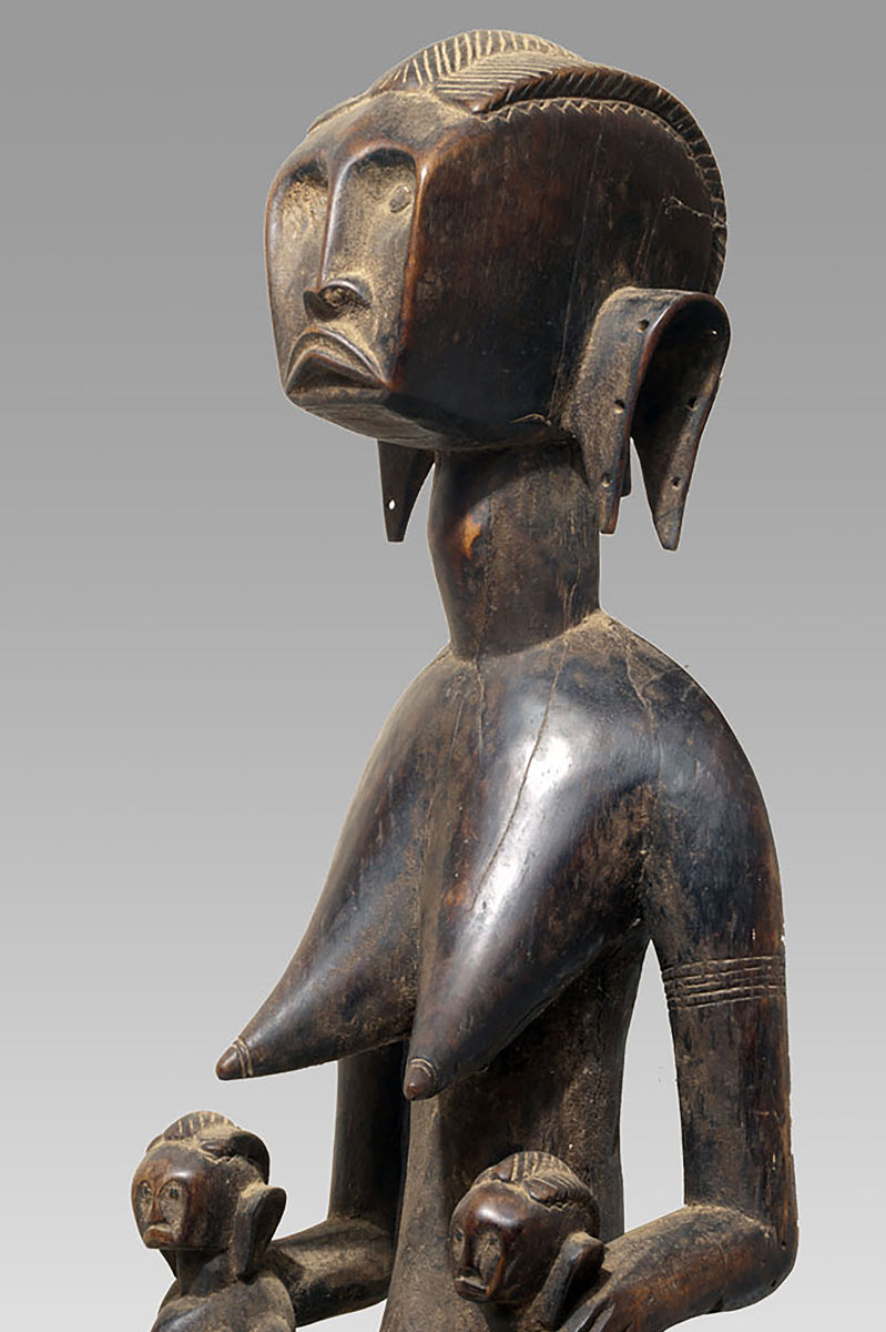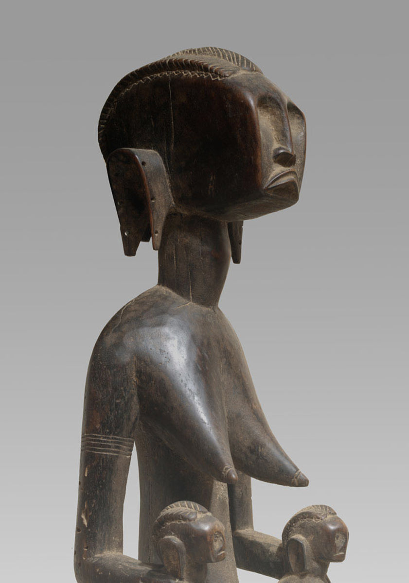 The seated mother, usually placed on a low stool, is rendered with an economy of gesture. The infant is held in a conventionalised manner across the lap or against the torso, establishing an iconographic bond that emphasises continuity between maternal nurture and social reproduction. The faces tend toward an oval or gently trapezoidal mask-form, with high, straight foreheads and narrow, elongated noses. Eyes are often deeply set and only minimally modelled, conveying an introspective quality characteristic of the region’s ritual sculpture. Surface treatment alternates between smooth, carefully burnished planes and rougher passages that retain tool marks, allowing the figure to oscillate between emblematic idealisation and tangible craft.