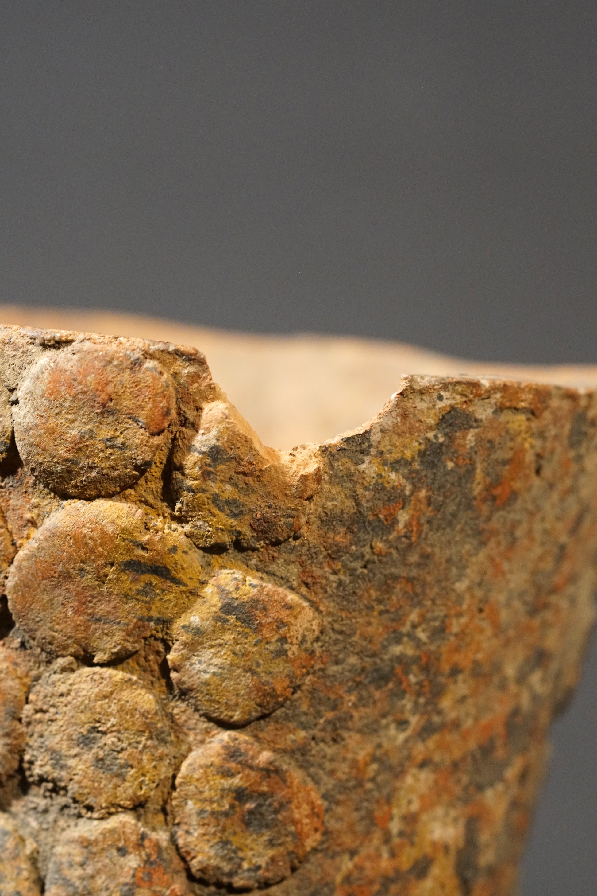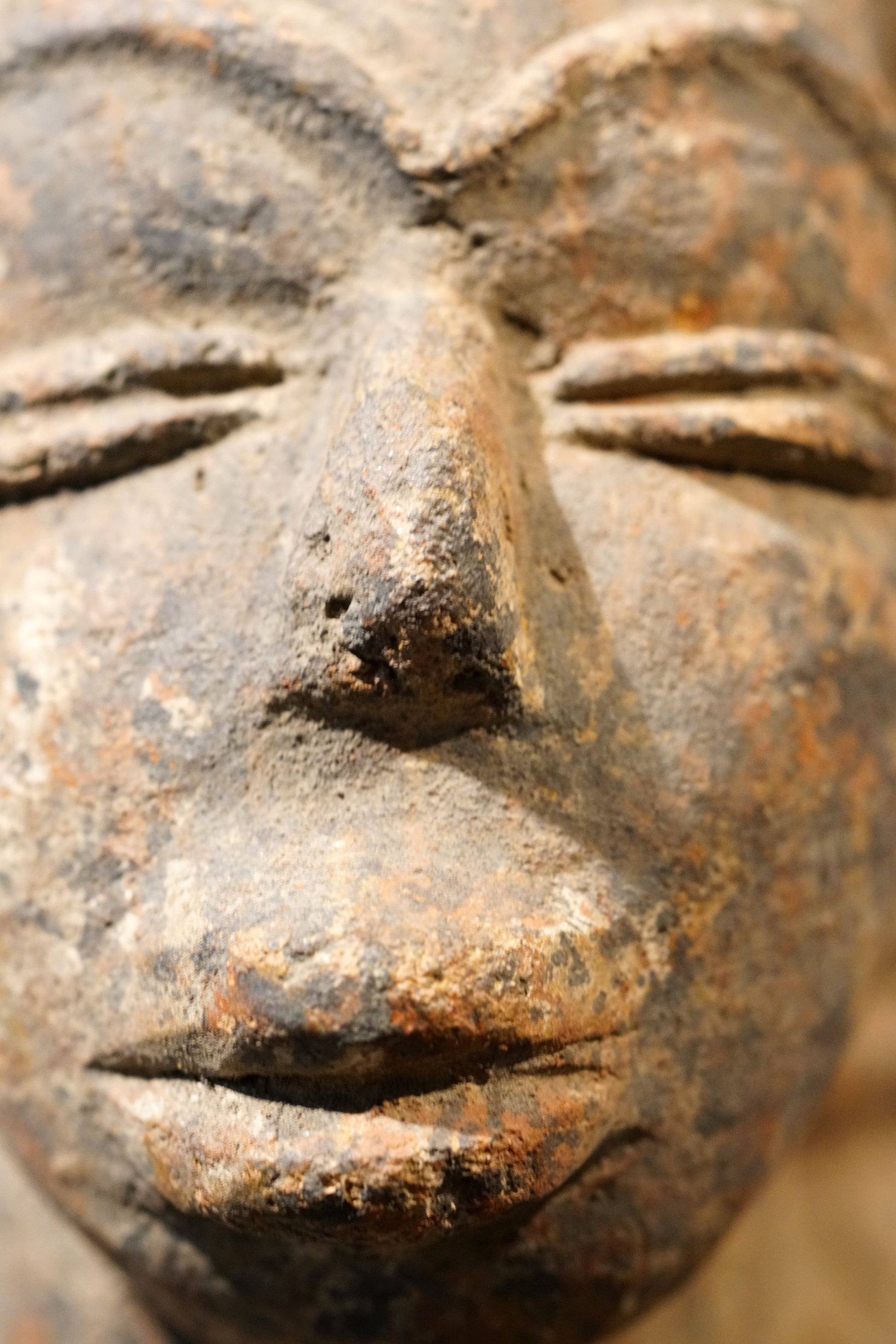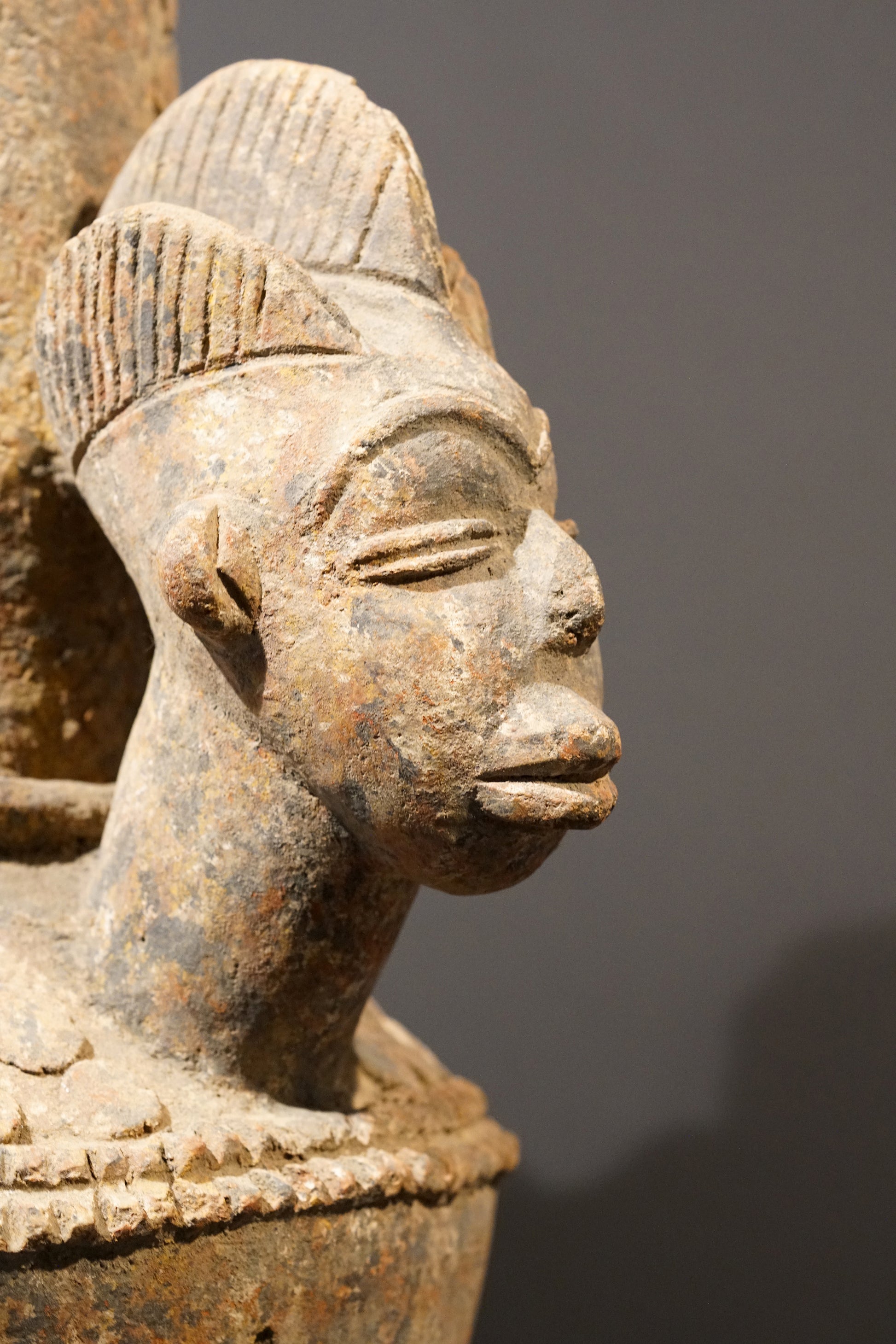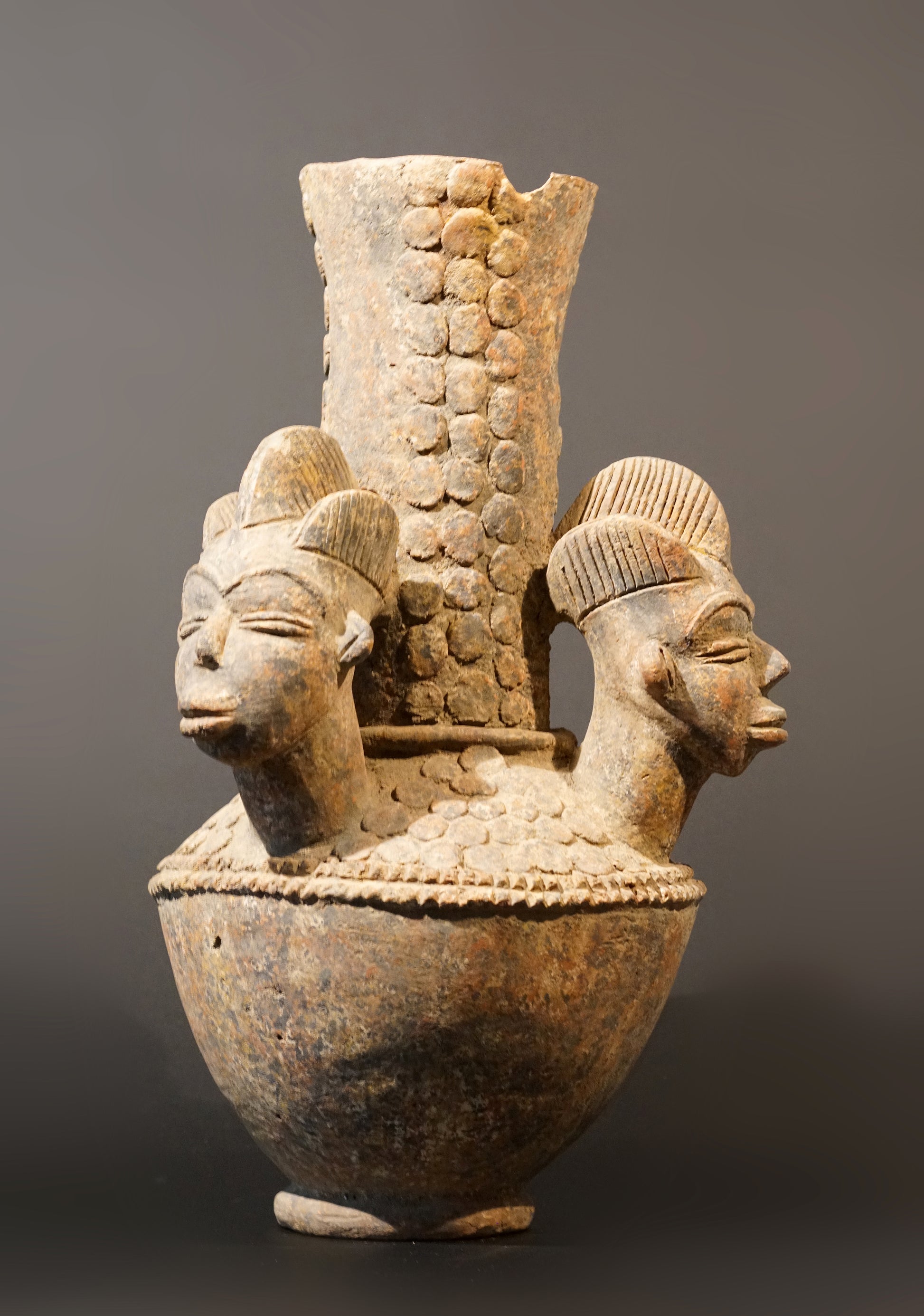 A large Ibo or Calabar vessel with three anthropomorphic heads wearing three-parted coiffures, which is more typical for the Ibo than for the Calabar, significant traces of use and age; fine ochre to reddish, smooth patina, a small piece at the rim is missing but in general of good condition.