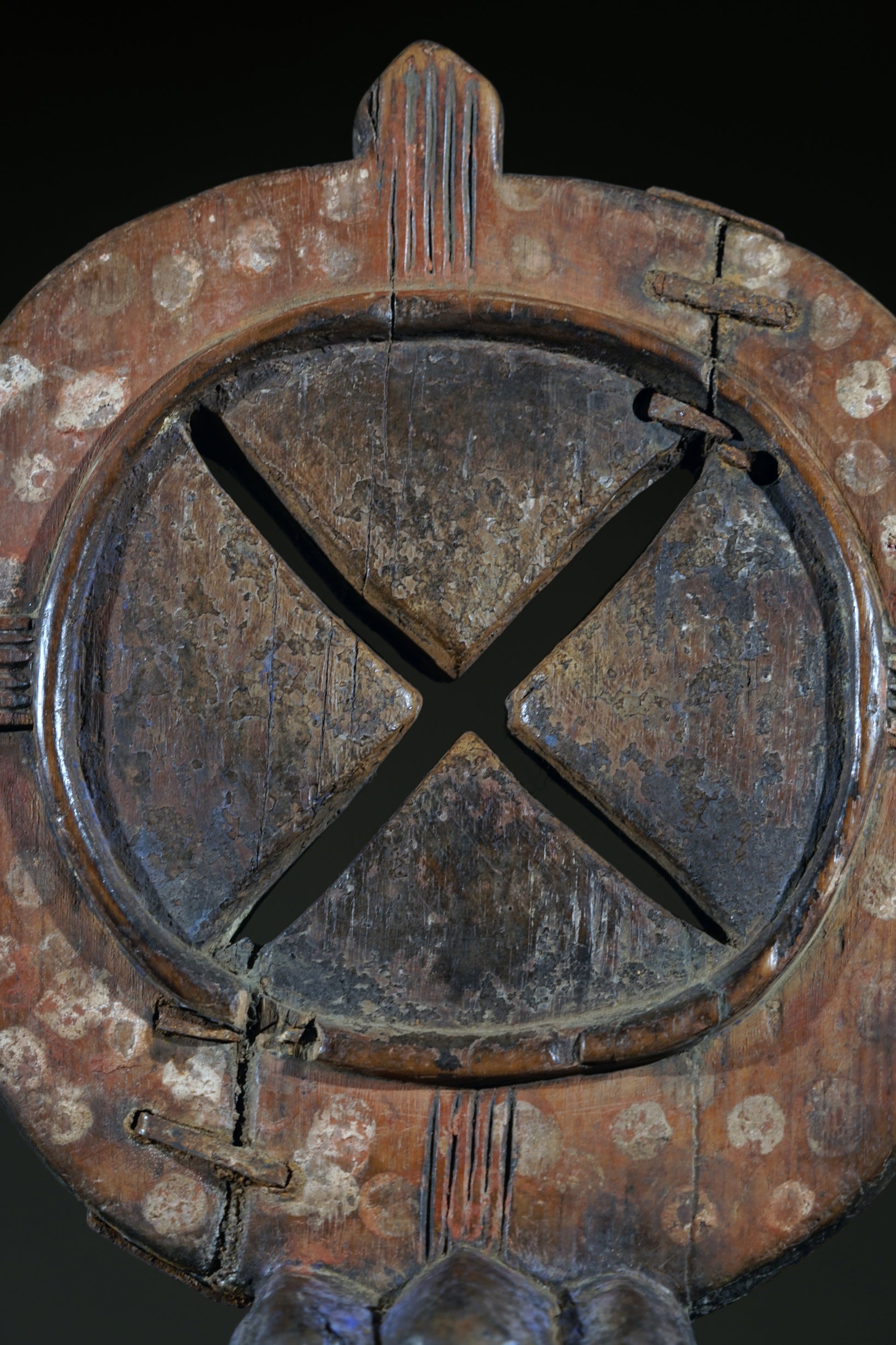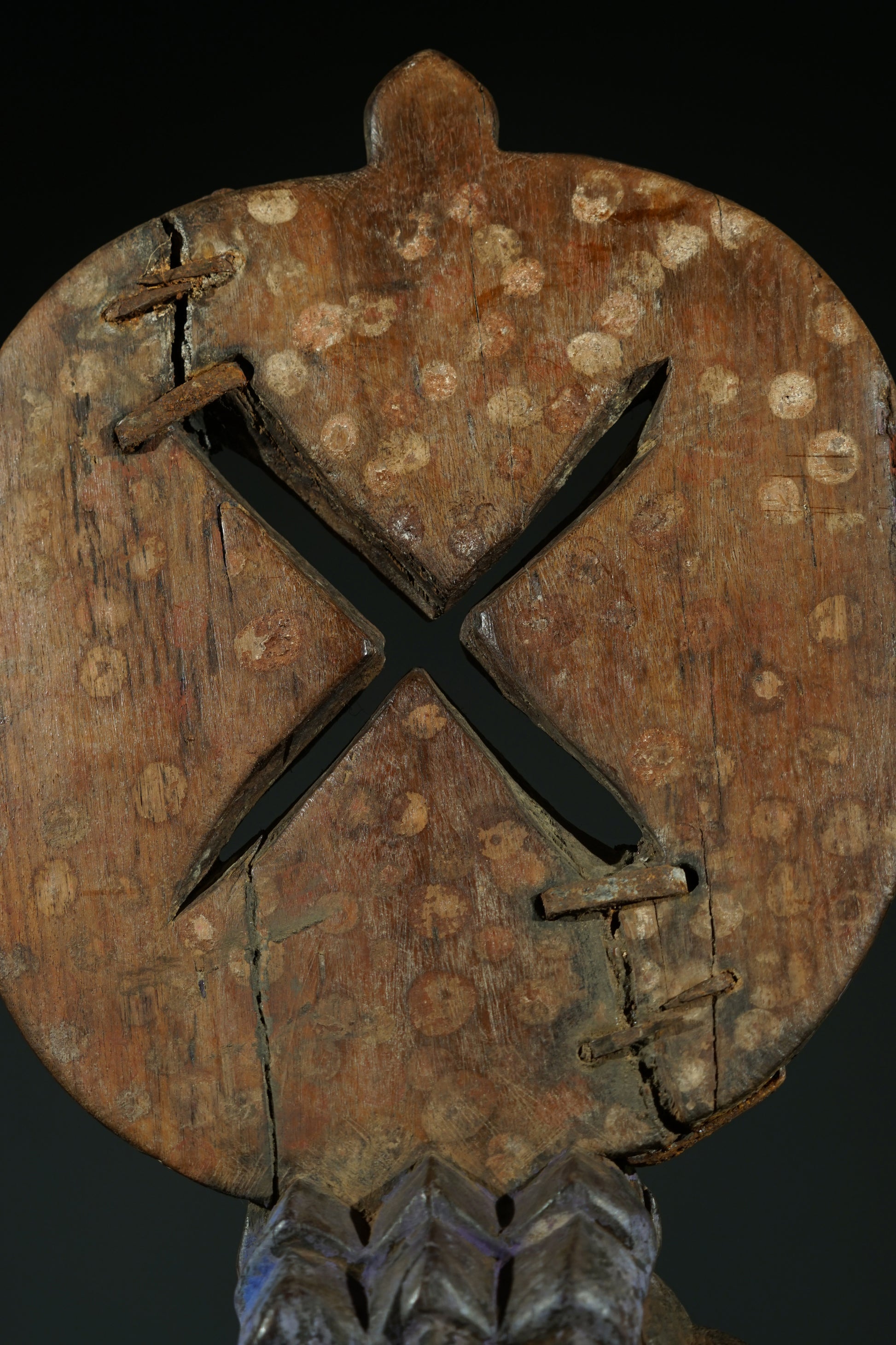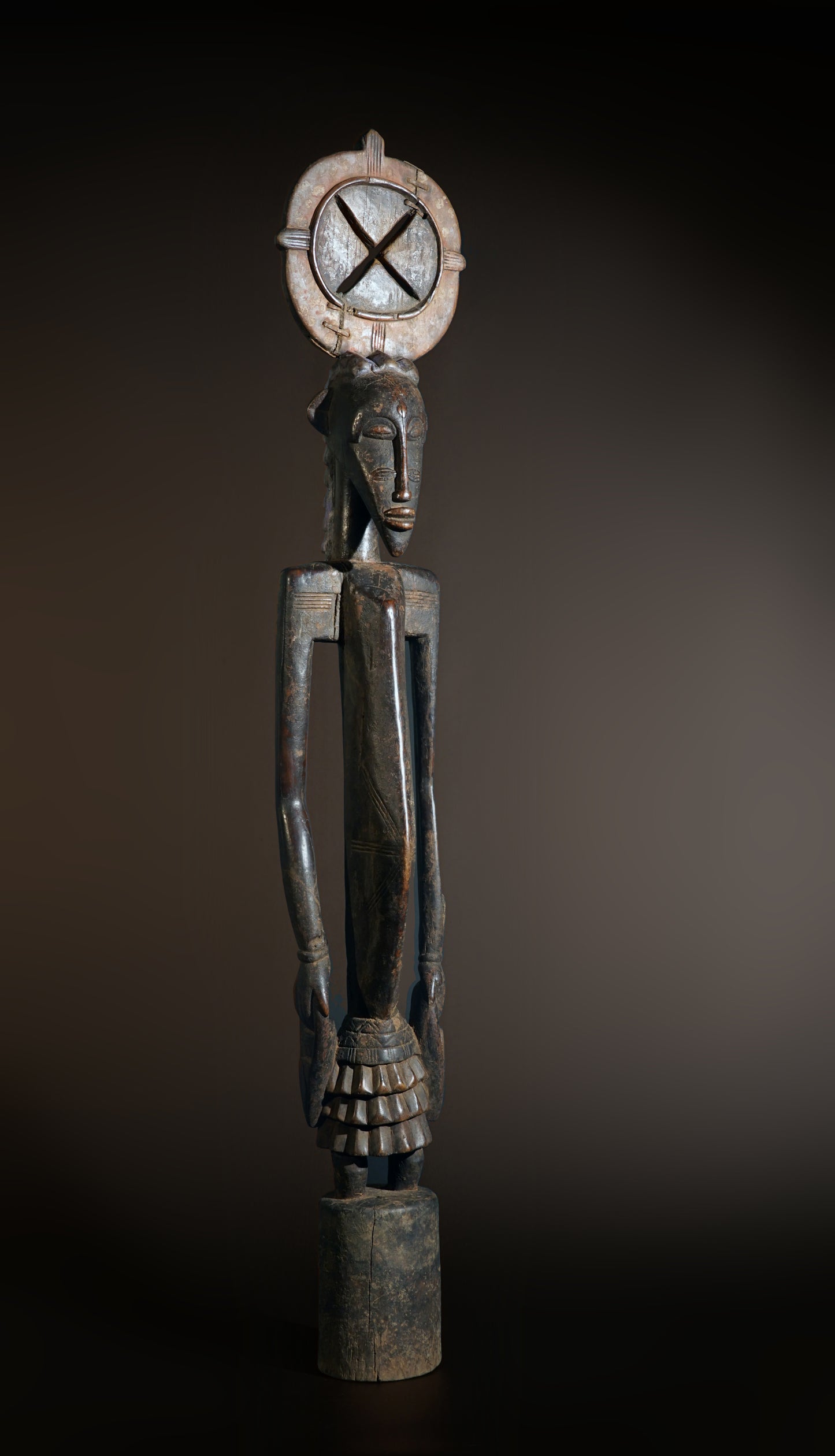 A large, male Senufo sculpture, standing on a cylindrical base related to the well-known Rhythm Pounders, "Deblé", holding two dancing bells in its hands, on top of a circular shield with an x-shaped cross, pierced through, collected in the Diavala village, between Korhogo and Ferkessedougou, 20 km from the border of Ivory Coast and Burkina Faso, heavy hard "Lenge" wood (not a Senari a Djula word), the right arm partly fragmentary, remnants of reddish and blueish pigments.