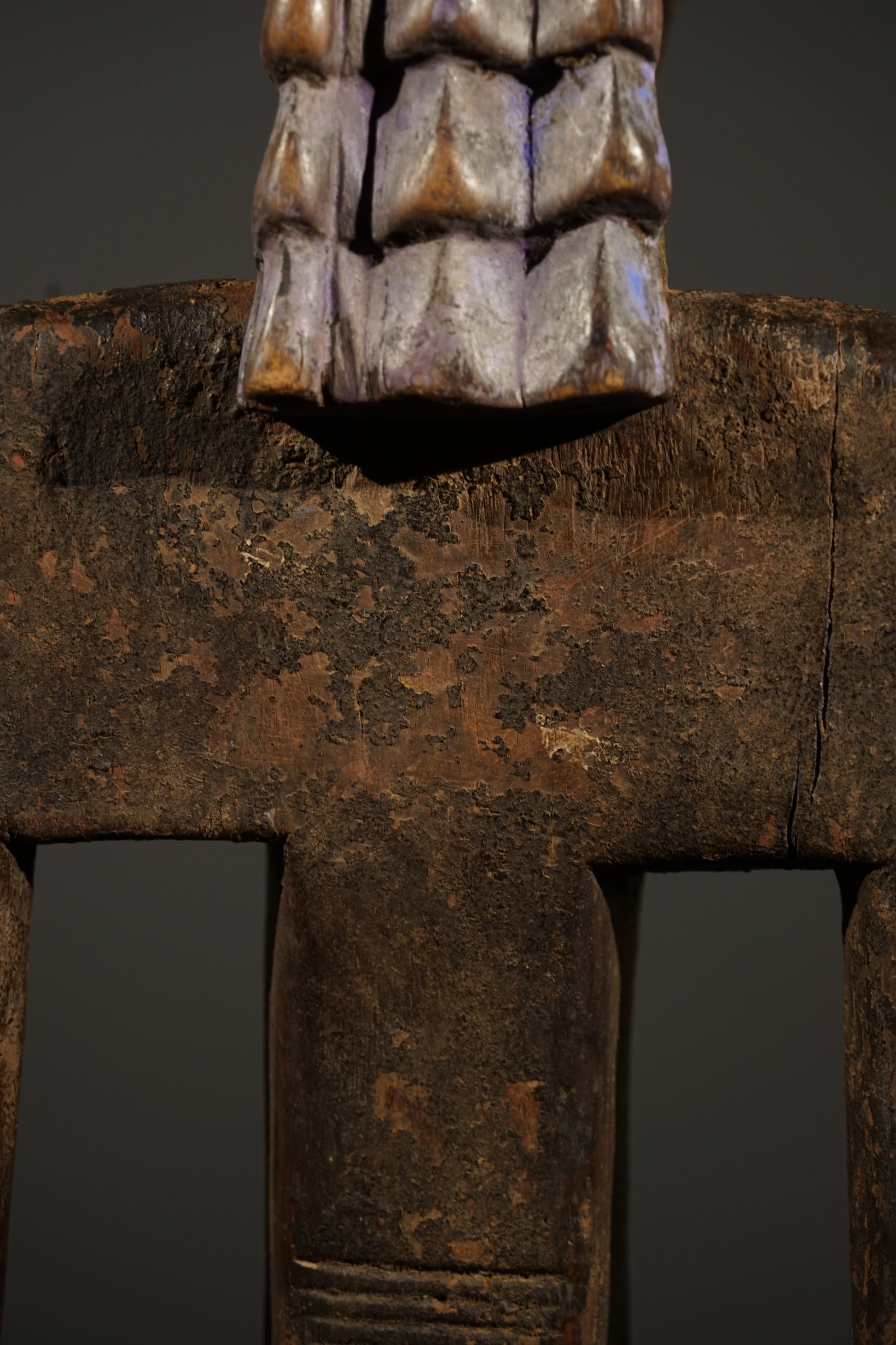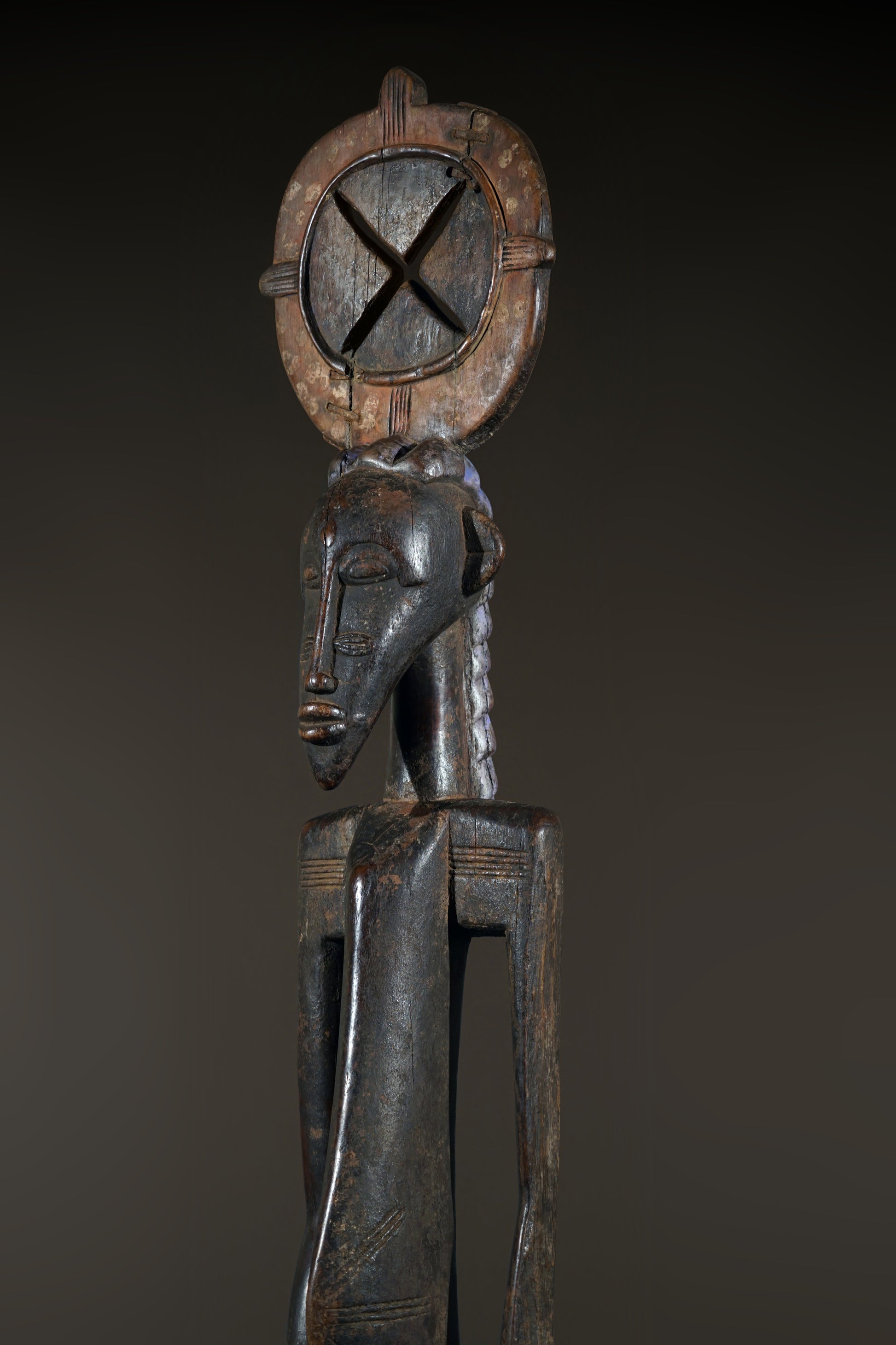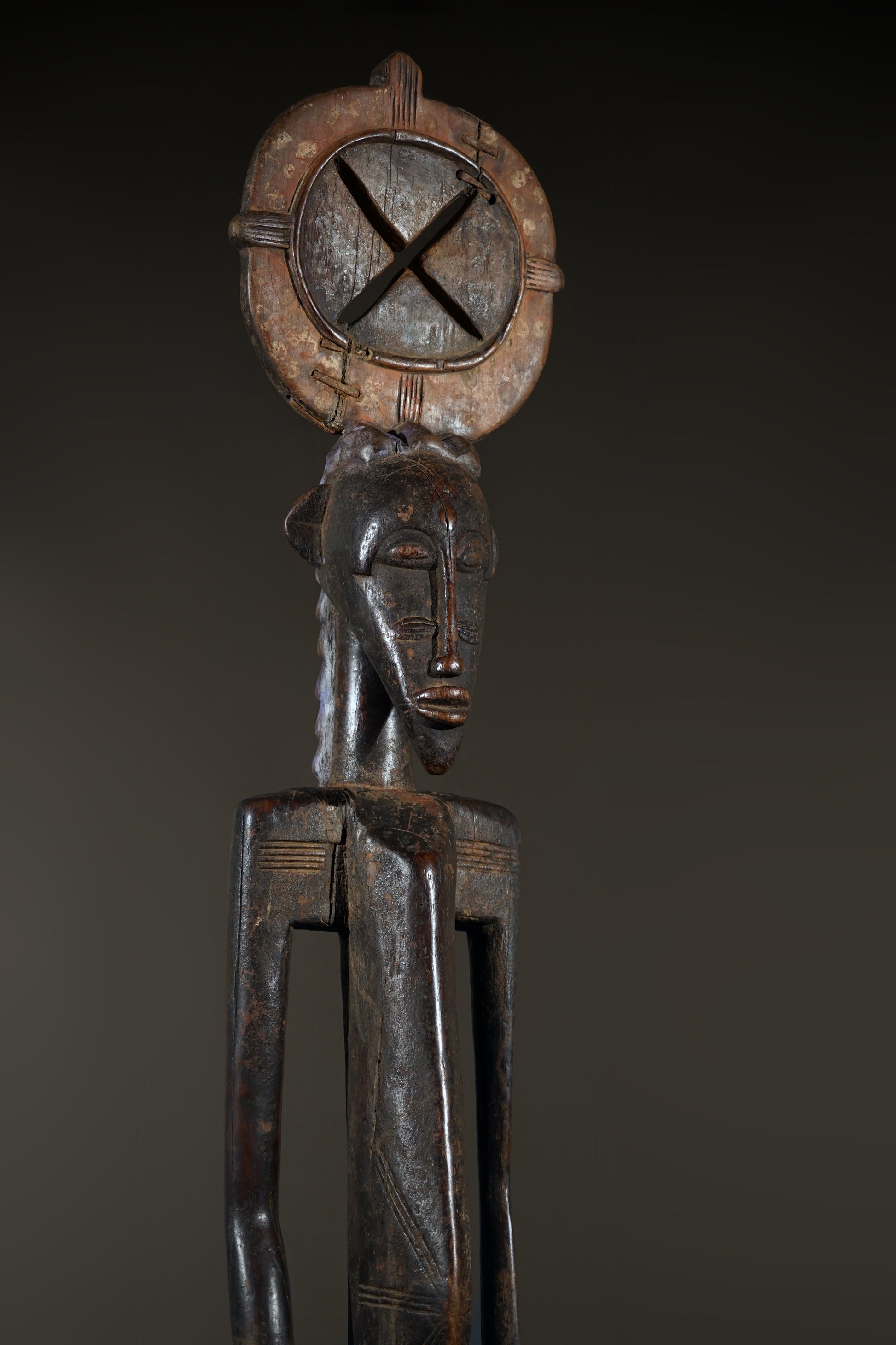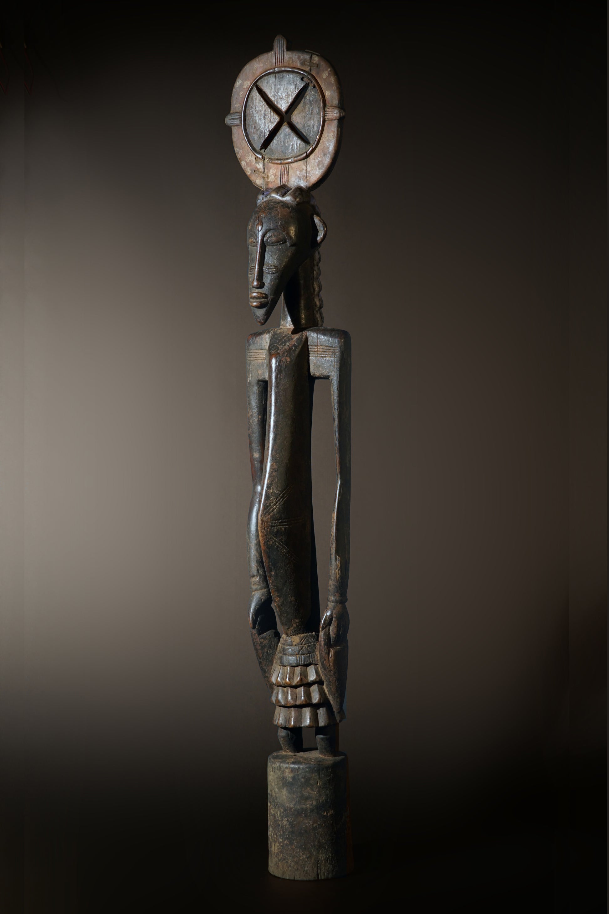 A large, male Senufo sculpture, standing on a cylindrical base related to the well-known Rhythm Pounders, "Deblé", holding two dancing bells in its hands, on top of a circular shield with an x-shaped cross, pierced through, collected in the Diavala village, between Korhogo and Ferkessedougou, 20 km from the border of Ivory Coast and Burkina Faso, heavy hard "Lenge" wood (not a Senari a Djula word), the right arm partly fragmentary, remnants of reddish and blueish pigments.