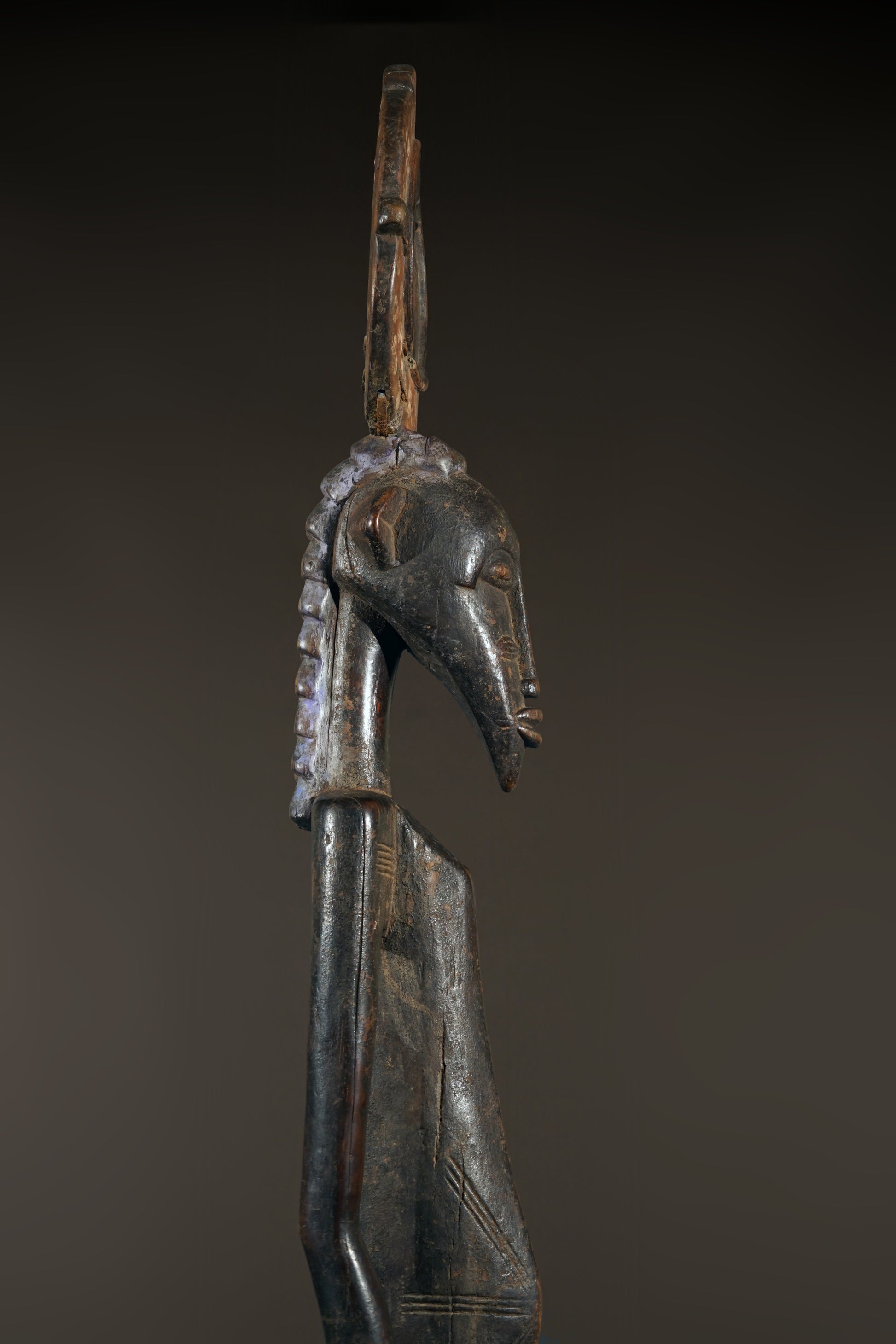 photo: Deblé and Guardian sculptures during the Senufo exhibition in the Wolfgang Jaenicke Gallery, Berlin, the fourth sculpture from left is the high-aged Guardian sculpture surmounted with a circular panel, a rare example of the Northern Senufo style of the Ivory Coast.