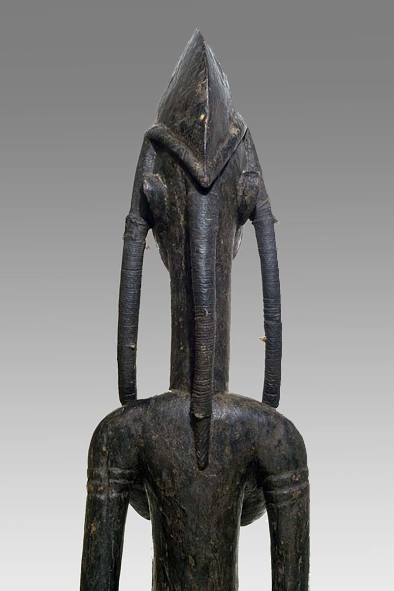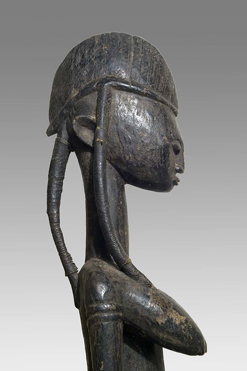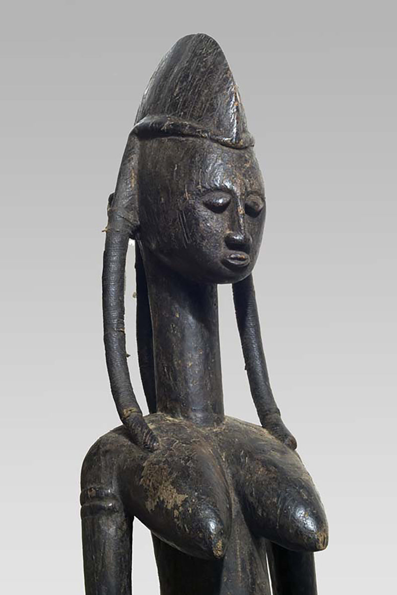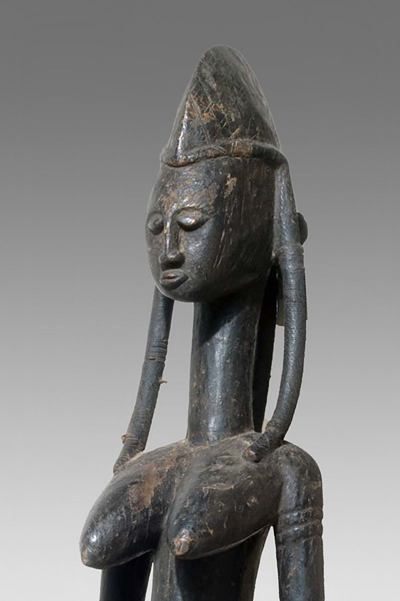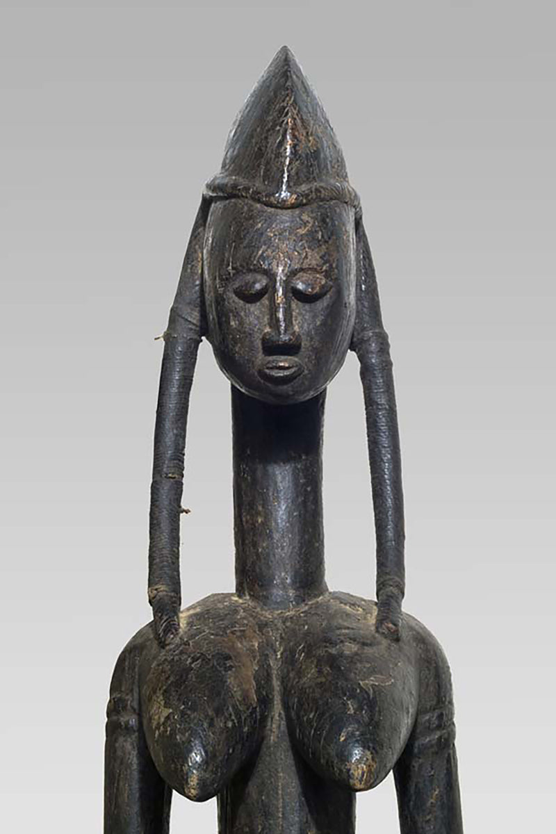 Muso Massa sculptures from Godjiila (Kuruma region) are large, carved female figures that function as emblematic representations of the highest-ranking woman in the village—often the wife or principal female of the village chief—and serve a visible role in the social and ritual topography of Bamana-speaking communities in the wider Kuruma area. s. Wolfgang Jaenicke Gallery