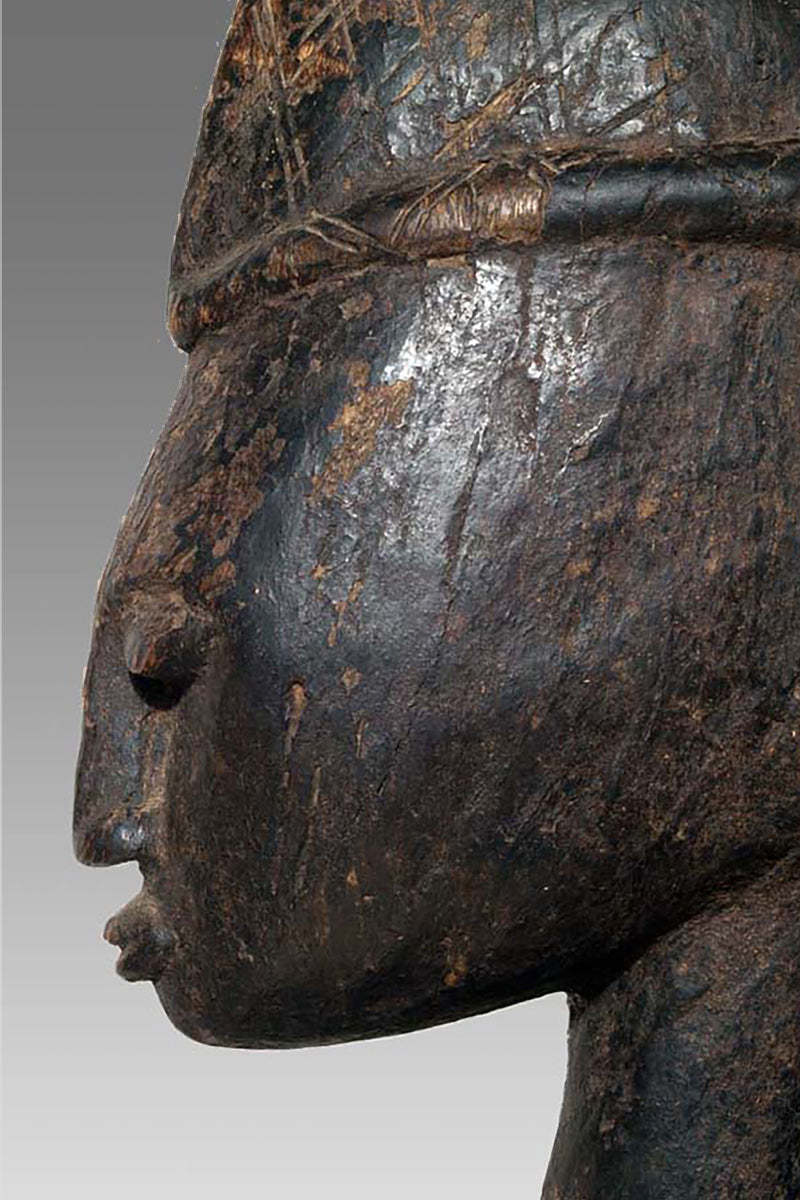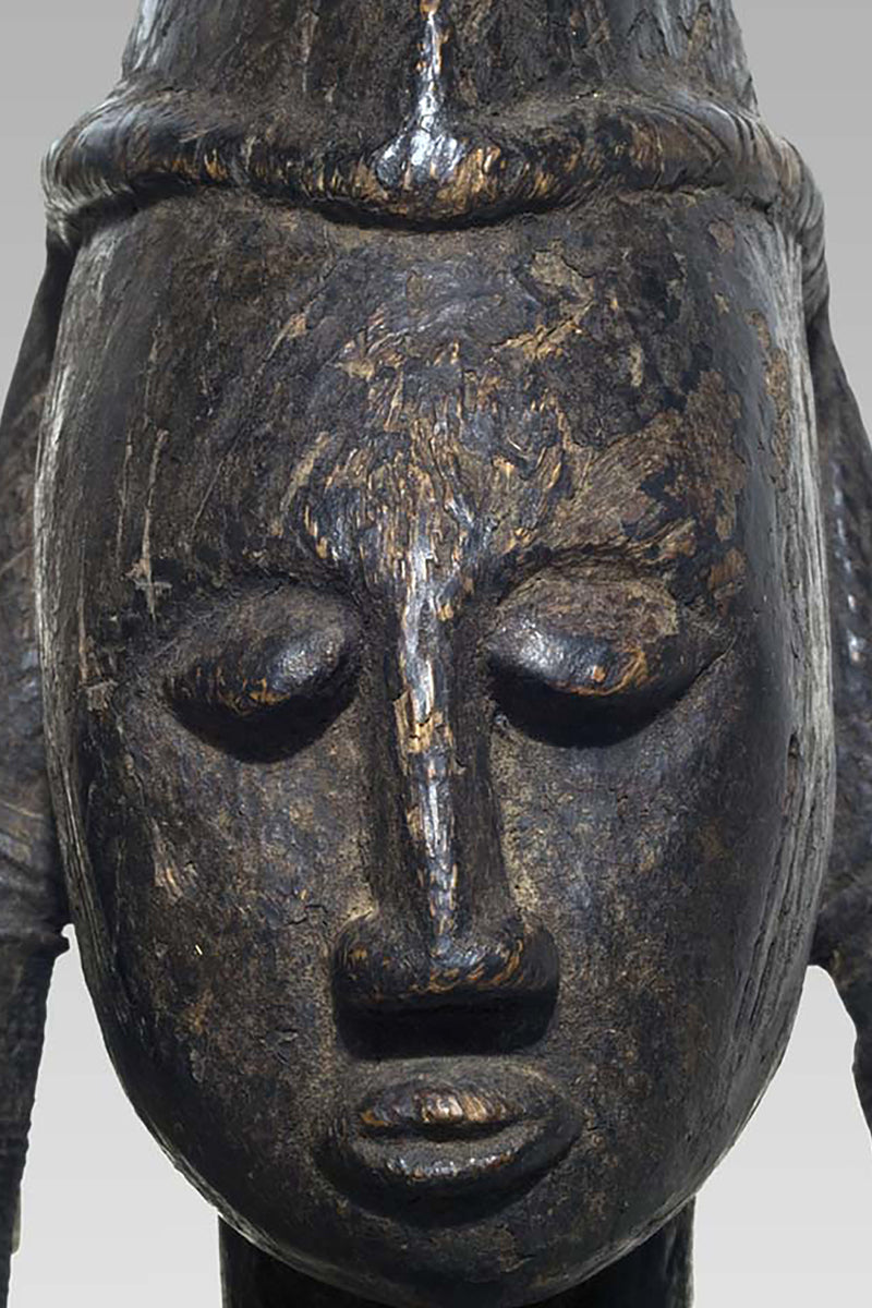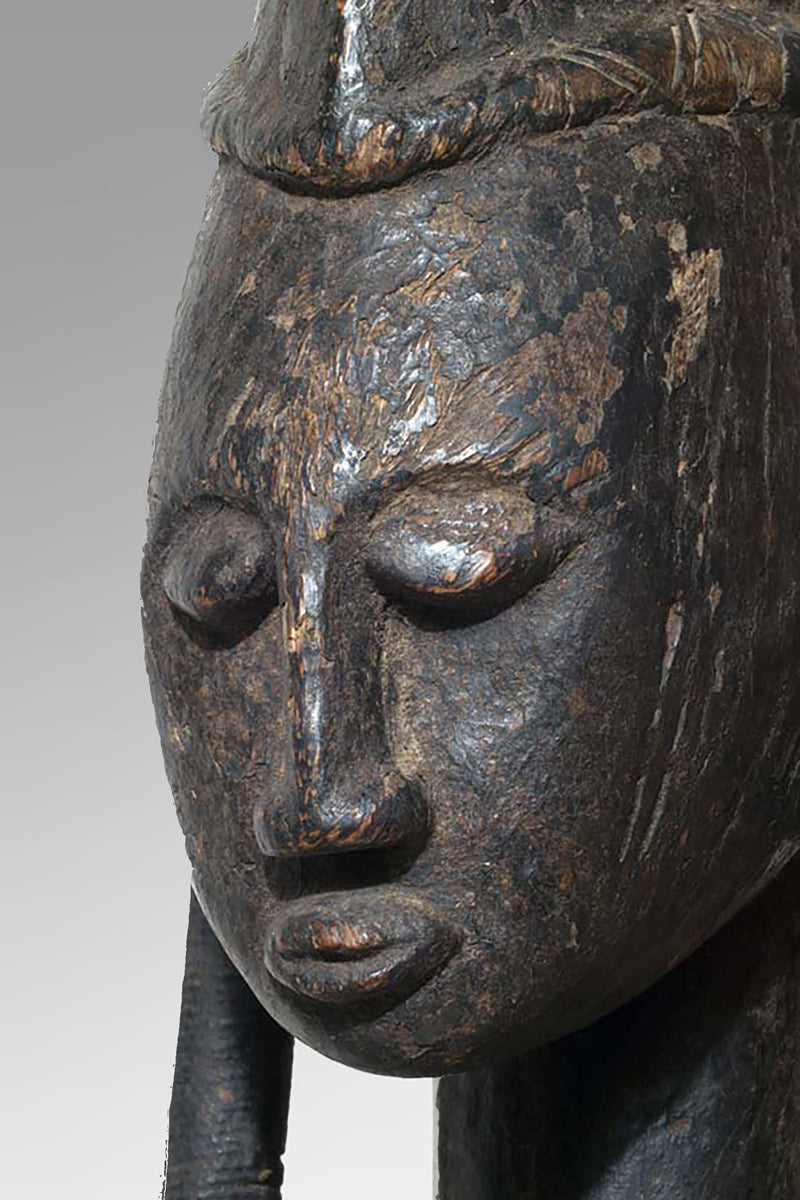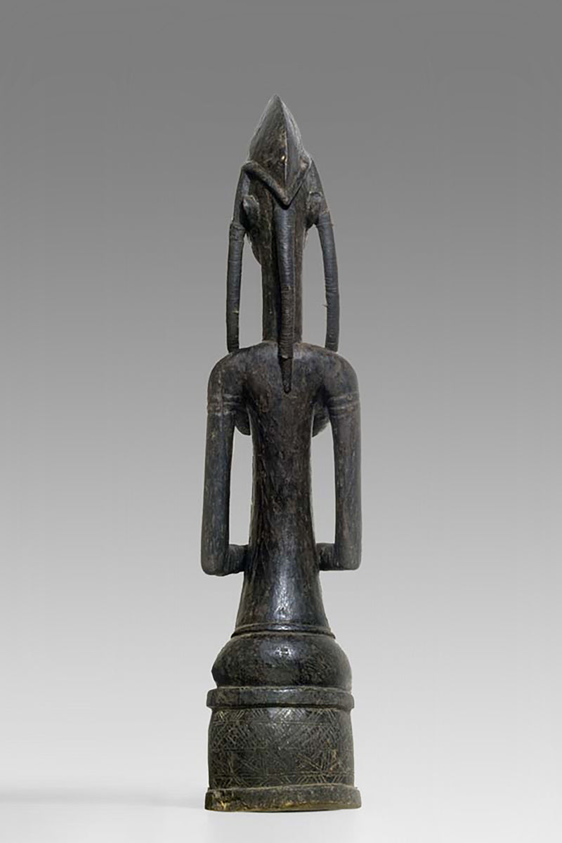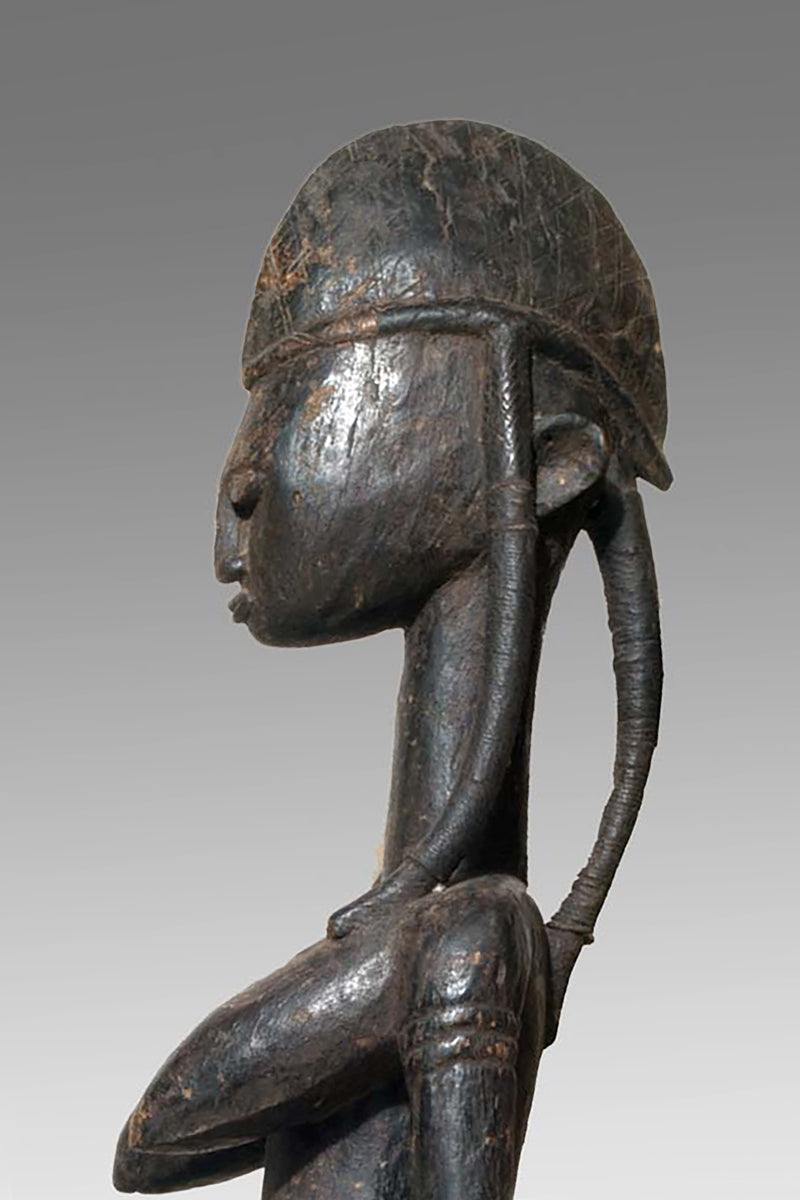 Formally the Muso Massa is notable for an emphatic, upright presence: generically tall in scale, frontal in orientation, and often wearing distinctive local headgear (recorded examples from Godjiila include a Koakoto-style hat). These figures appear in the material record of the Kuruma region and in collecting documentation as discrete named types related to, yet formally distinct from, other Bamana sculptural categories such as the Gwandusu and Dokamissa. Provenance notes in sale and collection records place a large Muso Massa from Godjiila c. 80 km from Ségou in the Kuruma zone; audiovisual documentation and catalogue descriptions from field collections corroborate these attributions