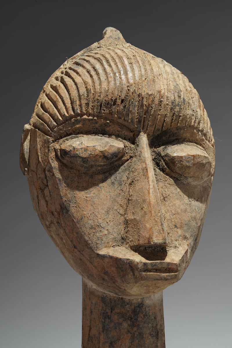 A Lobi headstake (baathil / pole head), Kampti village, Poni province (Burkina Faso). Wood, traces of kaolin pigments.The object is a carved human head mounted on an elongated, post-like neck intended for insertion into the ground; the facial treatment is schematic with almond-shaped eyes, a trapezoid nose, a small pointed mouth and a relief-like coiffure forming a cap with a crest.