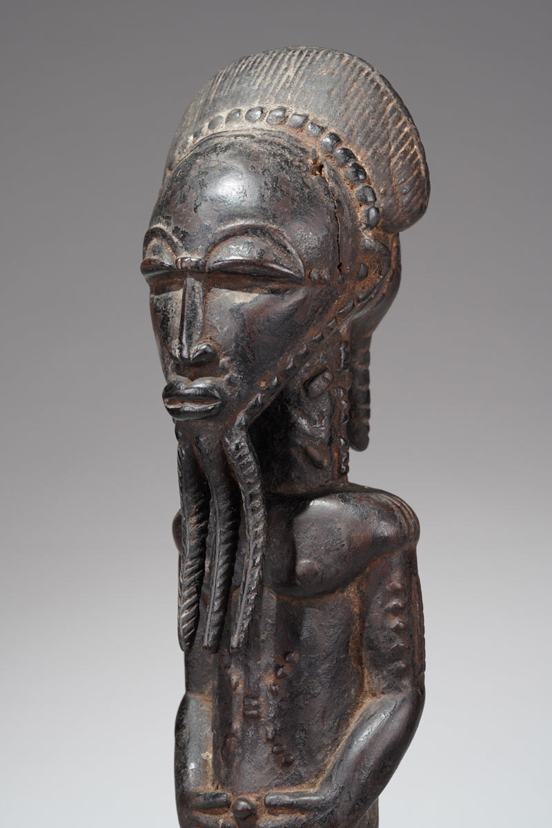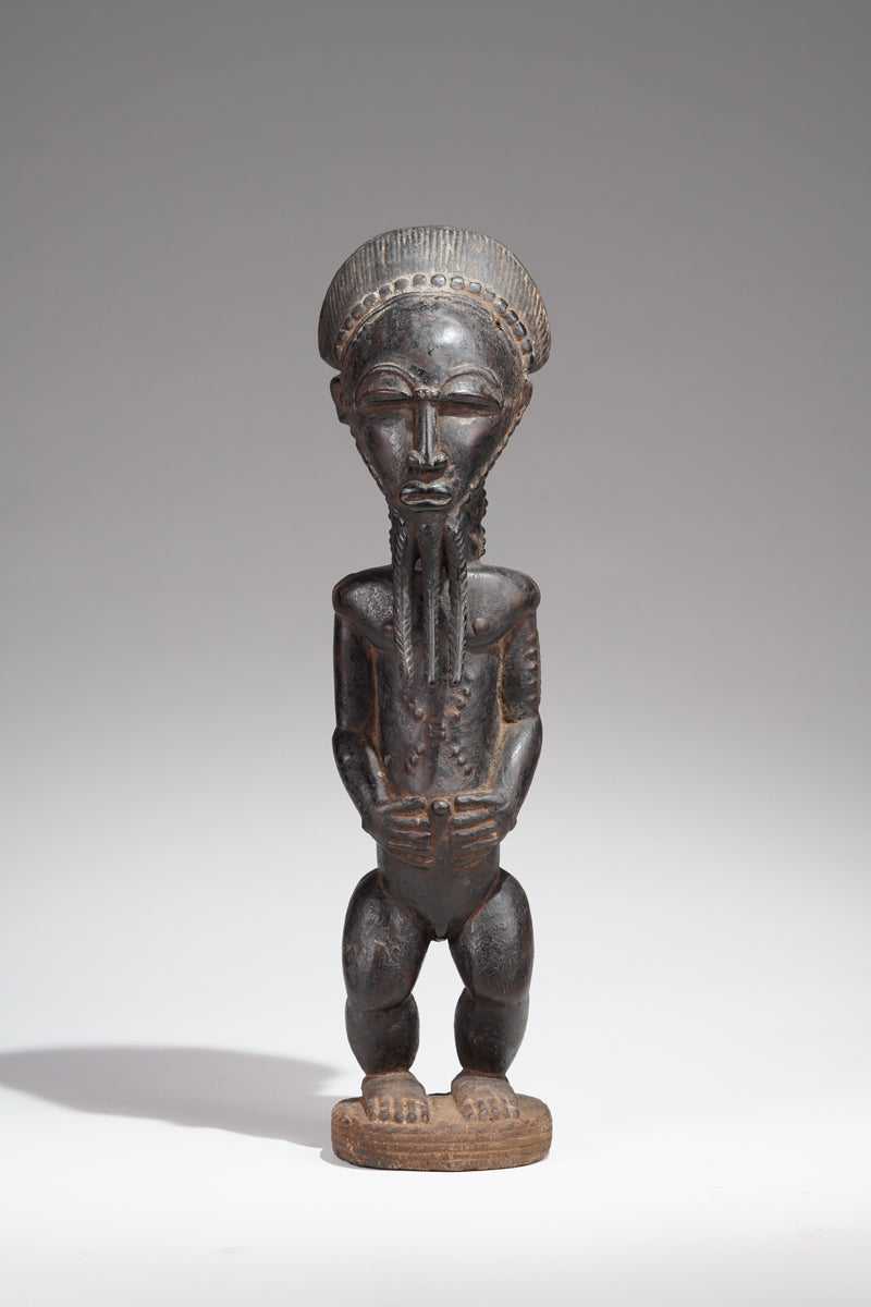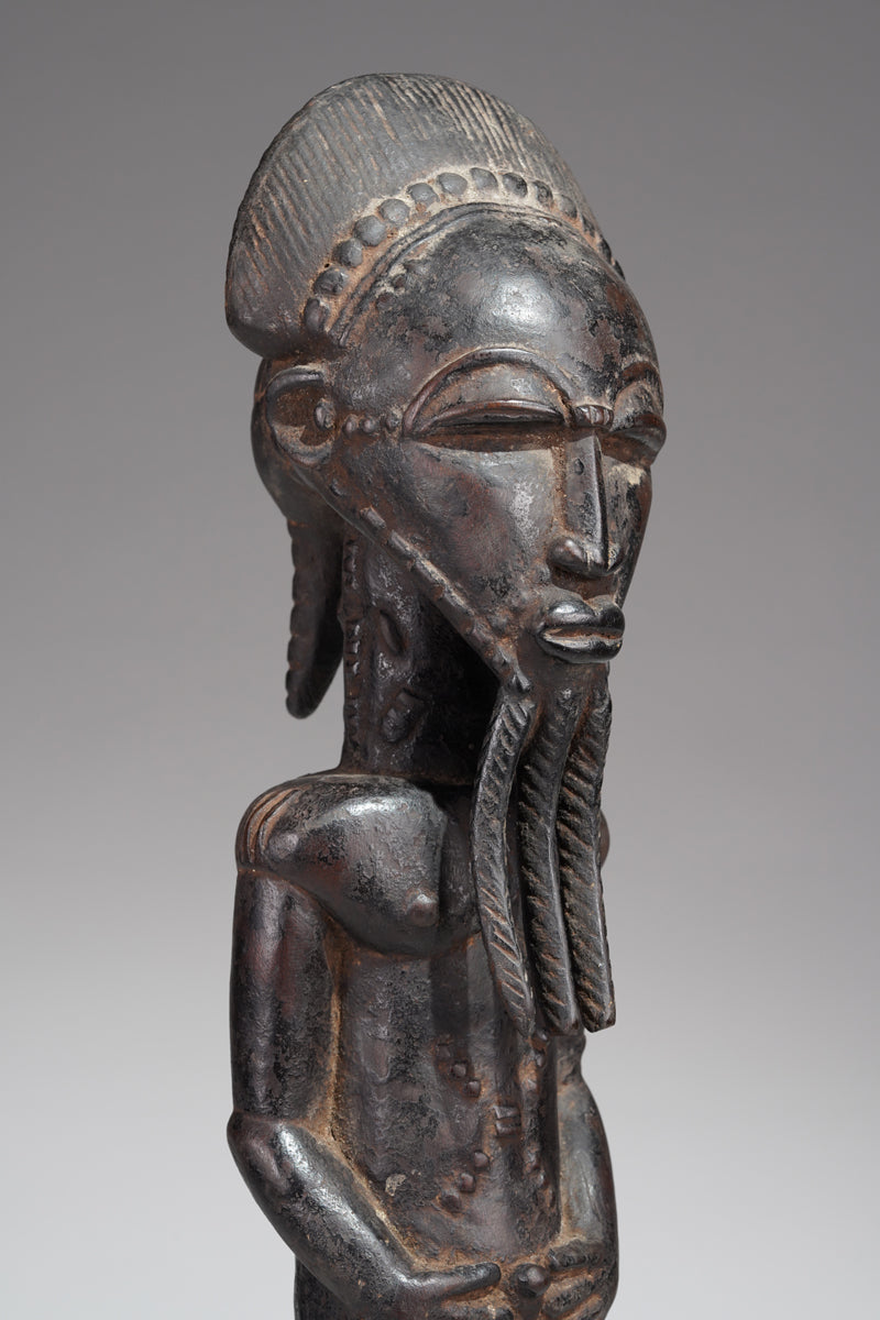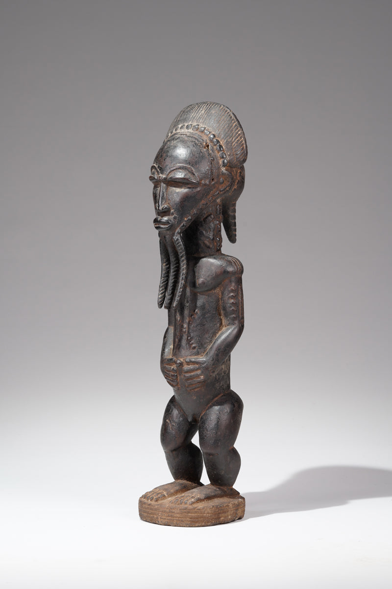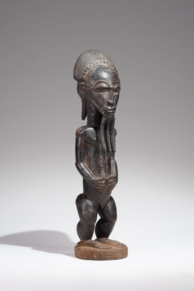 A male Baule, Blolo Bian sculpture, Ivory Coast, Sakassou, from a known workshop identified by Susan Vogel in 1994 as the "Nzipri workshop". The figure stands on a rounded base, the feet are disproportionately large, while the legs are short, strong gluteae, the genitalia is concealed by a loin cloth, a stocky torso decorated on the front and back with fine, elaborate scarification, as is the strong neck, the elegantly angled hands rest below the pointed navel on the abdomen, the teardrop-shaped head has a braided three-part beard. The hairstyle is divided into several very elaborately and differently designed braided sections. The face with its lowered gaze expresses an inward-turned calmness, characteristic of this traditional Sakassou workshop; remnants of sacrification,s cations:collected by Aboubakar Bakayoko, Abidjan, Ivory Coast. Certificate of Origin and Provenance.