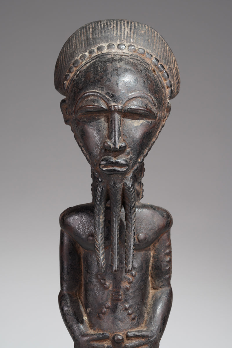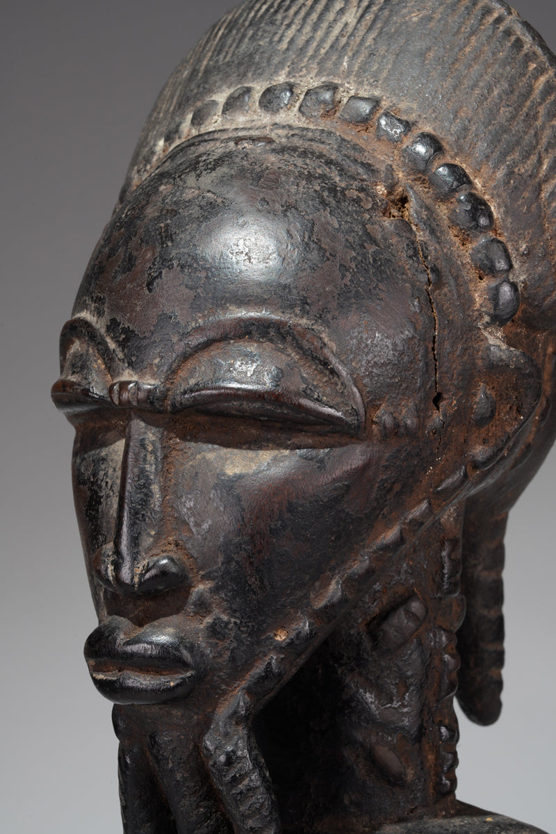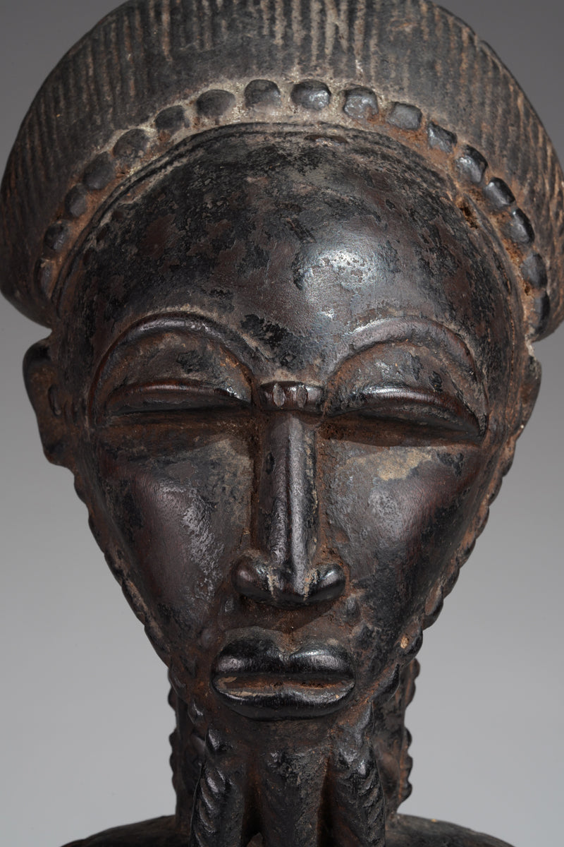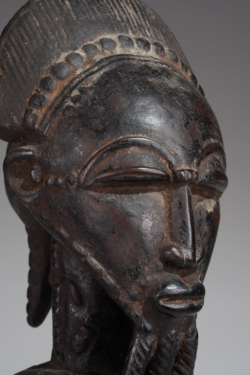 "To the Western eye, an essence of Baule style is a balanced asymmetry that enlivens while suggesting stability and calm. [...] To an art historian, the most consistent feature of Baule art, and one expressed across the wide variety of Baule object types, is a kind of peaceful containment. Faces tend to have downcast eyes and figures often hold their arms against the body, so that Westerners might feel that the mood of much classical Baule art is introspective." Susan Vogel.