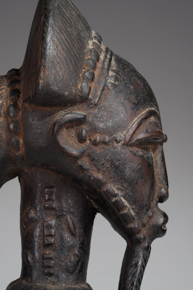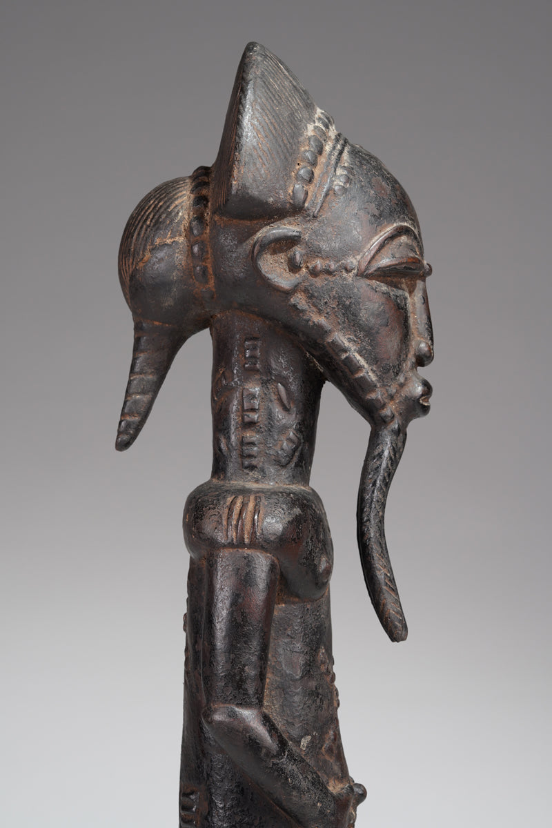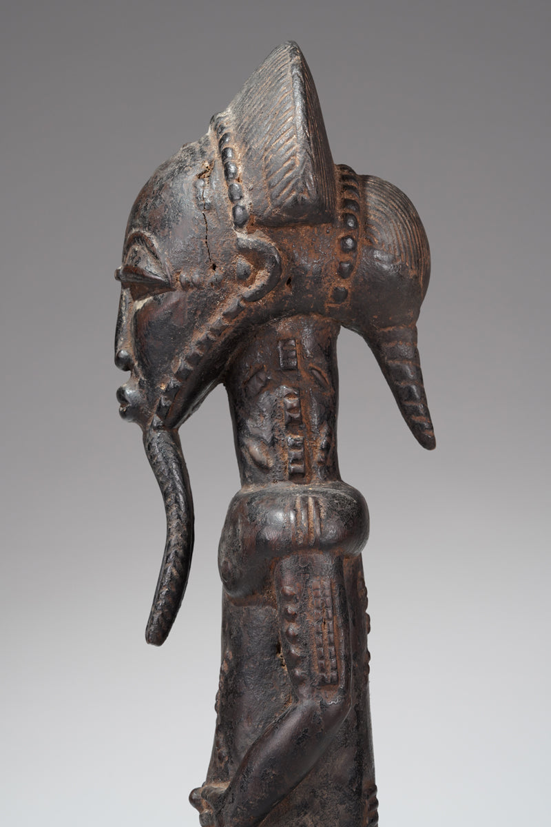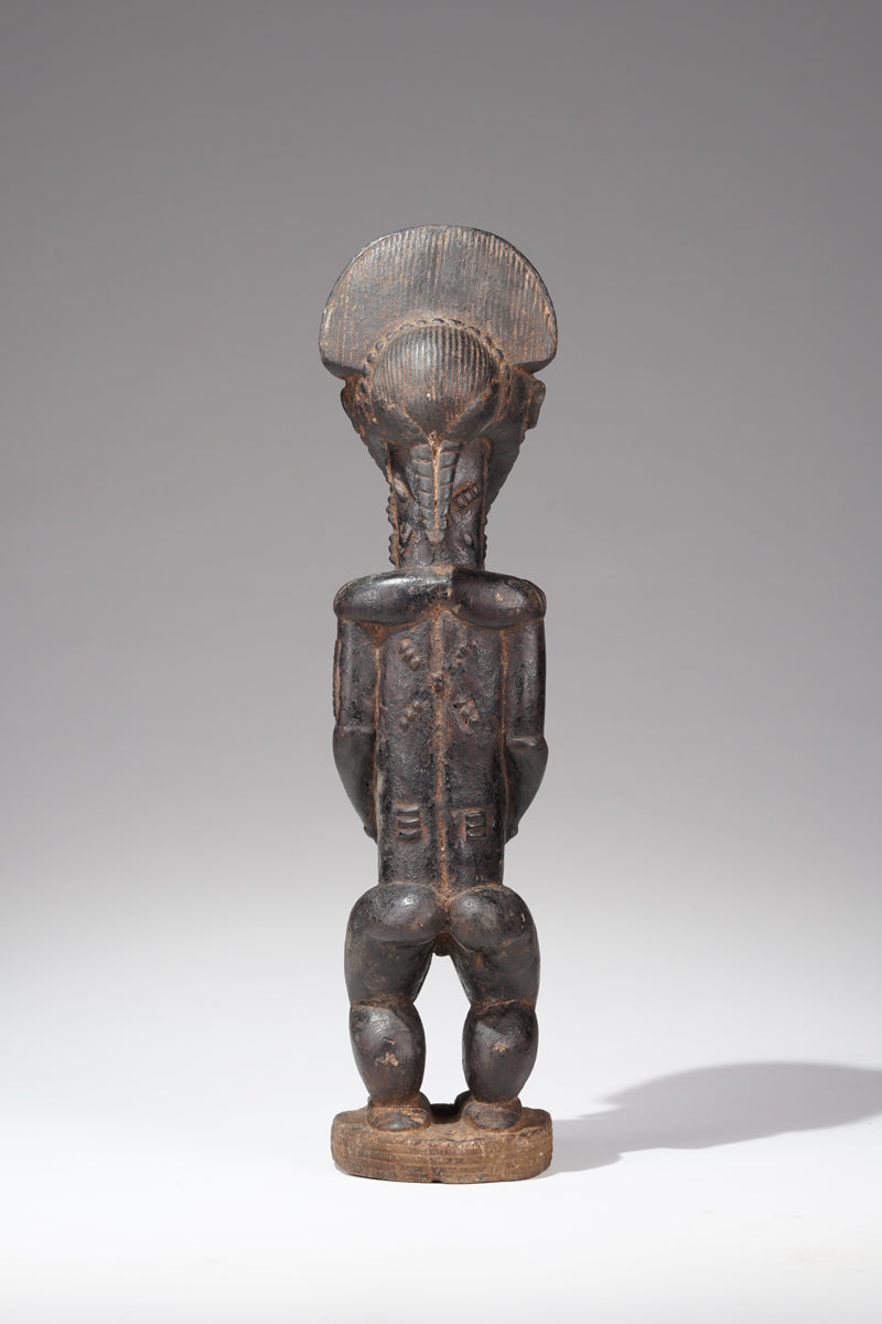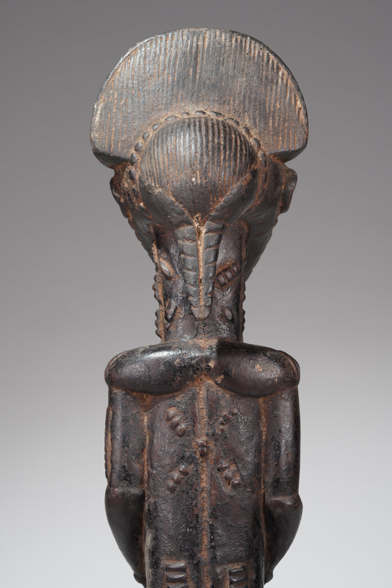 "To the Western eye, an essence of Baule style is a balanced asymmetry that enlivens while suggesting stability and calm. [...] To an art historian, the most consistent feature of Baule art, and one expressed across the wide variety of Baule object types, is a kind of peaceful containment. Faces tend to have downcast eyes and figures often hold their arms against the body, so that Westerners might feel that the mood of much classical Baule art is introspective." Susan Vogel.