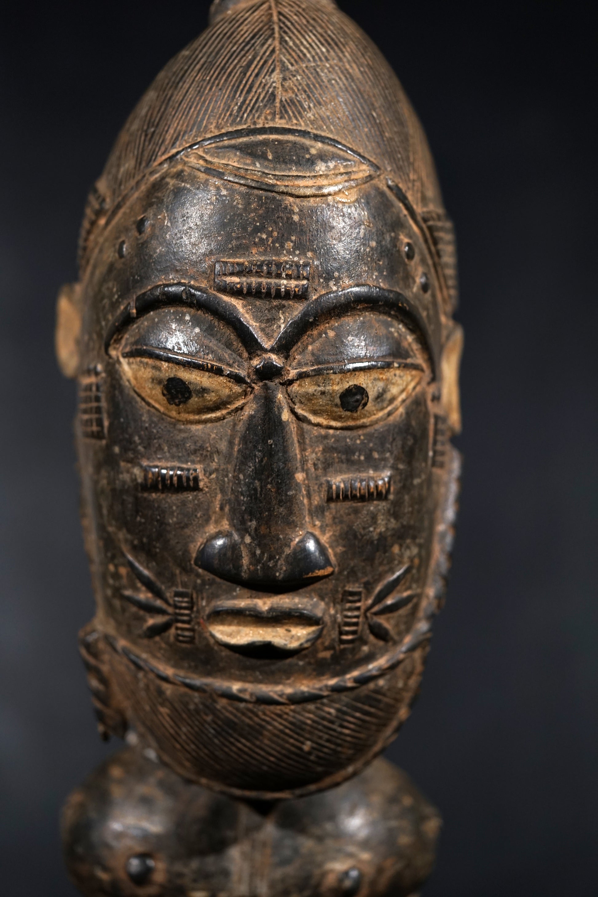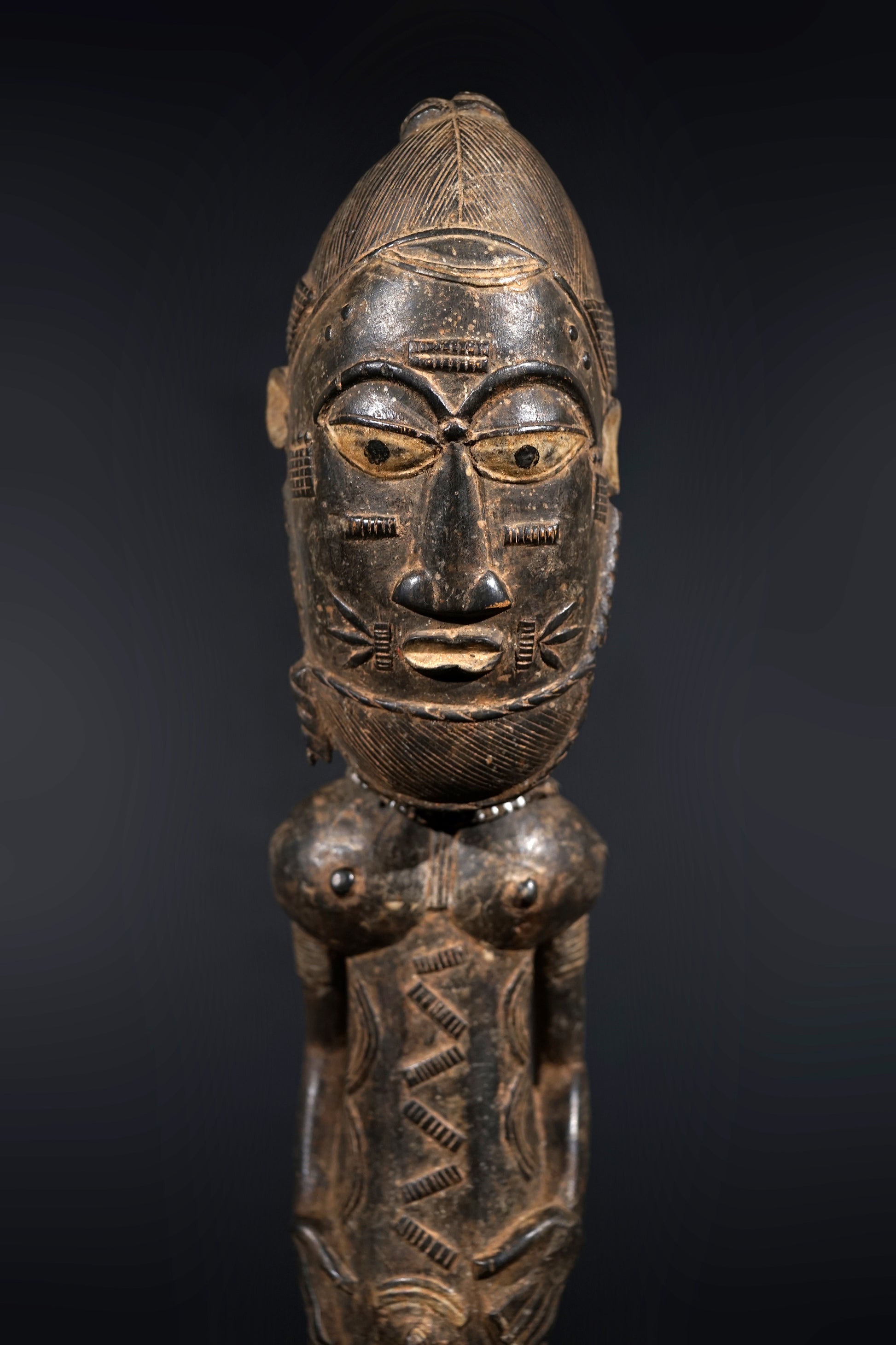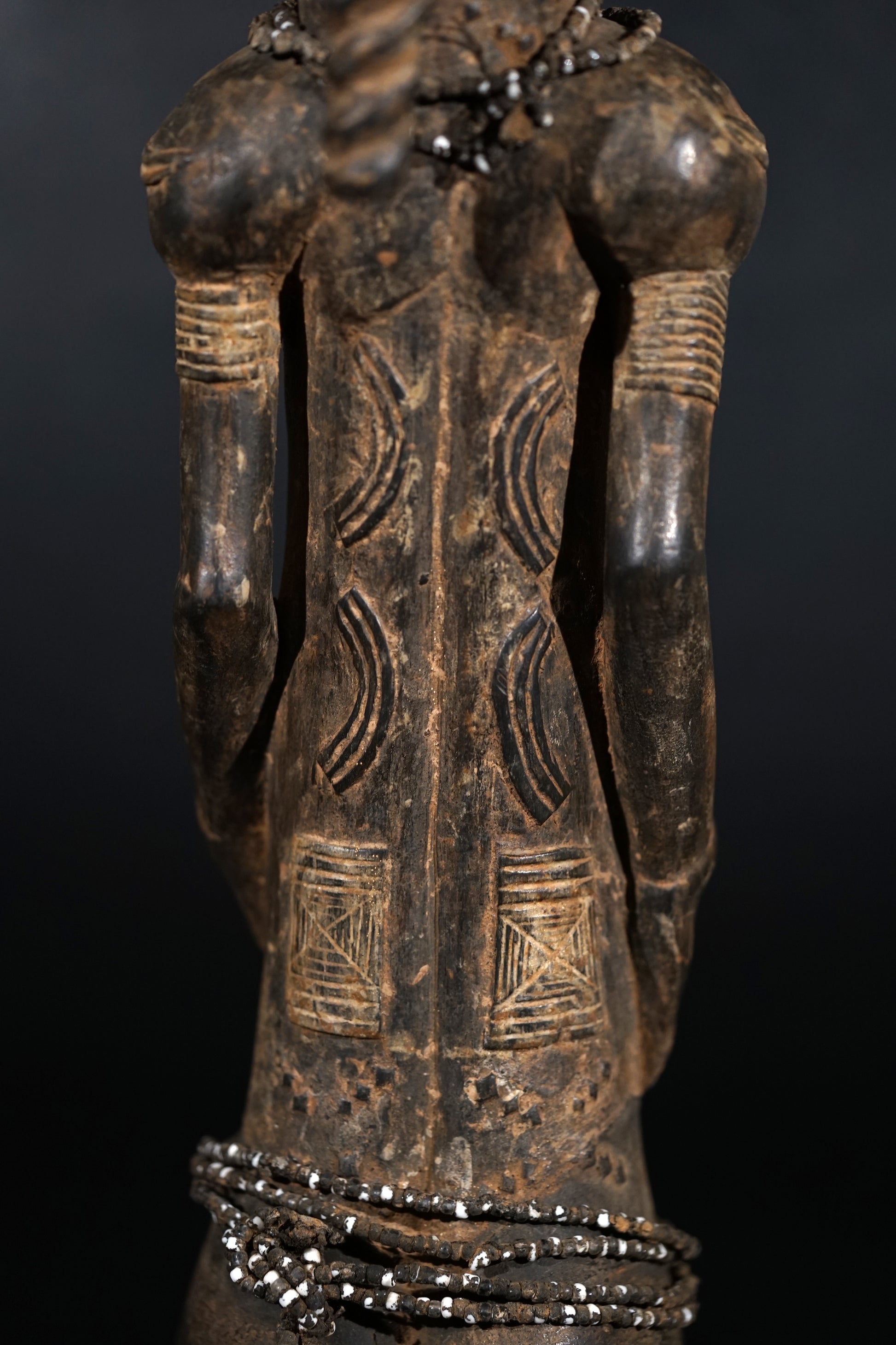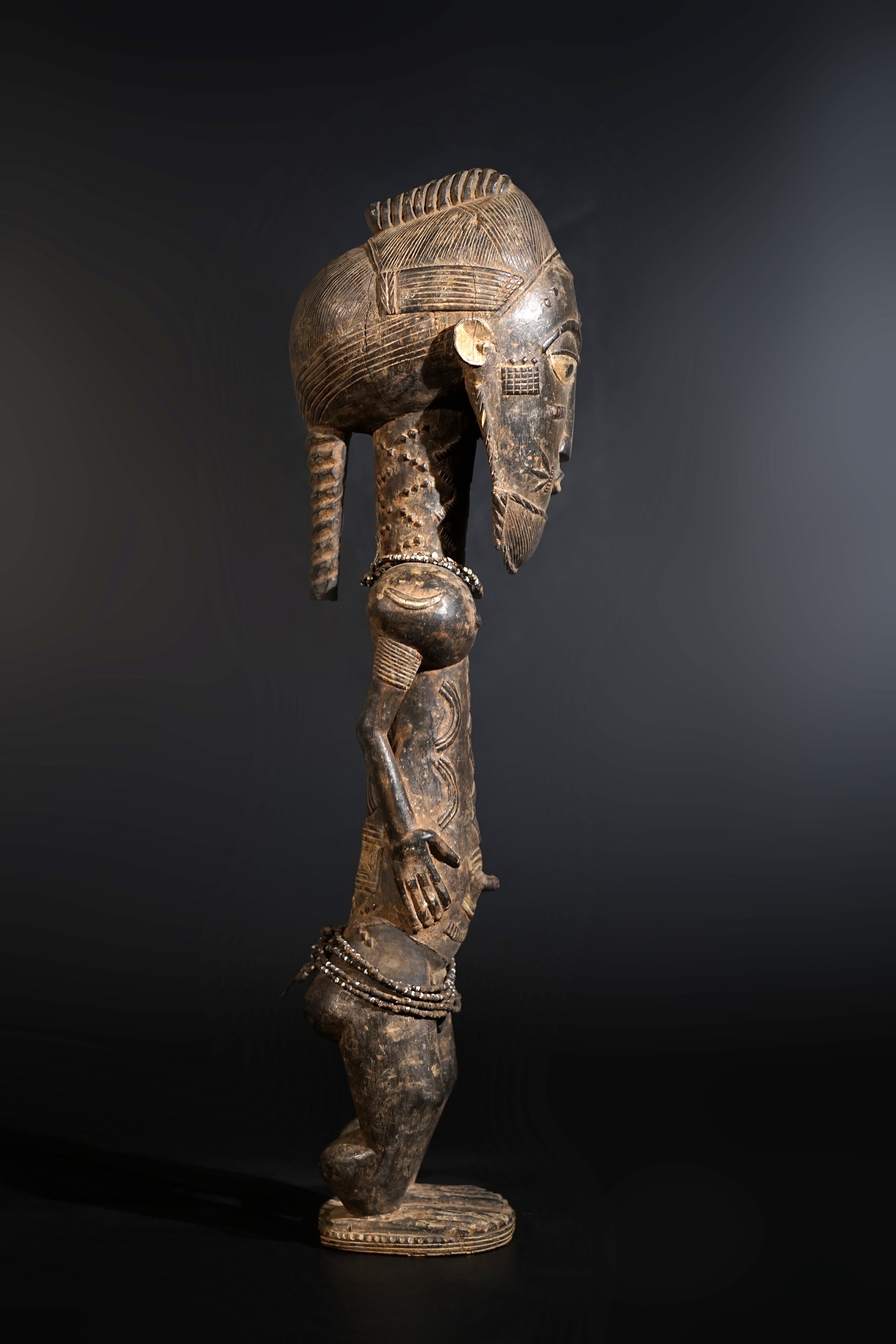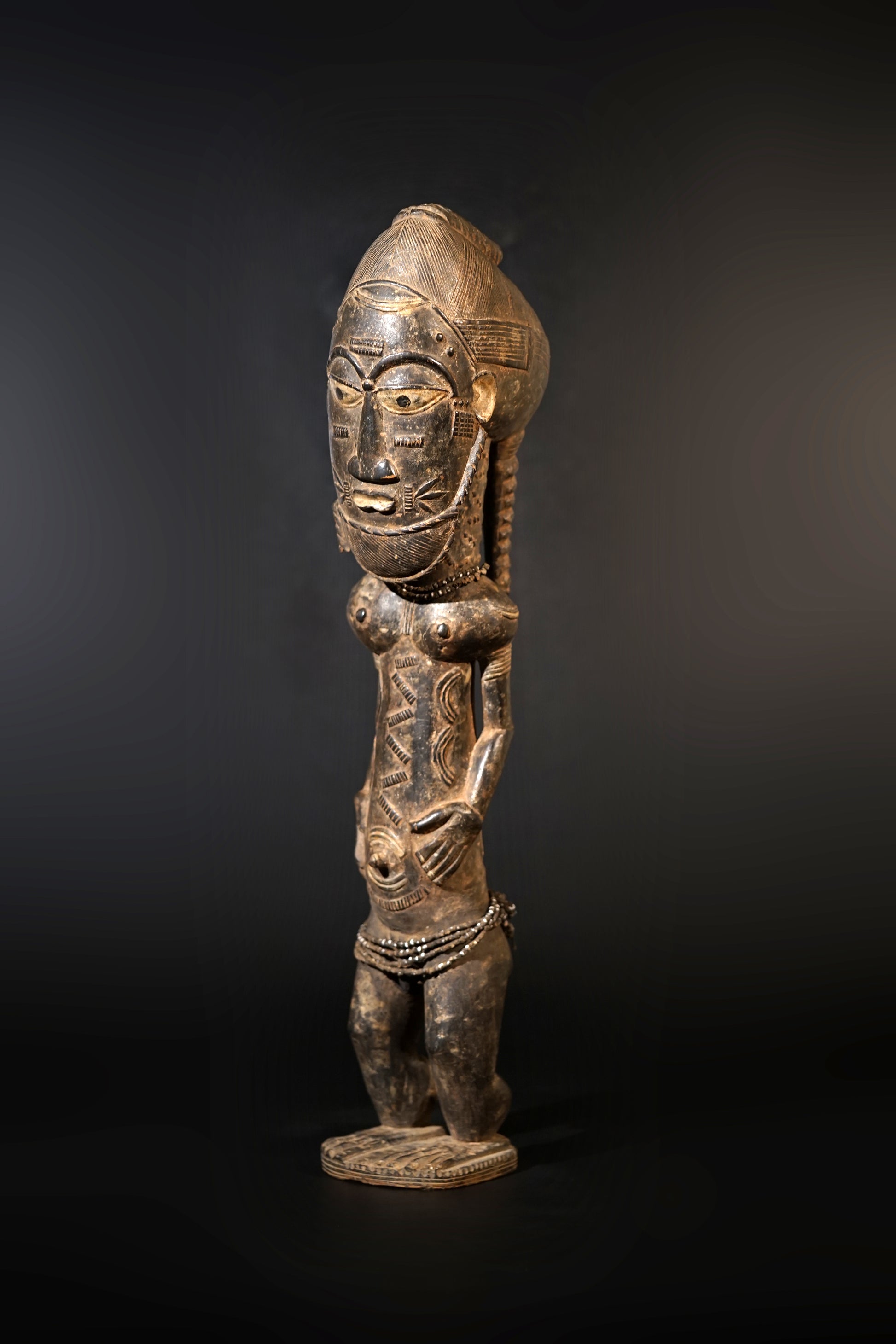 A male Baule sculpture, from the region Sakassou, Ivory Coast, standing on a base, the delicate feet and elongated toes supporting muscular legs ending in prominent buttocks, wearing a string of beads encircling the hips, a slender torso with a pointed navel, rounded strong shoulders leading to arms carved close to the body, the hands touching the abdomen, wearing rings on each upper arm, emphasized shoulder-blades, notched back line, the torso is decorated with varied geometric motifs on the front and the backside, around the elongated neck wearing a string of beads, an oval head, striated asymmetric beard, a slightly open mouth beneath a flattened triangular nose leading to high arched brows which are connected in the middle by a scarification mark, large, heavy-lidded almond-shaped eyes with blackened pupils, further scarification marks on the face and the neck, the head capped by a domed striated coiffure with ponytails at the back of the head; brown patina with remnants of kaolin, traces of age and ritual use. Provenance M. Cabinet.