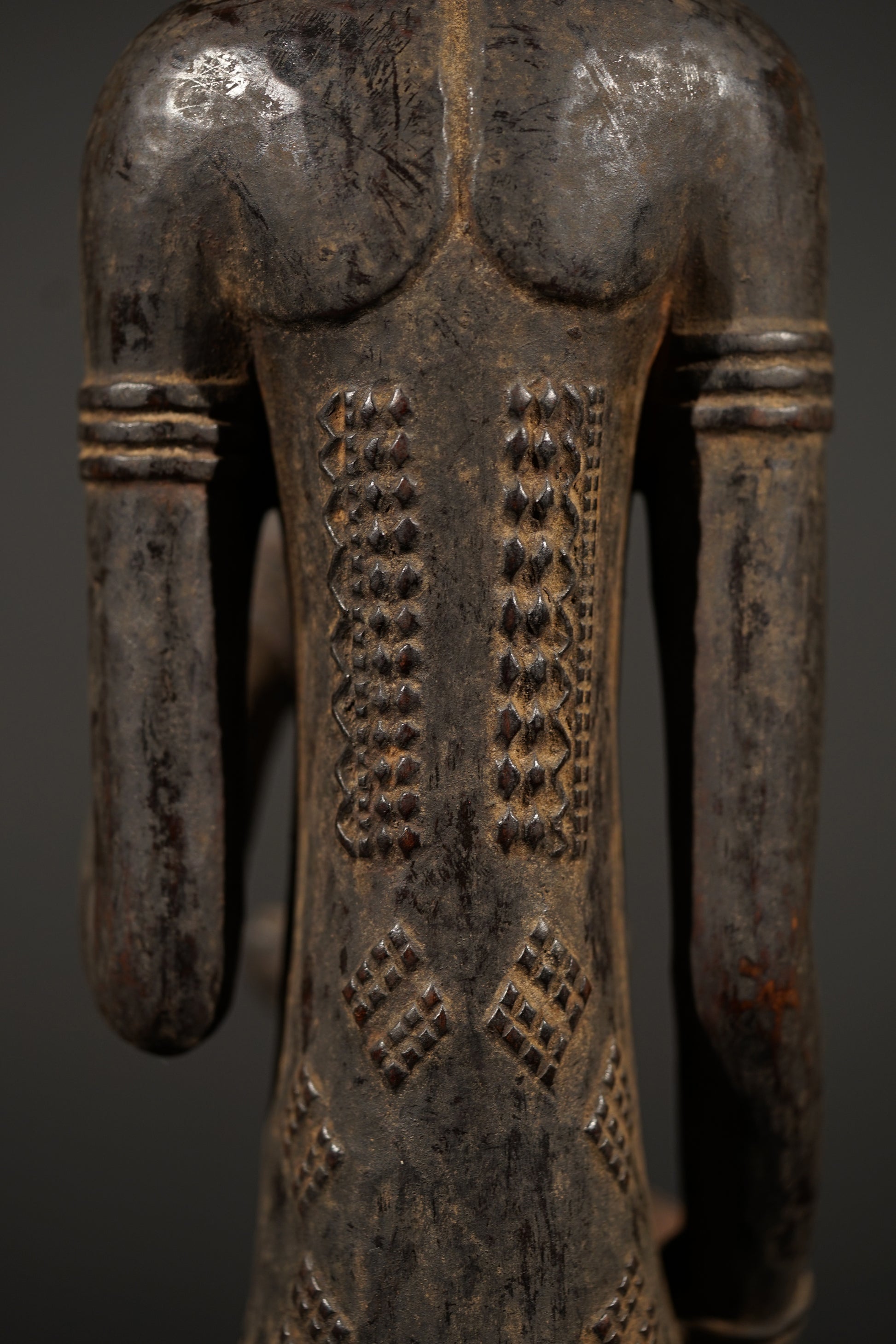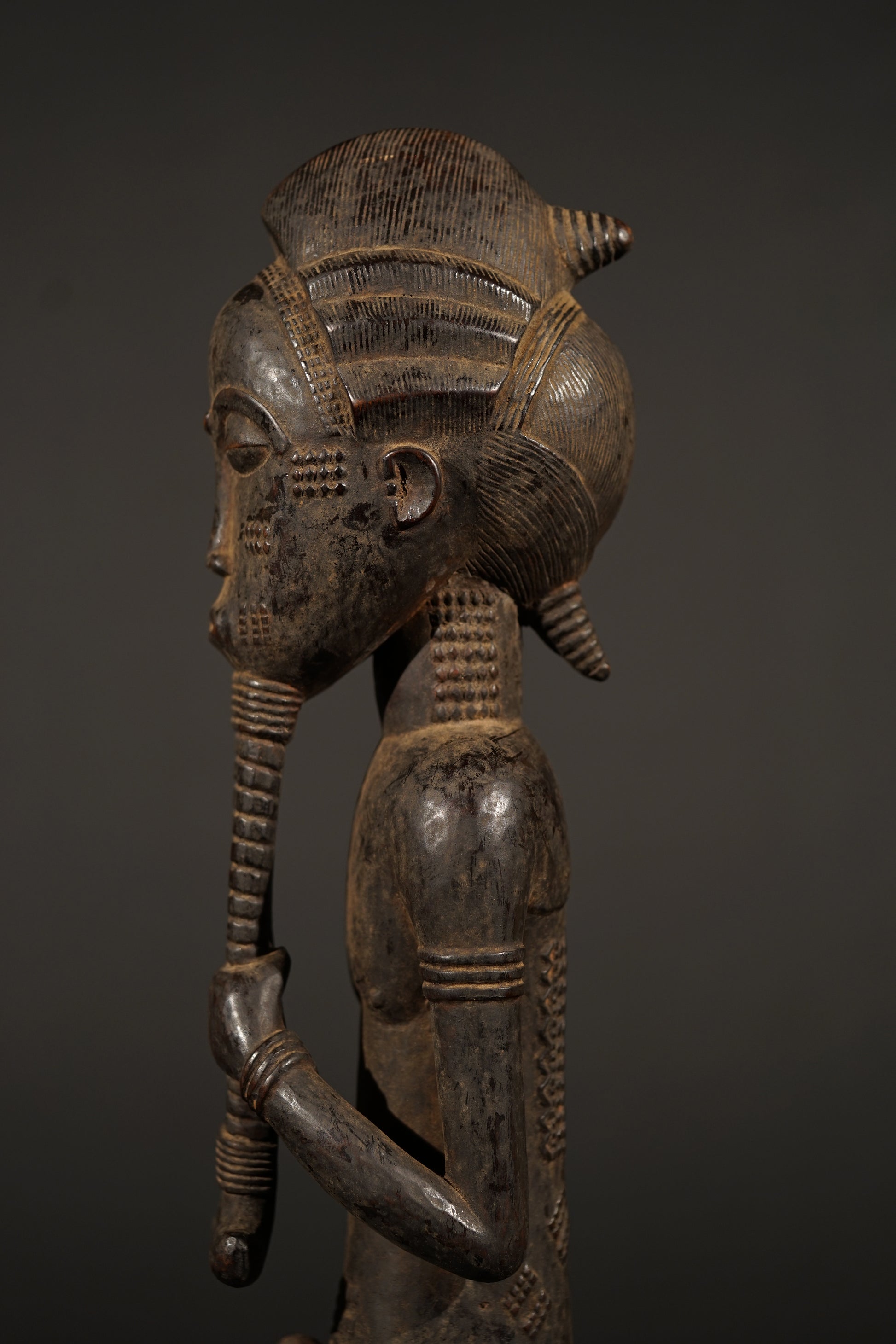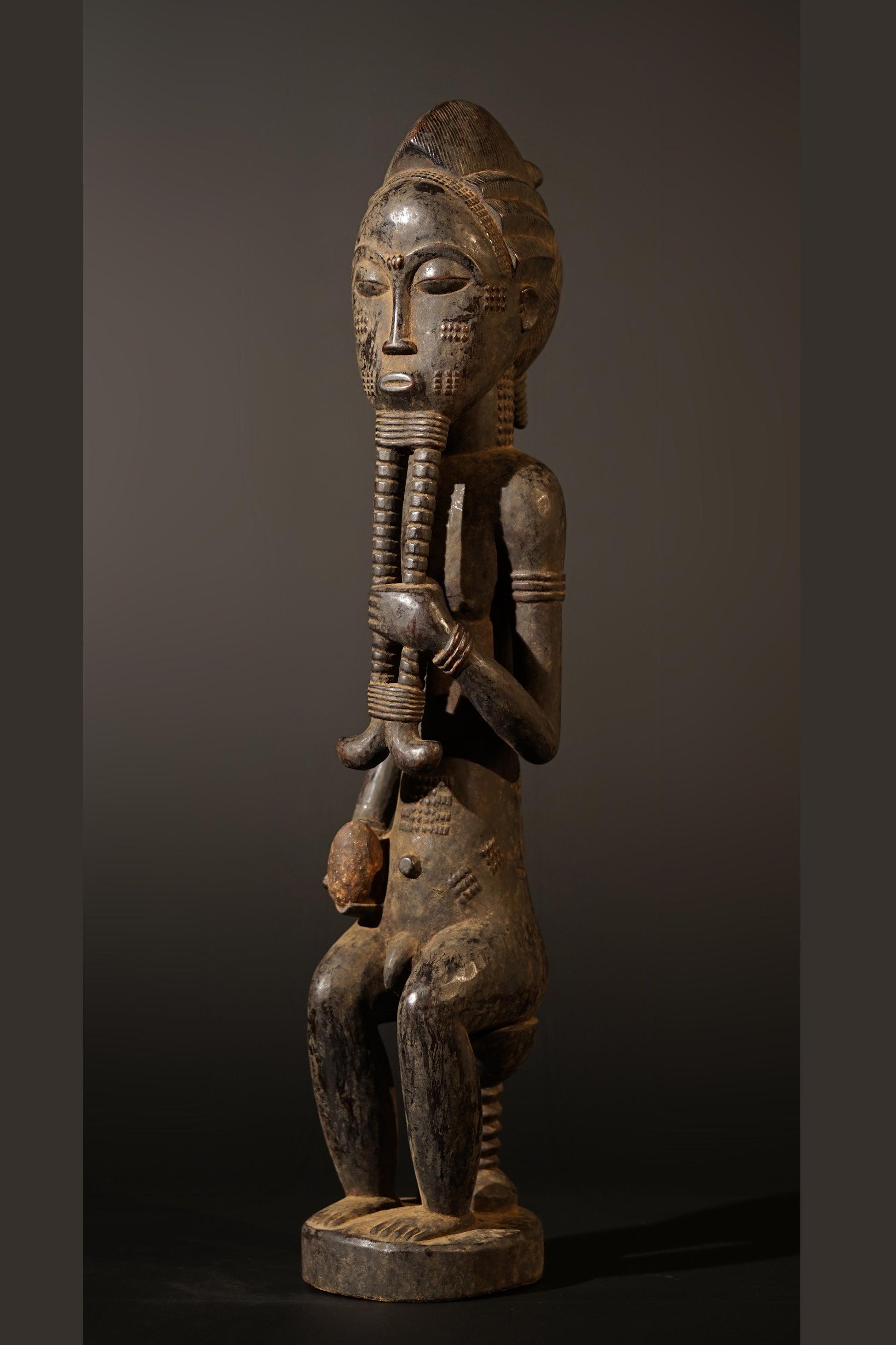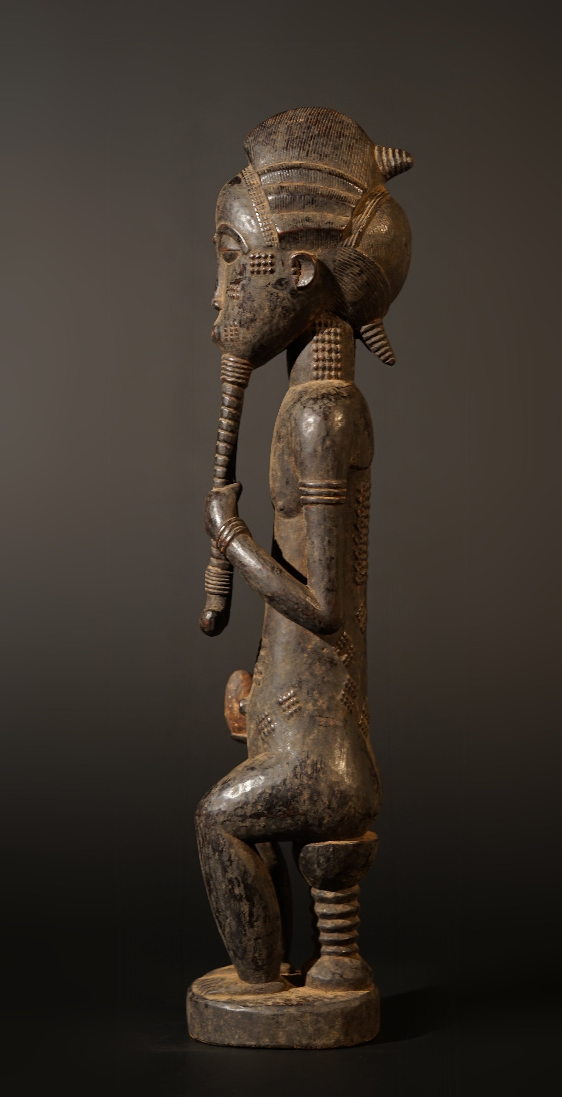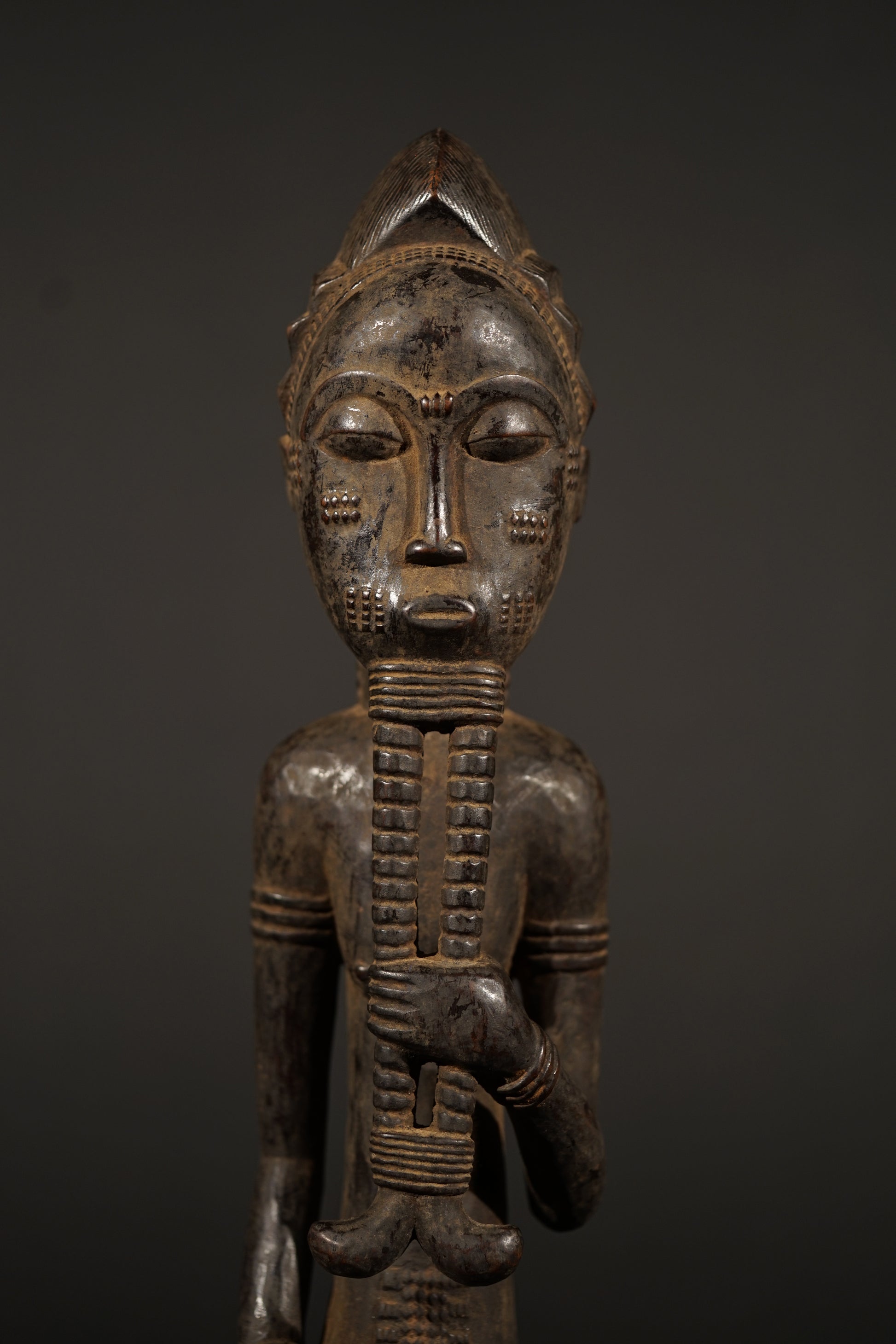 A male Baule sculpture of the Timbukro region, Ivory Coast, standing on a circular base, flattened feet, slightly bent legs, the arms carved close to the body with large hands touching the abdomen, the head with fine facial features, the oval eyes surrounded with kaolin, the forehead with rows of scarifications, a domed, fine striated coiffure, blackened patina; provenance Abdu Barré (Ousmane) Lomé.