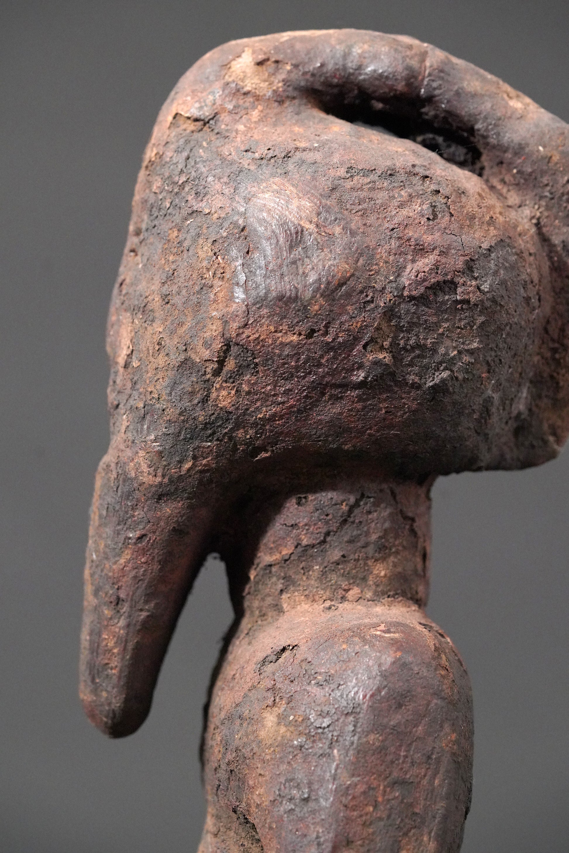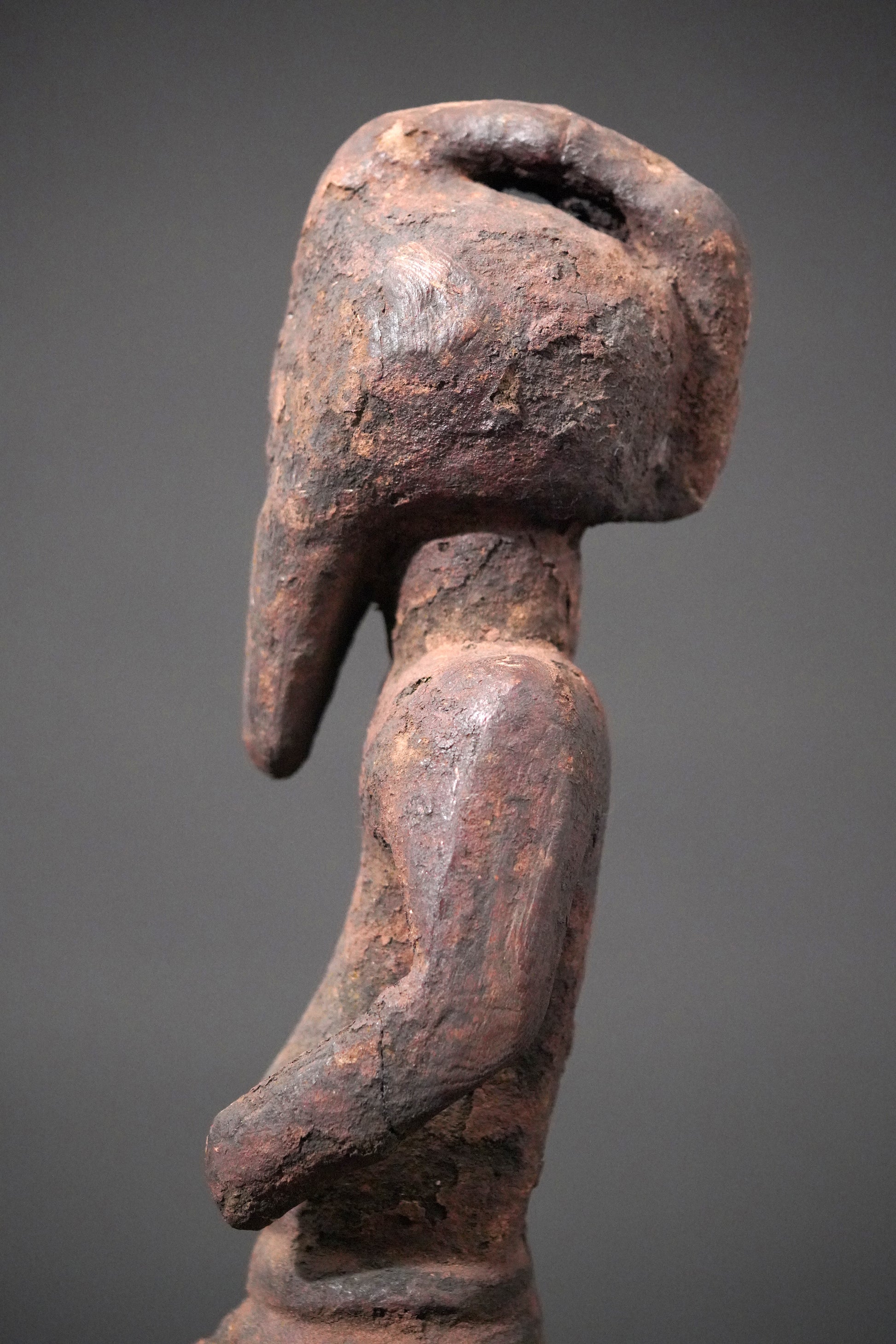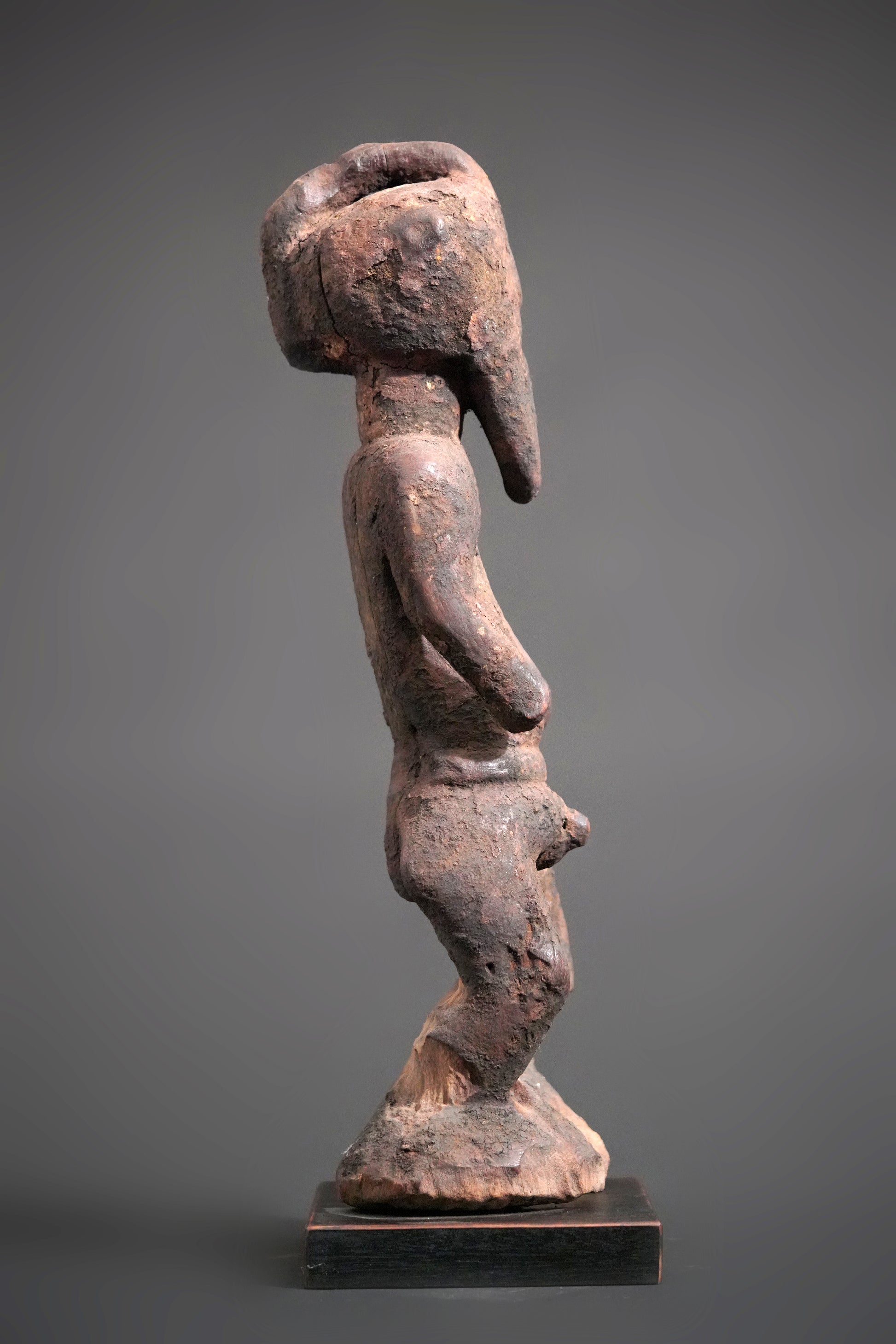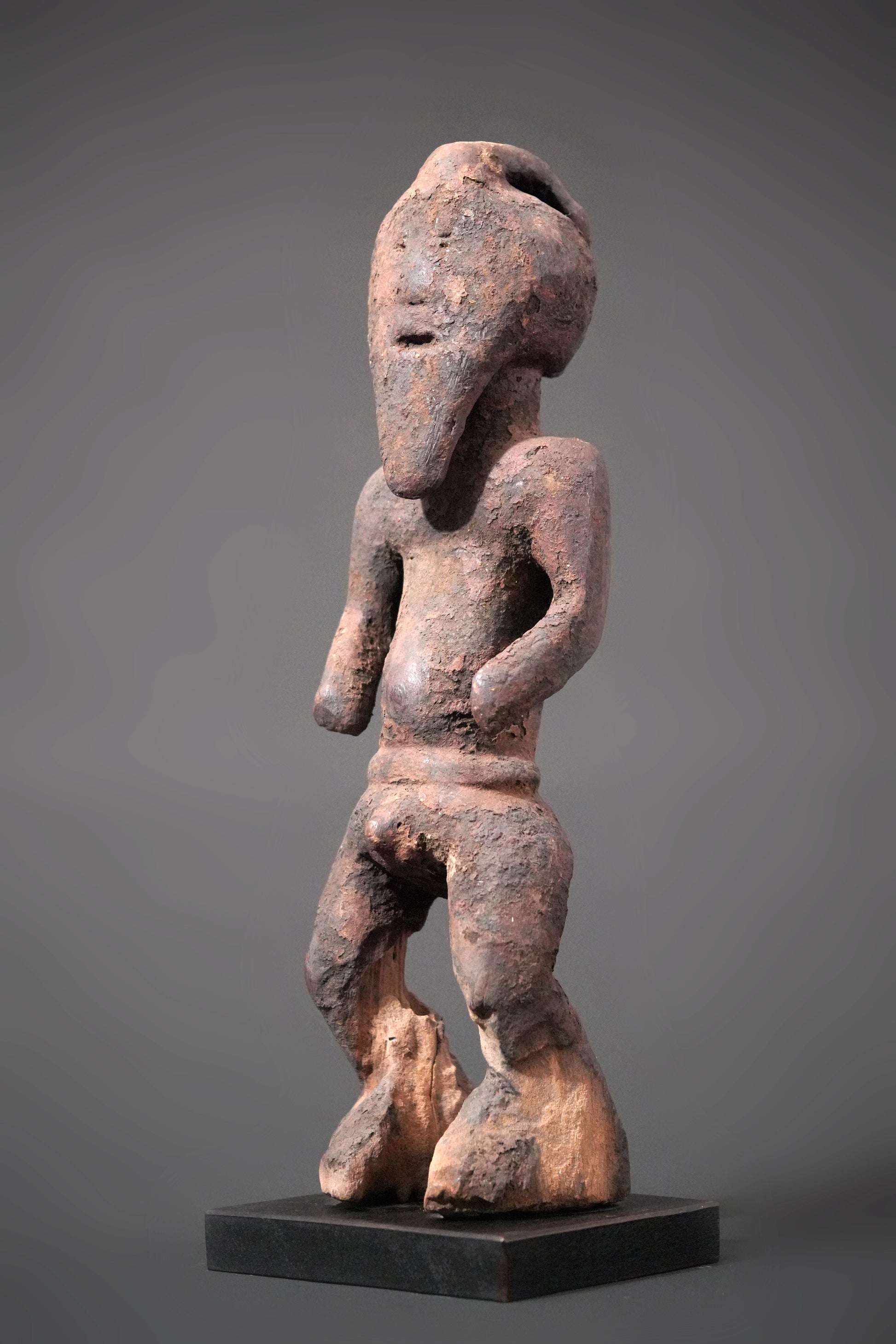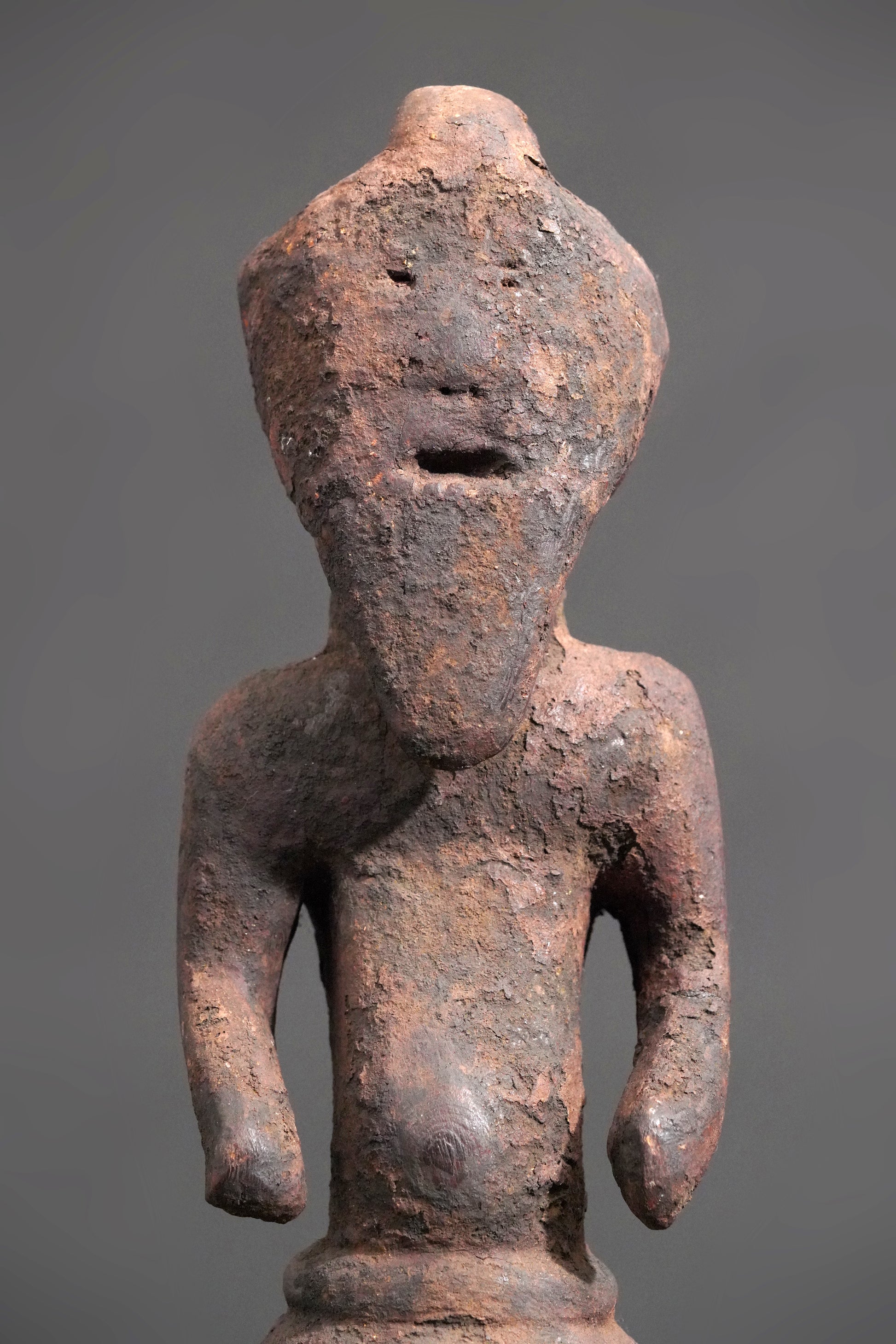 A male Keaka sculpture stylistically highly abstracted, standing on very robust, large feet, the legs slightly bent, arms slightly angled, the face triangular, merging into a beard, mouth, eyes and nose only indicated by minimal openings, on the head the suggestion of a coiffure by a handle-like form; dark patina with heavy encrustations.