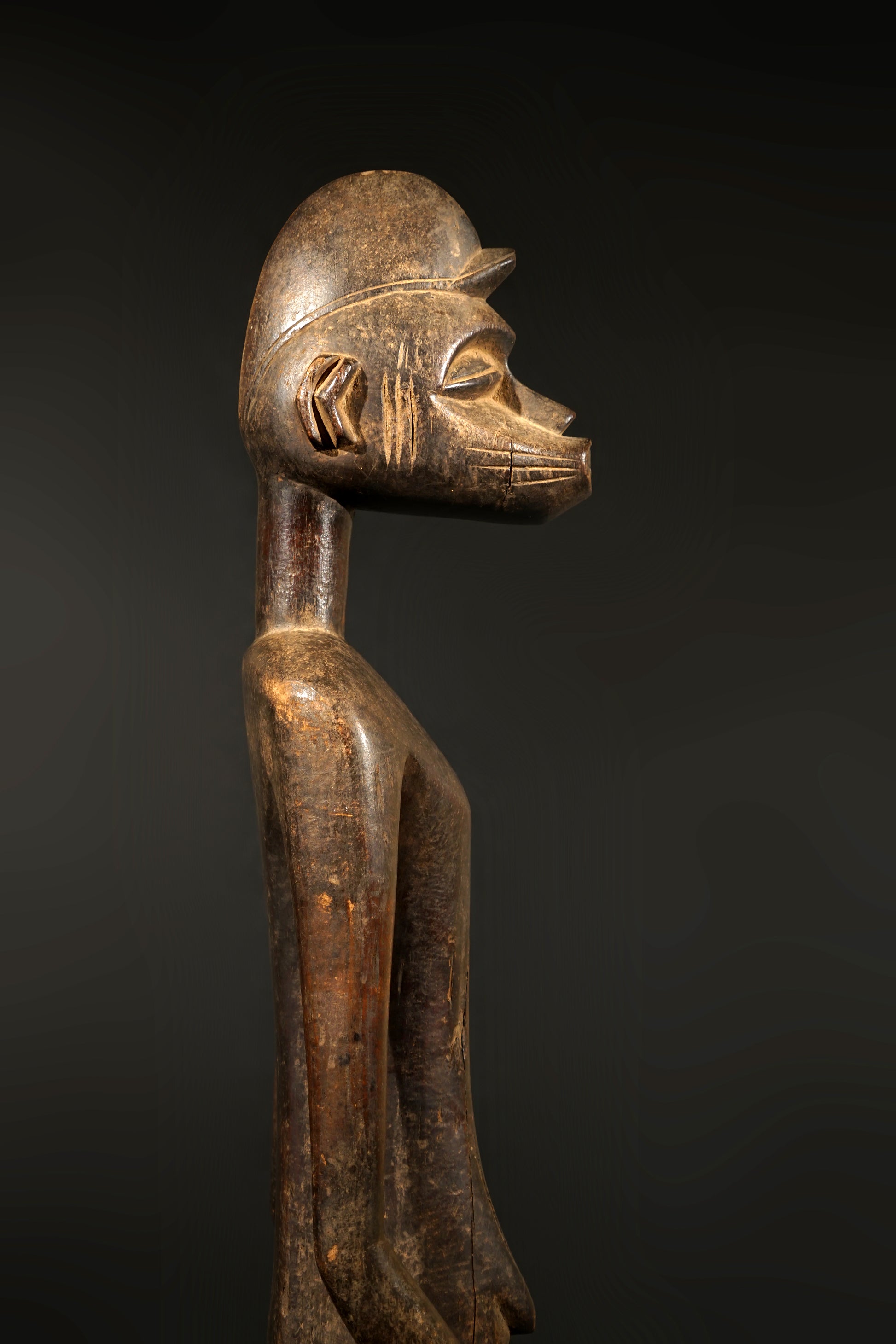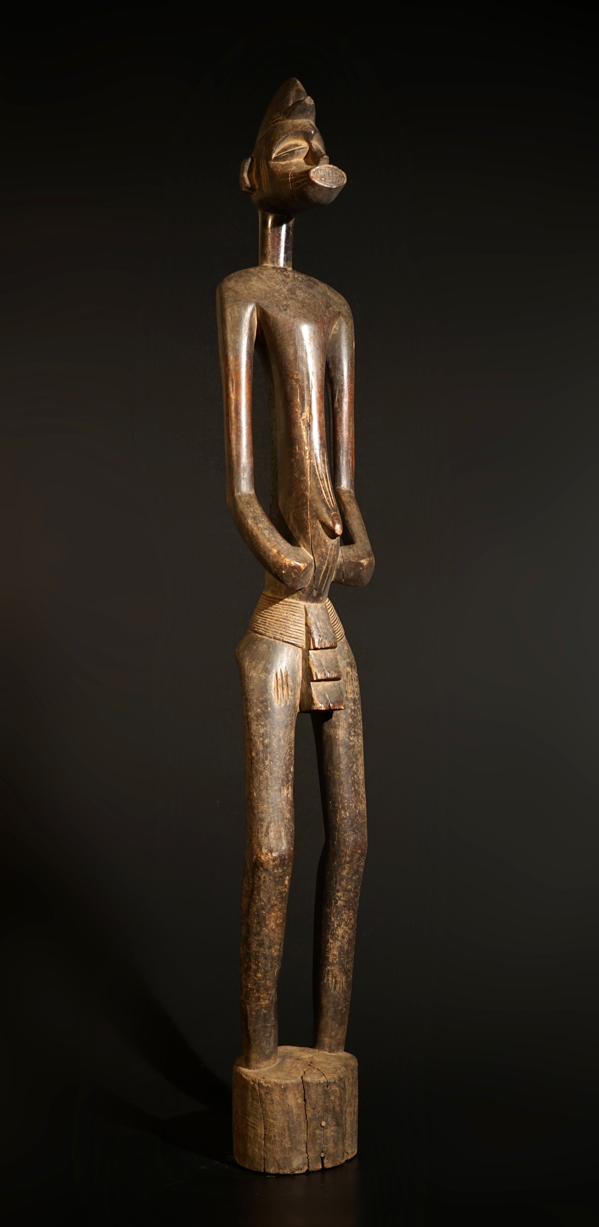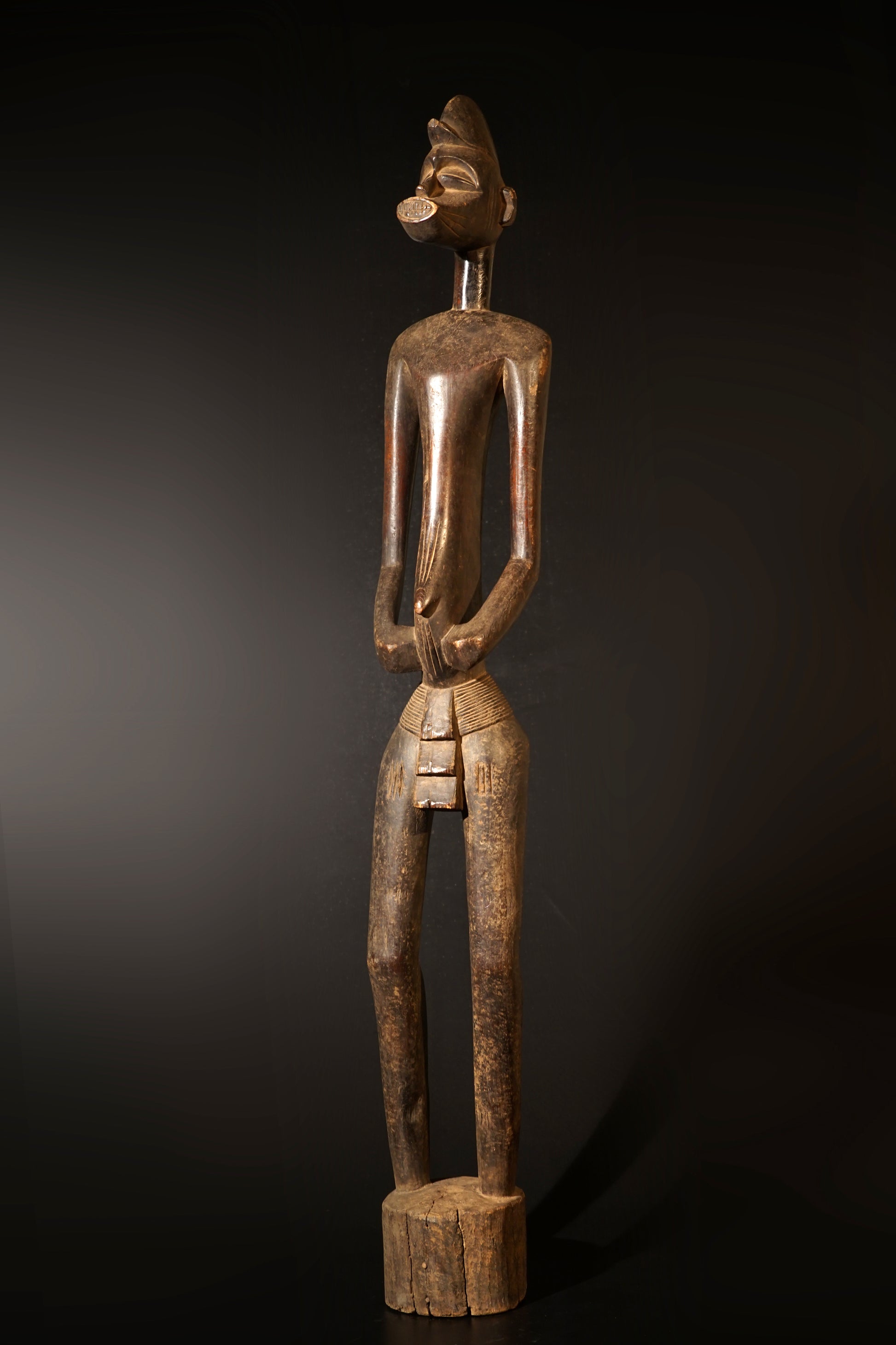 A male Senufo Rhythmpounder (Déblé), provenance close to Boudiali, village Nafou. Uprising from a cylindrical base with straight shortened legs, the openwork arms carved beside a slender body with a small pointed navel, the columnar neck supporting a zoomorphic head with a prominent jutting snout, wearing a domed single crested coiffure, scarification patterns around the navel; aged patina, the neck, the arms and the base of the statue with significant signs of use in form of an intensive touch-patina, the sculpture is still in the original condition like it was collected in situ, the base has several age-cracks but in general the sculpture is in good condition.