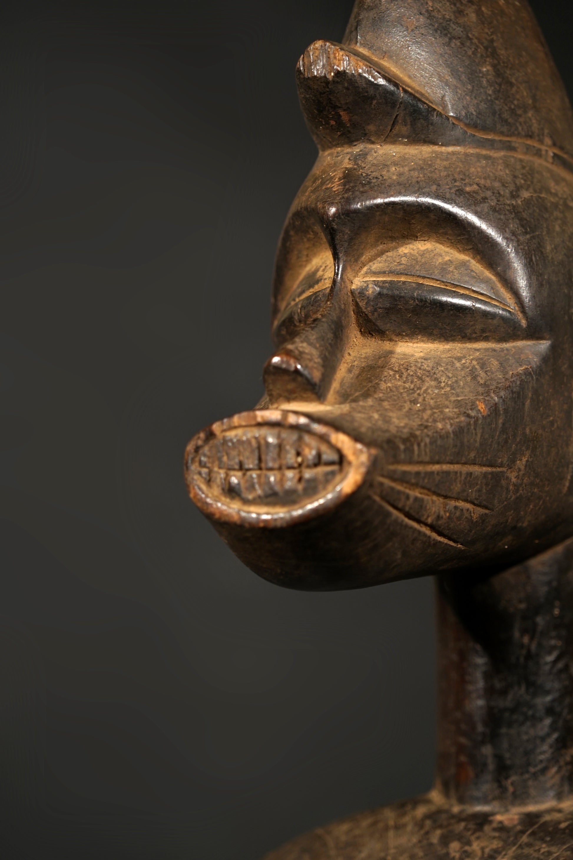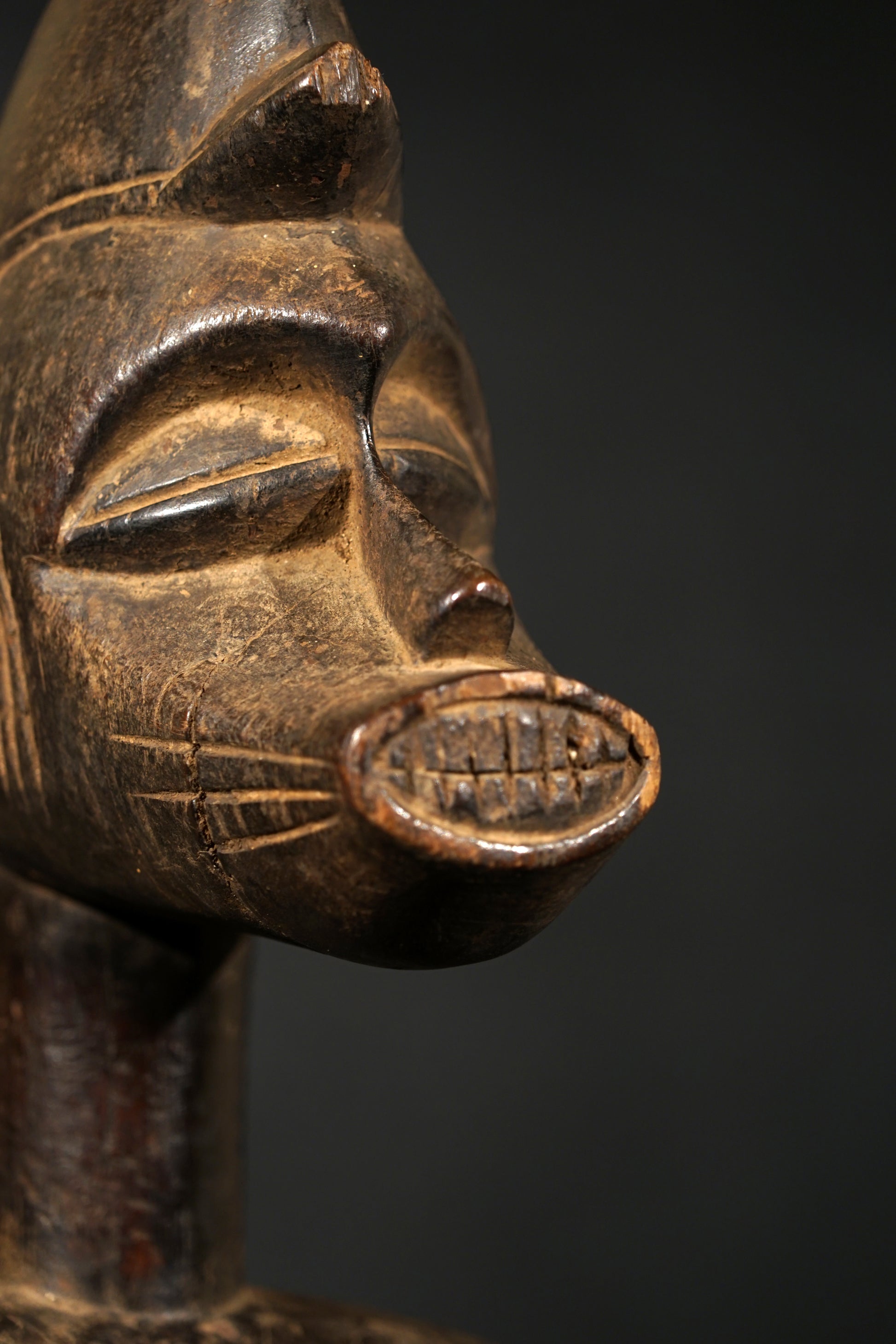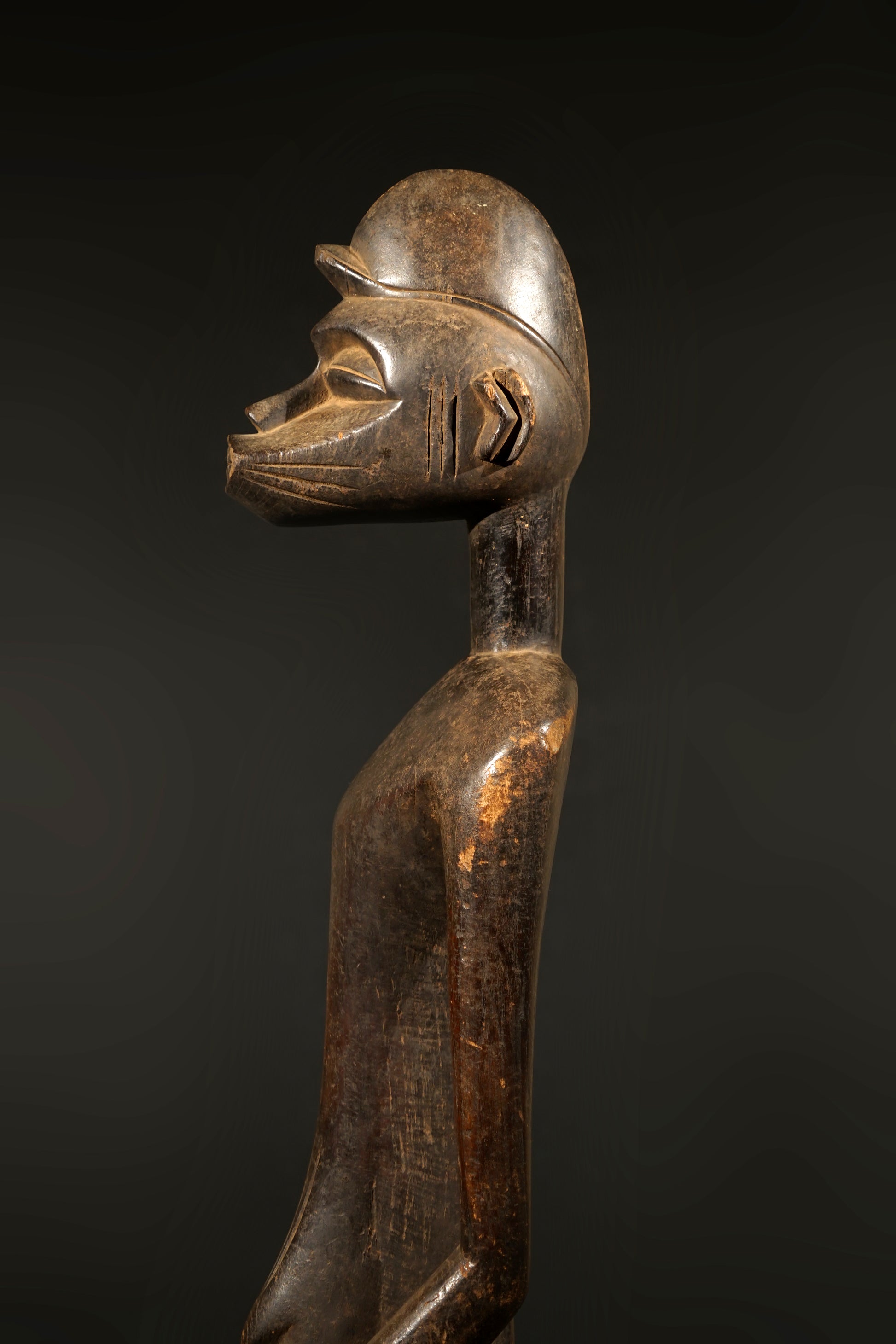 A male Senufo Rhythmpounder (Déblé), provenance close to Boudiali, village Nafou. Uprising from a cylindrical base with straight shortened legs, the openwork arms carved beside a slender body with a small pointed navel, the columnar neck supporting a zoomorphic head with a prominent jutting snout, wearing a domed single crested coiffure, scarification patterns around the navel; aged patina, the neck, the arms and the base of the statue with significant signs of use in form of an intensive touch-patina, the sculpture is still in the original condition like it was collected in situ, the base has several age-cracks but in general the sculpture is in good condition.