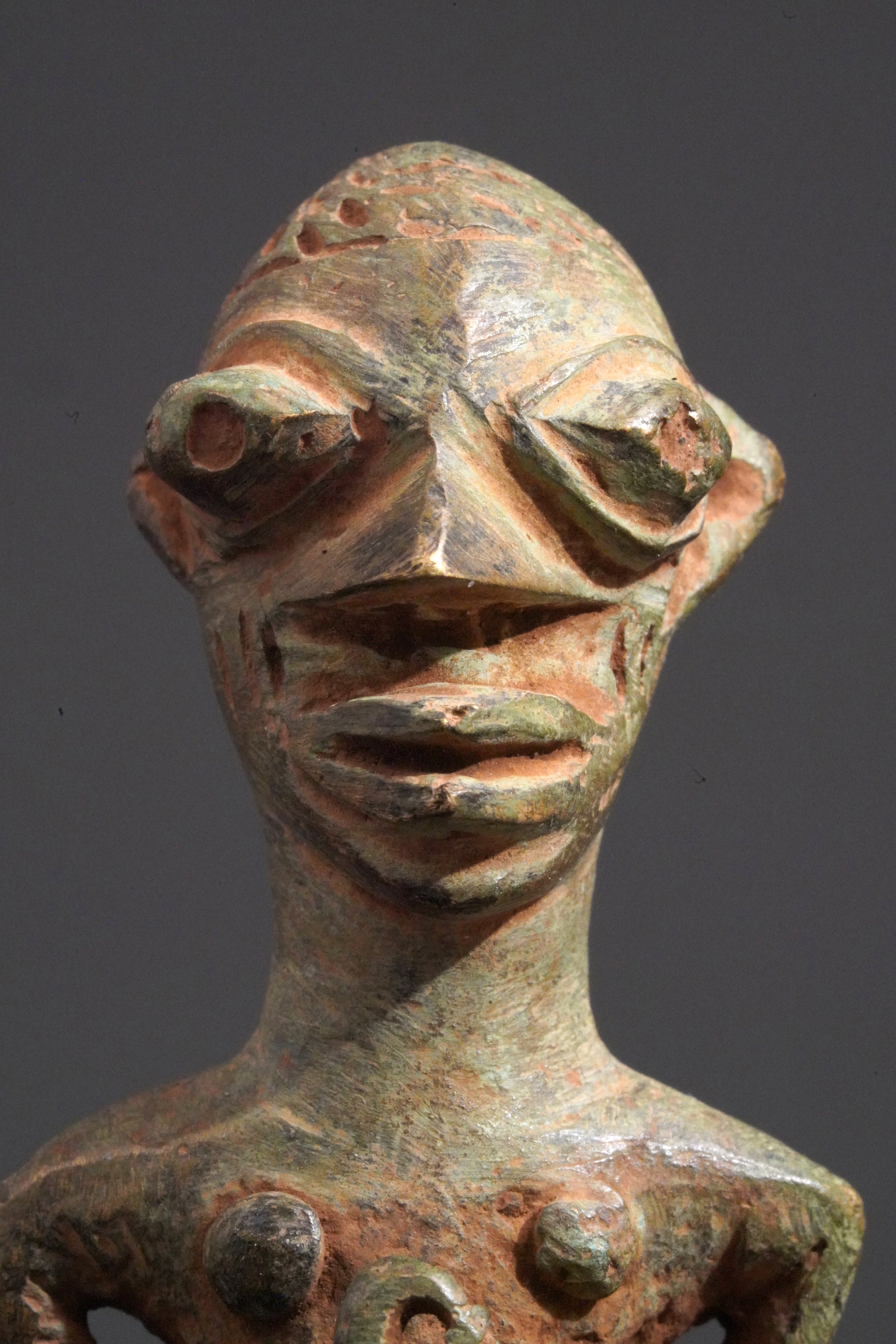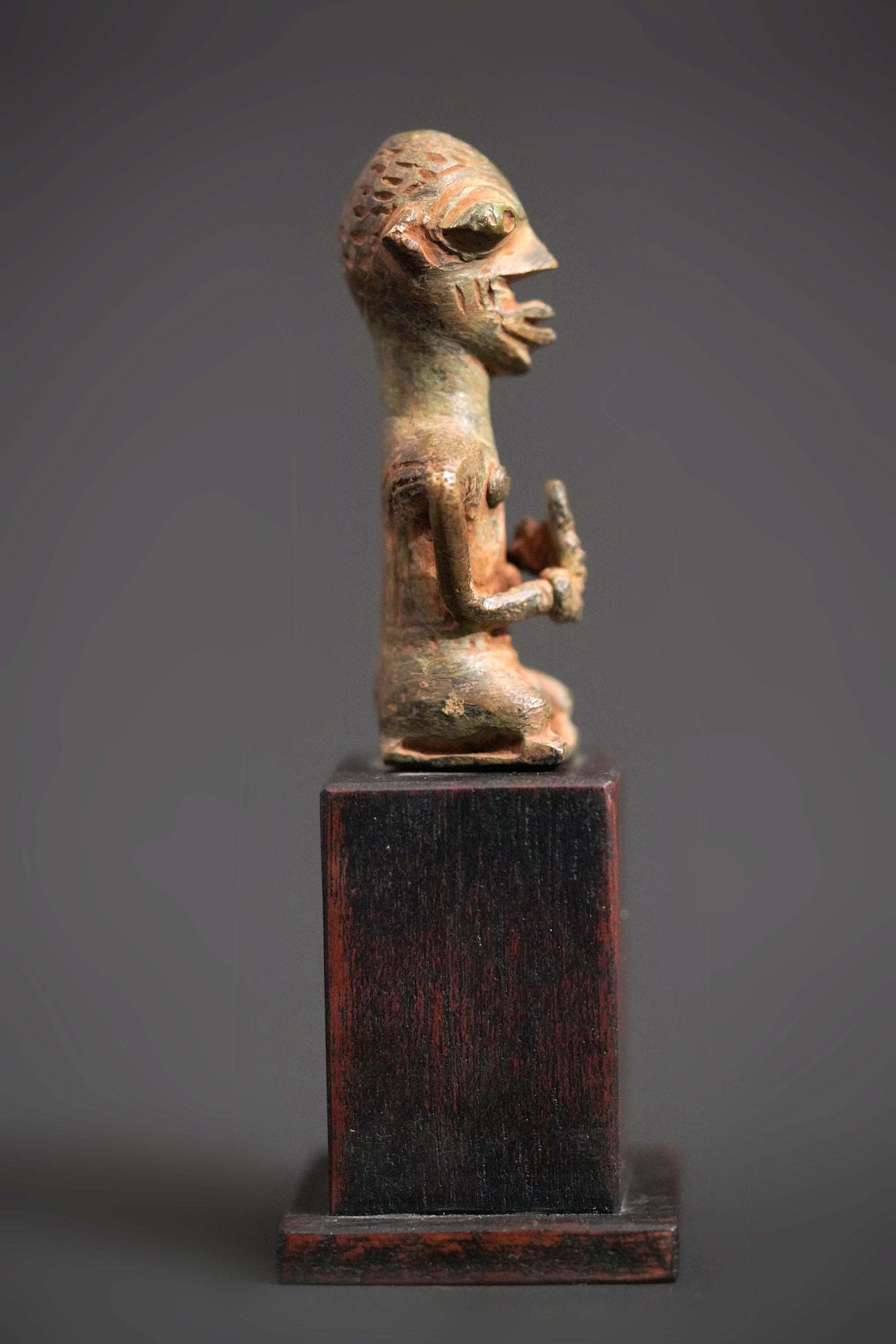 A male Yoruba metal sculpture from Nigeria holding a devotional or medicine vessel in his hands, sitting on his legs, large head with sharply cut facial features, large eyes and pointed nose; ochre-greenish patina.
