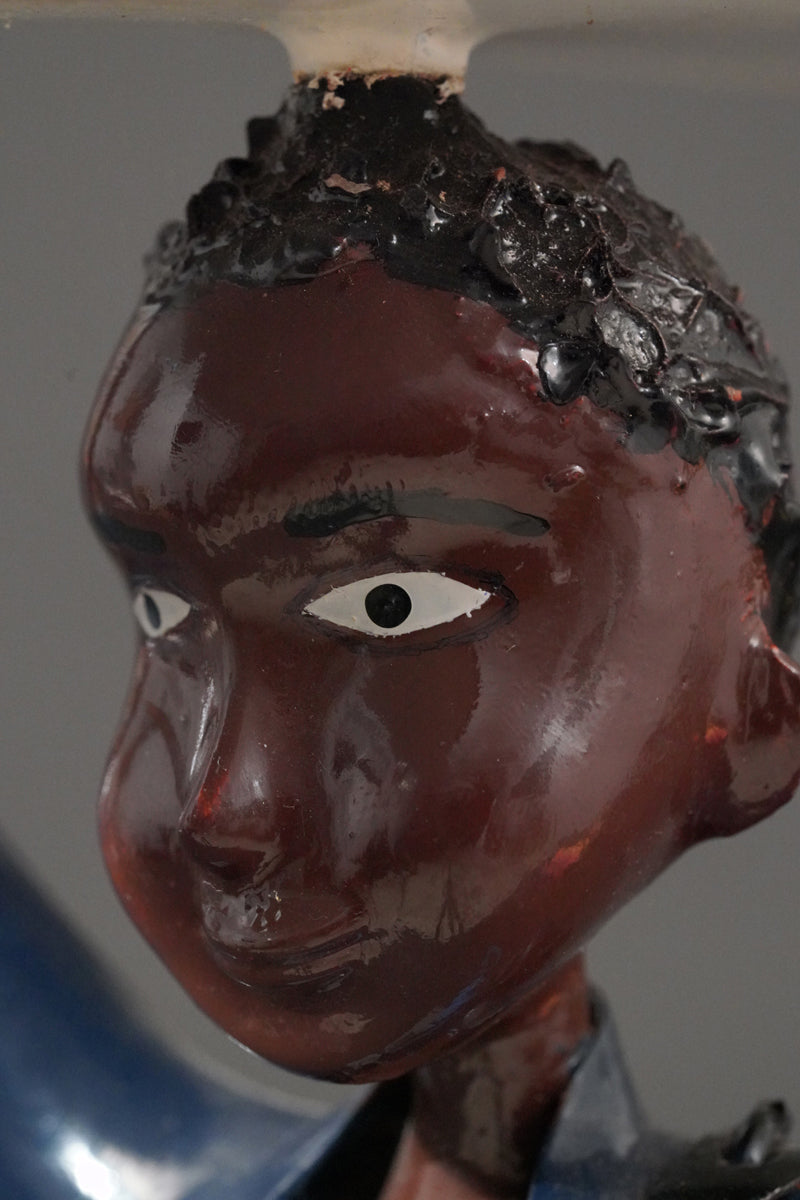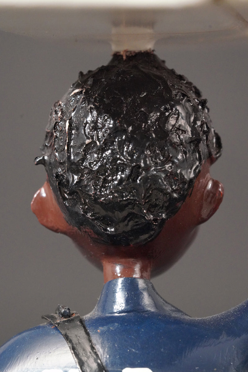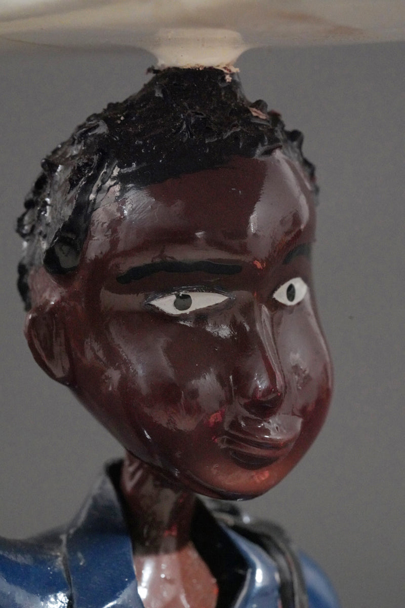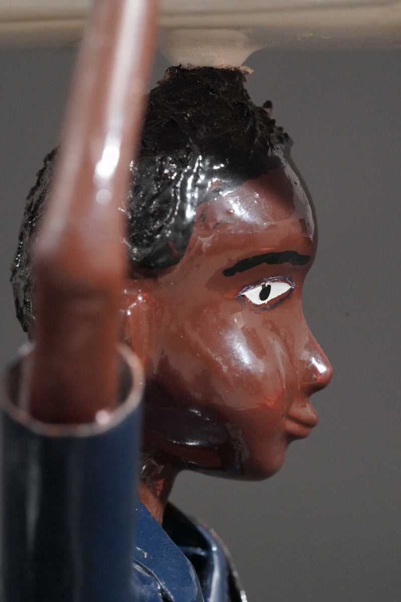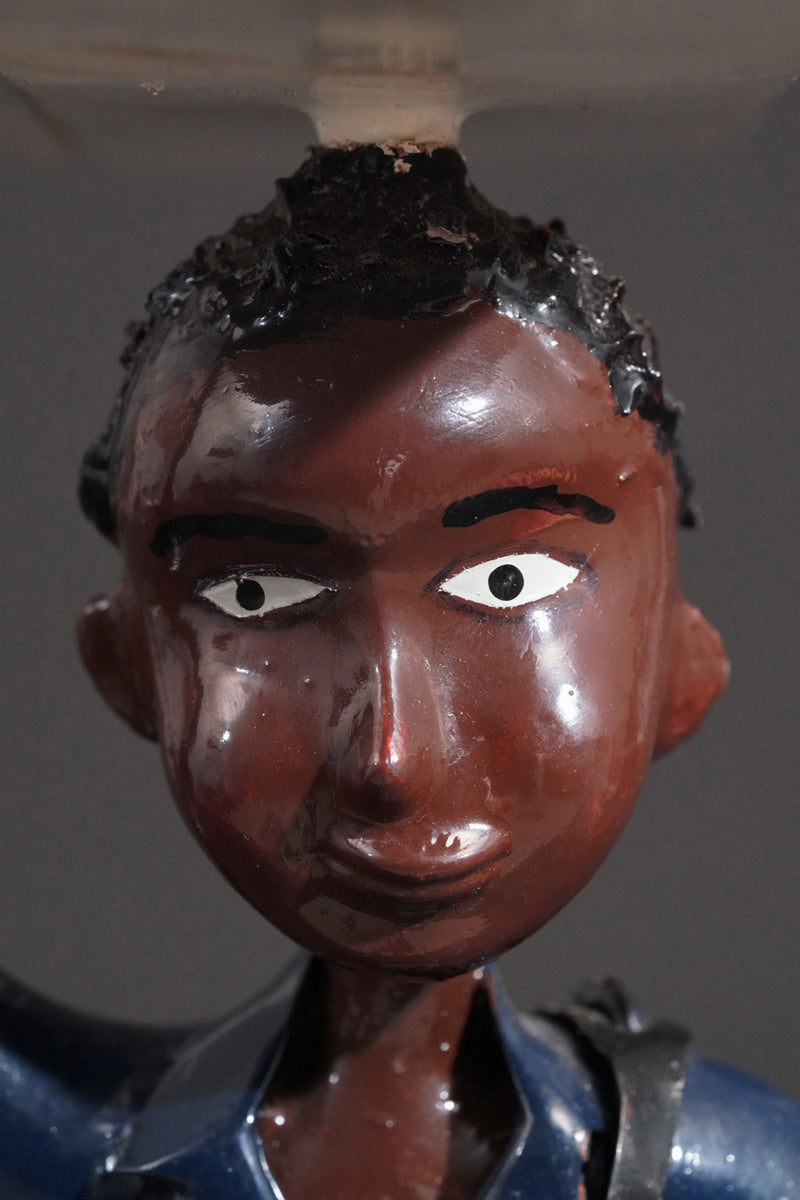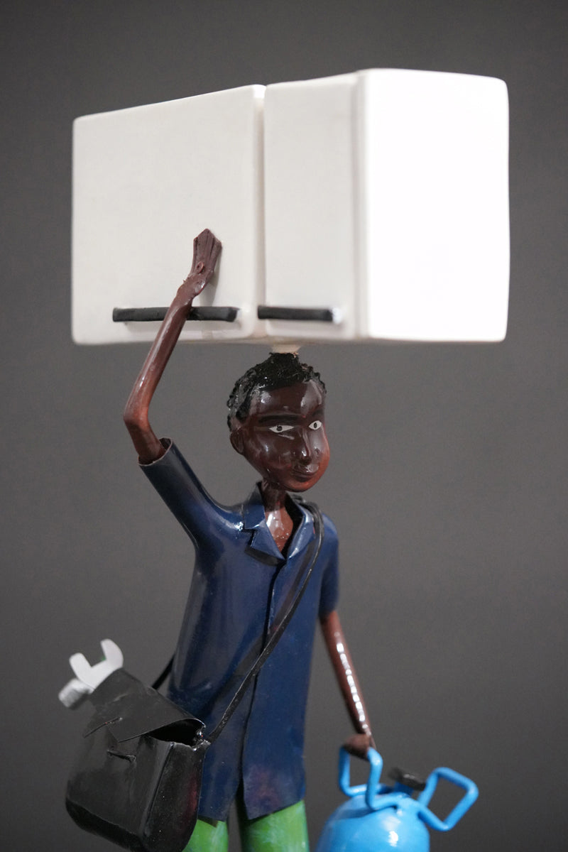 "A Mechanic with a Fridge, Tools, and Gas Bottle"*, by Didier A. Ahadsi. An African fitter on a gray pedestal carries a refrigerator on his head and holds it in his right hand. In his left he holds a blue gas bottle and a tool bag slung over his shoulder. (*The title is meant to be descriptive and not by the artist).